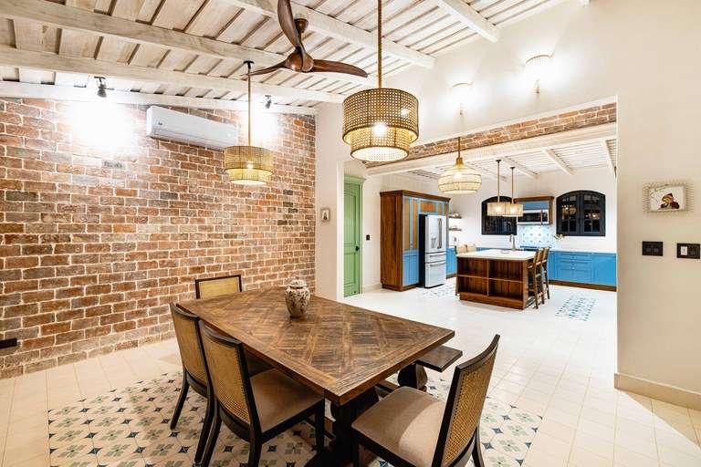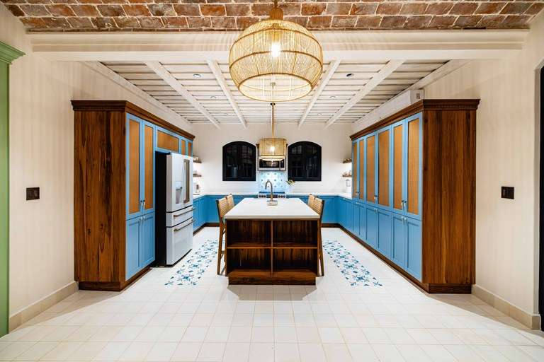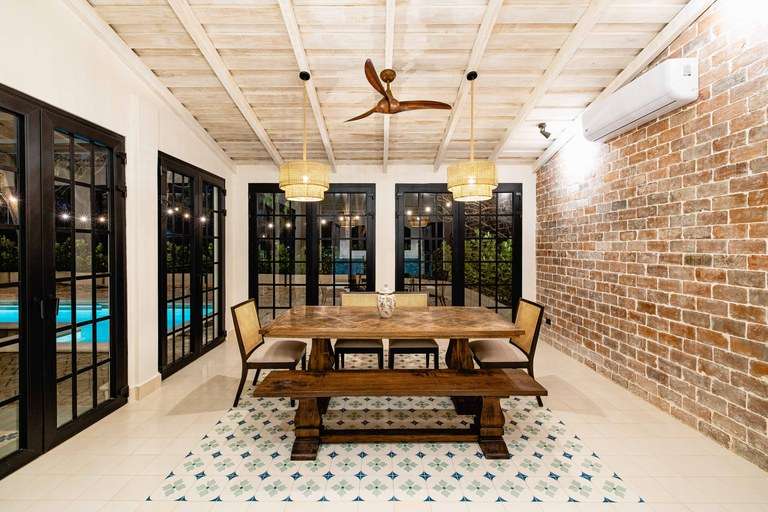 The open-concept living and dining areas flow seamlessly out to a covered terrace and private pool, creating the perfect setting for outdoor entertaining or peaceful afternoons in the sun. The gourmet kitchen is well-appointed, with quality finishes and ample space for preparing meals with family and friends.
