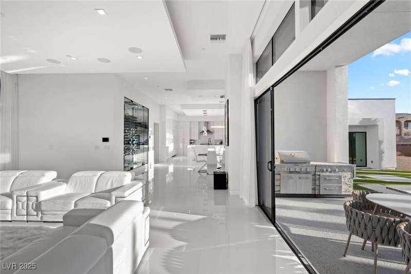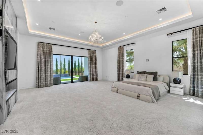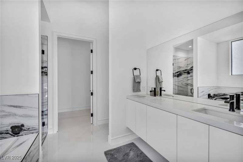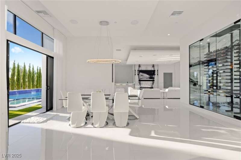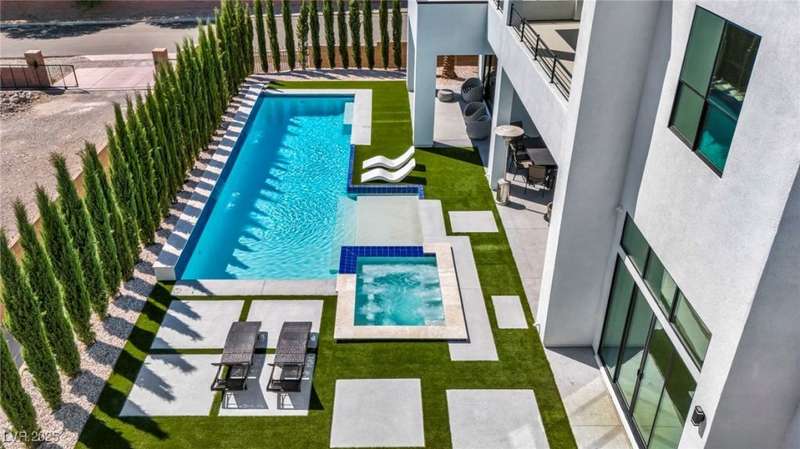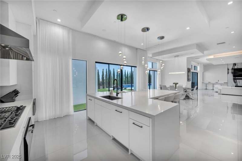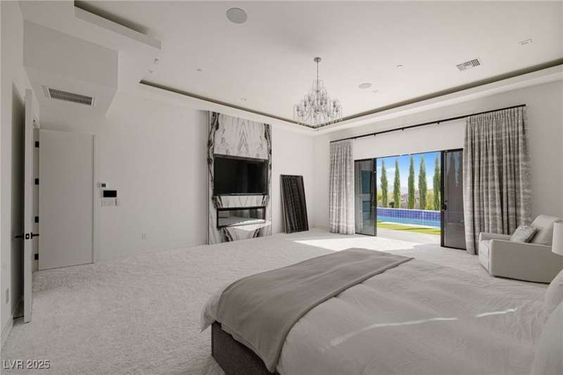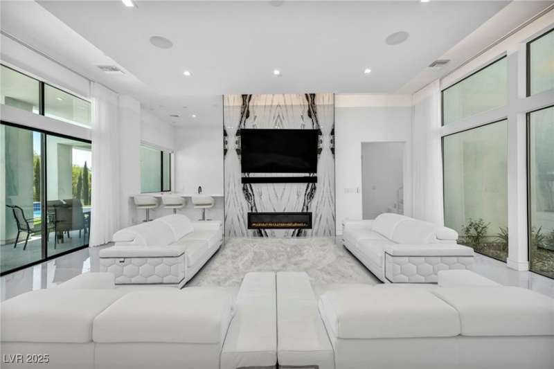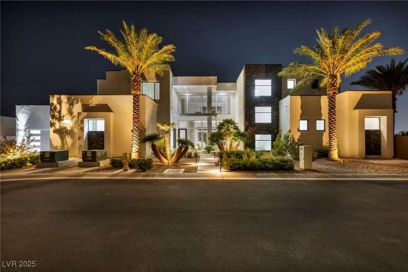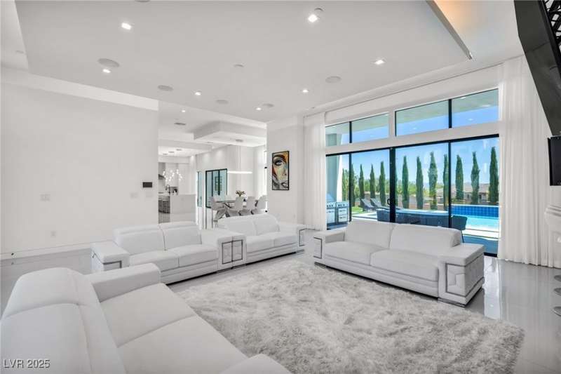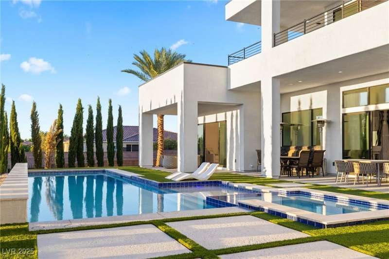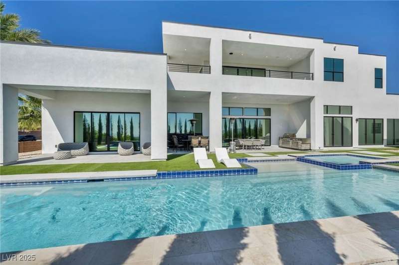 Experience resort-style luxury living in this custom estate spanning nearly 7,000 sq ft on a half-acre in NW Las Vegas. This architectural masterpiece blends clean contemporary lines with warm natural light, setting a new standard for refined desert living. The open-concept design flows effortlessly into multiple entertaining spaces, enhanced by sleek finishes and advanced smart-home technology. Gourmet kitchen has an expansive waterfall island, outfitted with professional-grade appliances and a hidden walk-in pantry. The primary suite features a private haven with a spa-inspired bath and 2 custom walk-in closets. Each additional bedroom is appointed with its own en-suite bath. Outdoors, the residence transforms into a resort setting. Meticulously landscaped grounds surround a heated pool and spa, complemented by a sauna and multiple lounging areas. From sunrise to sunset, every moment here is framed in luxury. This home?it's a statement of prestige, privacy, and modern elegance.