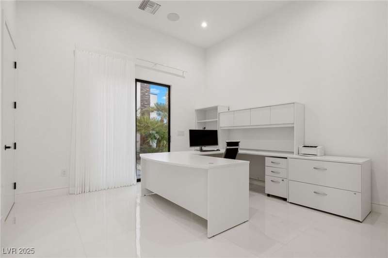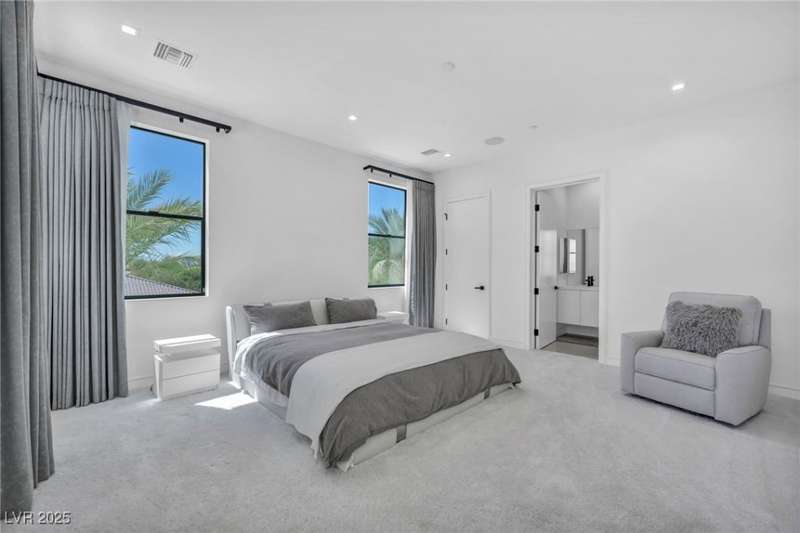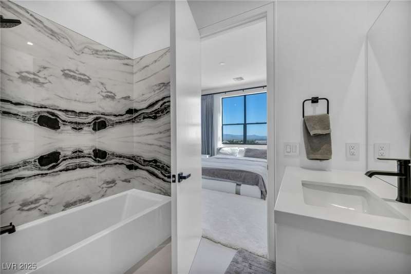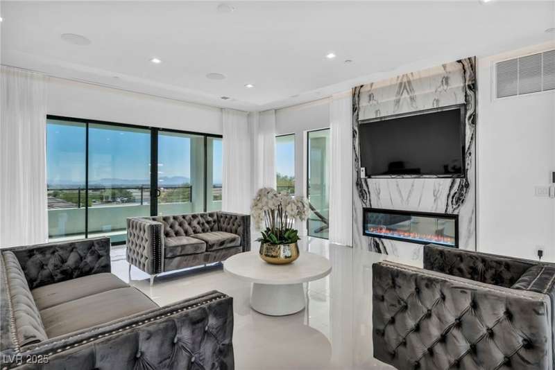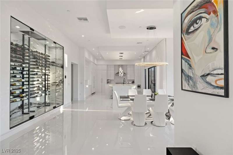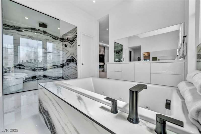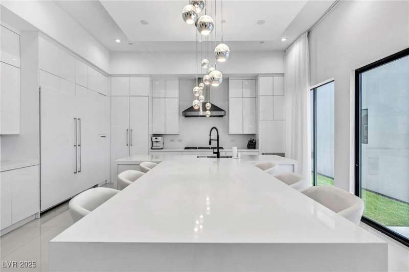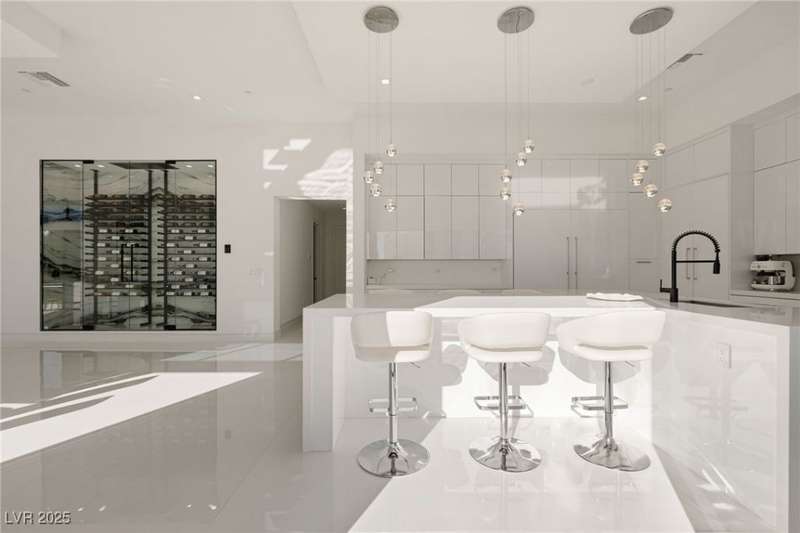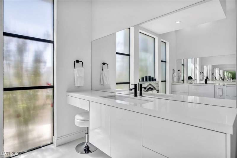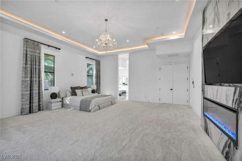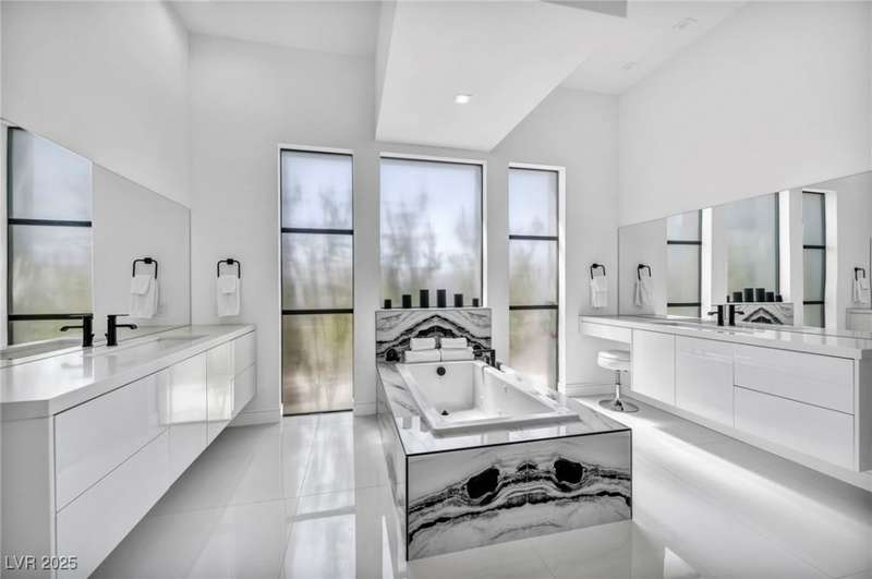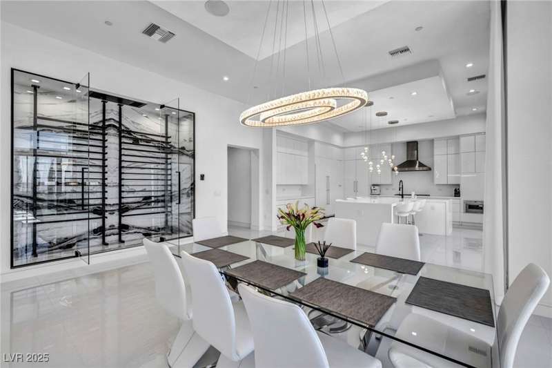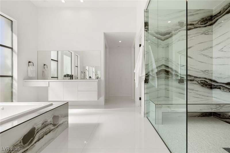 Experience resort-style luxury living in this custom estate spanning nearly 7,000 sq ft on a half-acre in NW Las Vegas. This architectural masterpiece blends clean contemporary lines with warm natural light, setting a new standard for refined desert living. The open-concept design flows effortlessly into multiple entertaining spaces, enhanced by sleek finishes and advanced smart-home technology. Gourmet kitchen has an expansive waterfall island, outfitted with professional-grade appliances and a hidden walk-in pantry. The primary suite features a private haven with a spa-inspired bath and 2 custom walk-in closets. Each additional bedroom is appointed with its own en-suite bath. Outdoors, the residence transforms into a resort setting. Meticulously landscaped grounds surround a heated pool and spa, complemented by a sauna and multiple lounging areas. From sunrise to sunset, every moment here is framed in luxury. This home?it's a statement of prestige, privacy, and modern elegance.