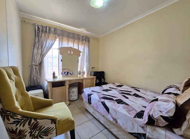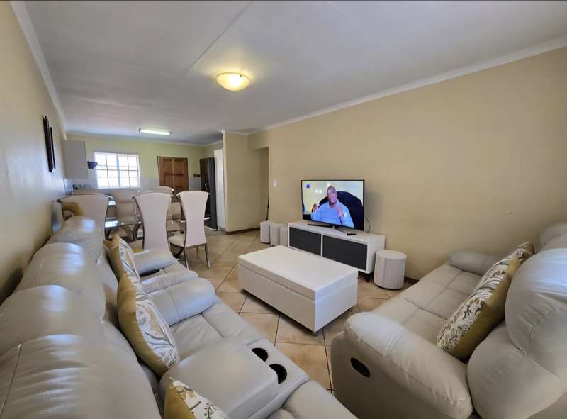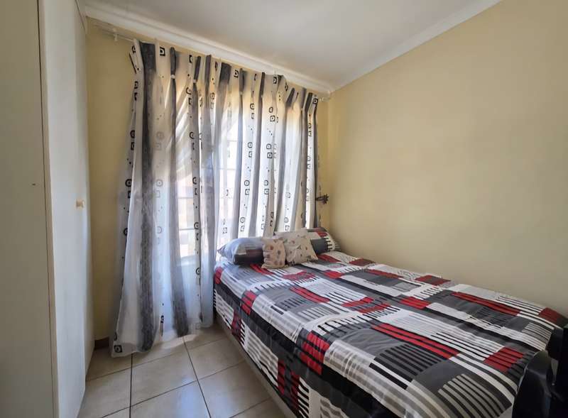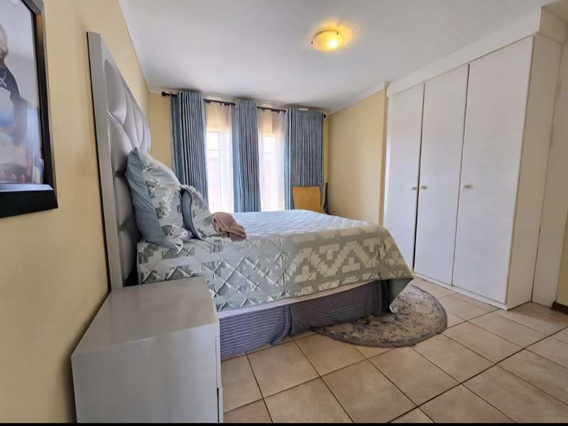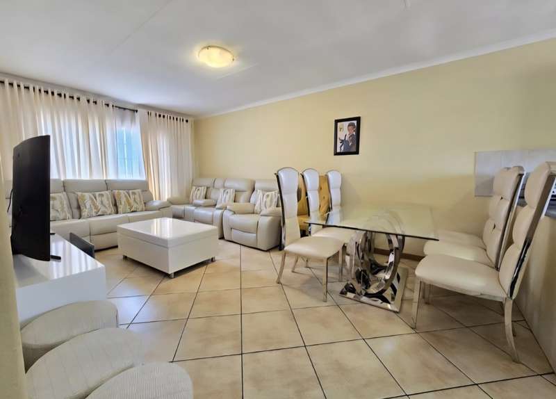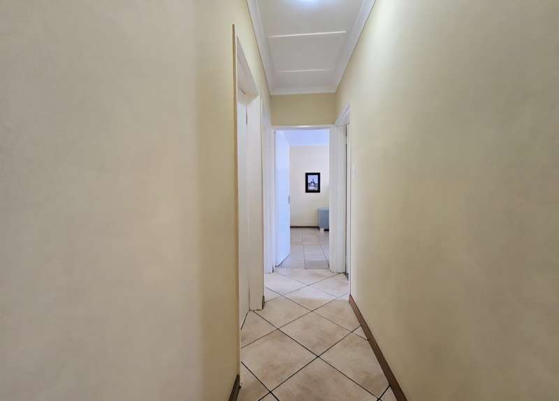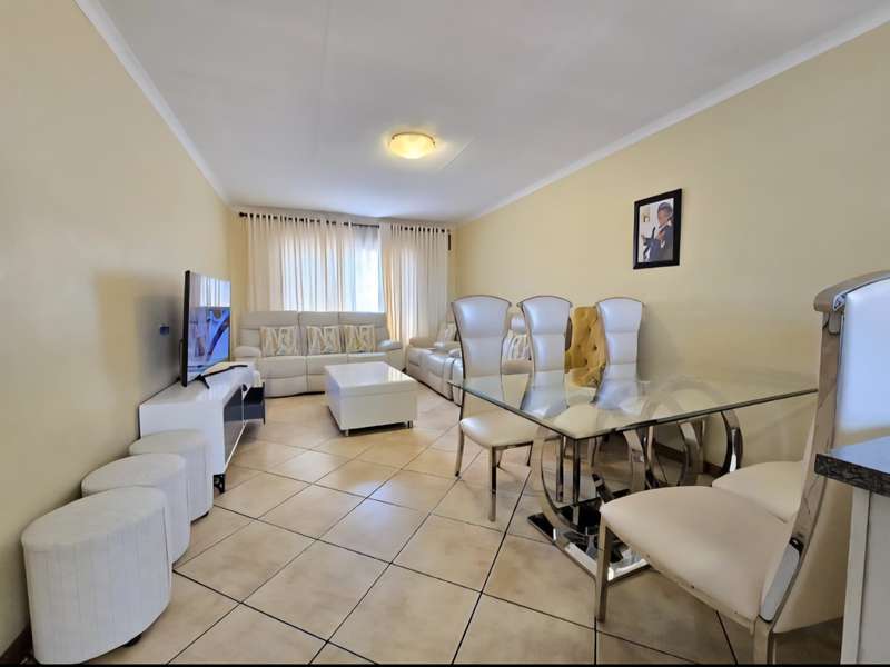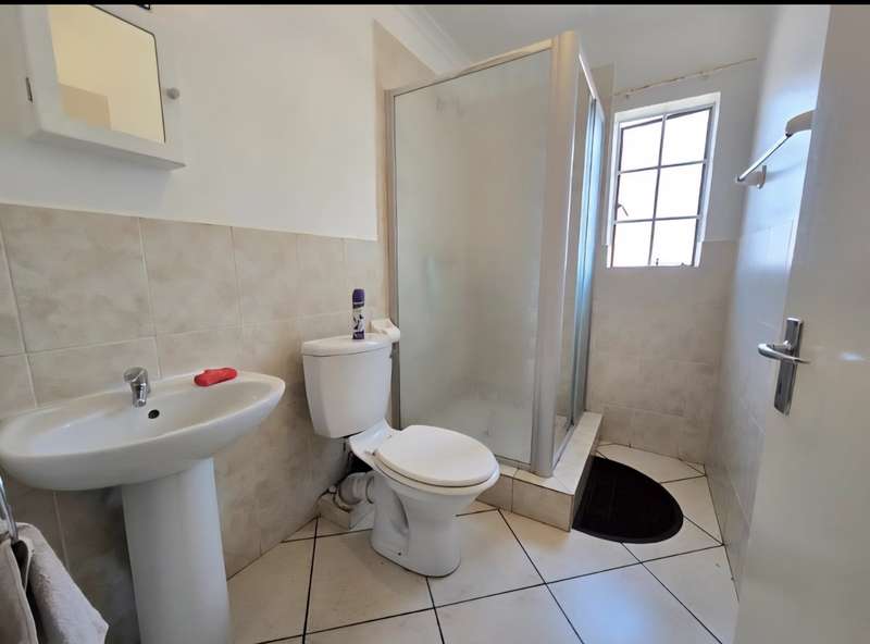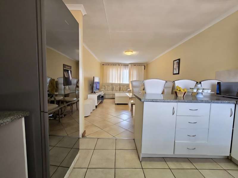 This neat upper floor unit features an open plan lounge, dining area and kitchen with cupboard space, hob and extractor fan. There is a small balcony as well with views of the complex. This unit is complete with 2 bedrooms with built in cupboards, 2 bathrooms and 2 carports. A very well secured unit within an estate and close to all amenities with easy access to main roads as well.