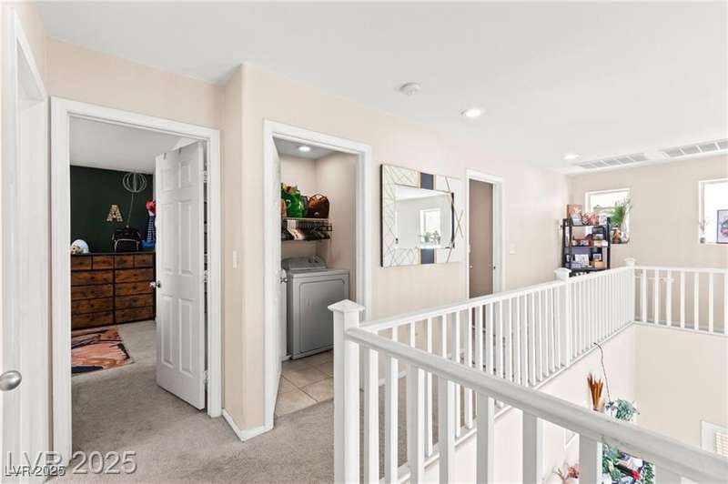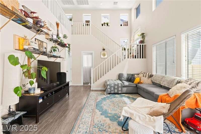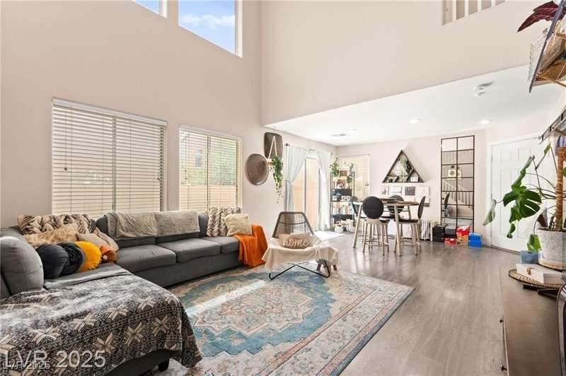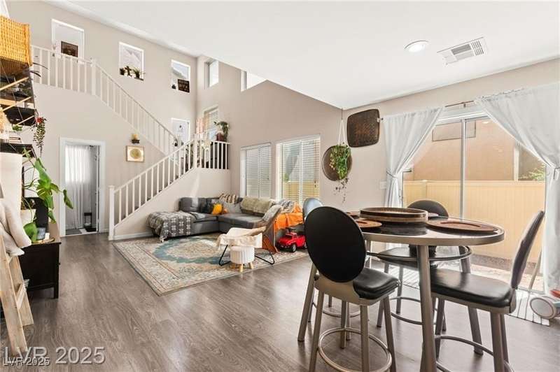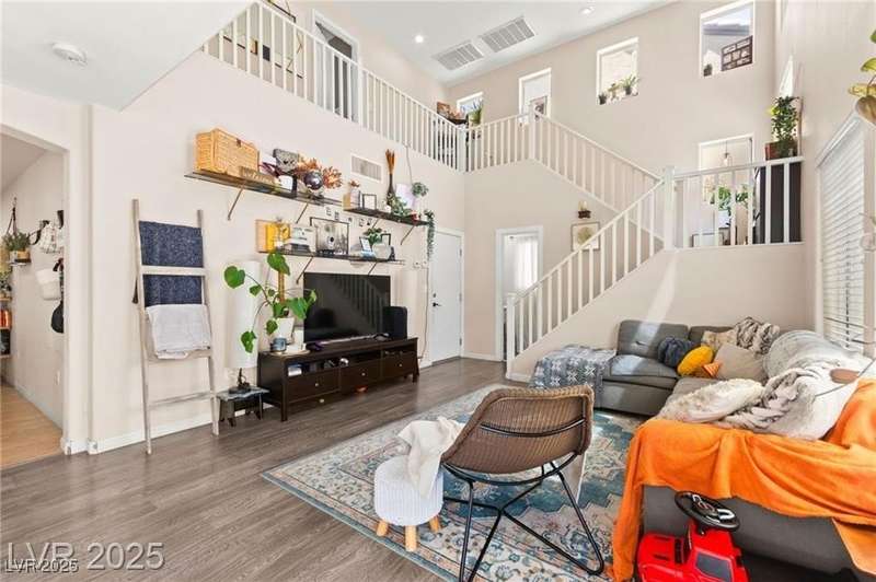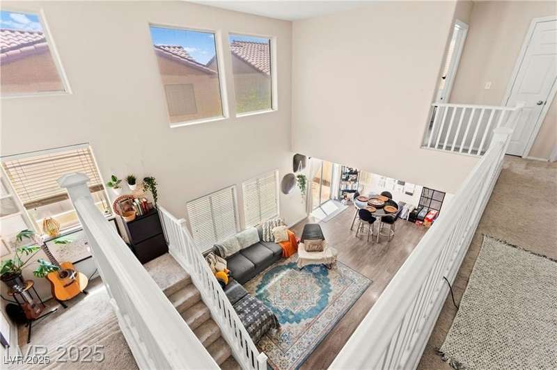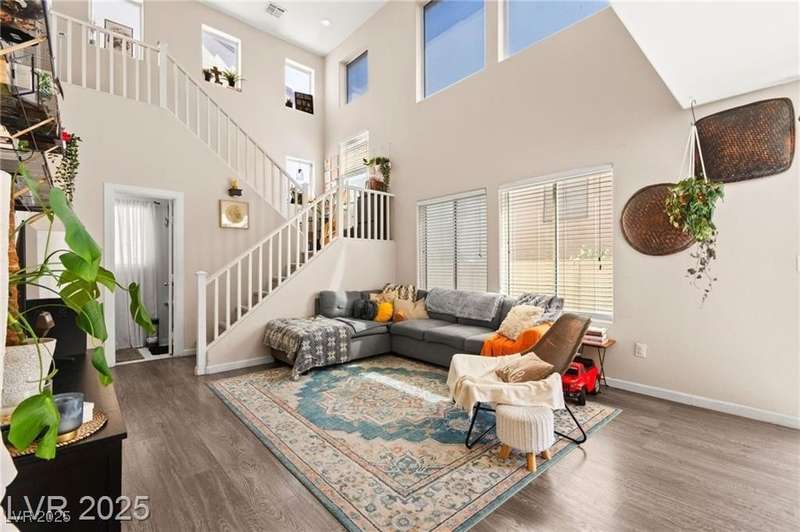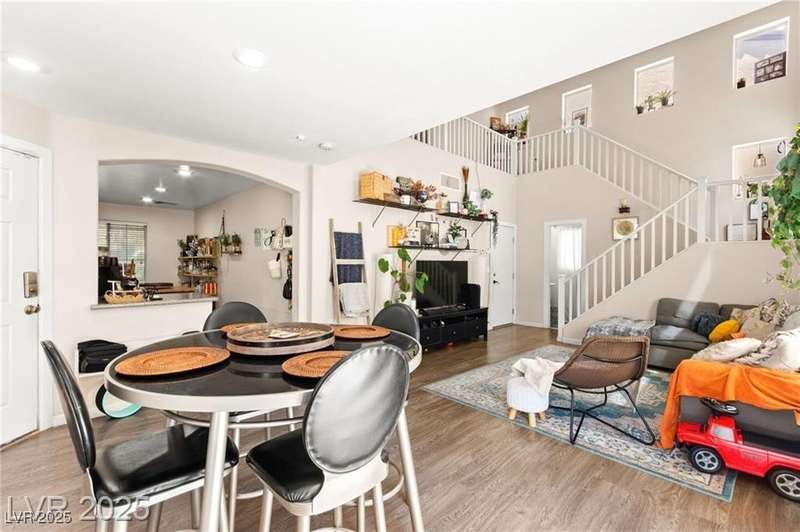 Beautiful mountain view home featuring soaring vaulted ceilings that open to the second floor, creating an expansive and airy living space. The open-concept first level includes a spacious living room, dining area, and kitchen—perfect for entertaining. Upgraded stair rails add a touch of elegance. The kitchen offers excellent functionality with upgraded cabinets and generous counter space. Enjoy Pergo flooring throughout the downstairs. For added convenience, the washer and dryer are located on the second floor. A park area is conveniently located directly across from the property, offering a peaceful outdoor retreat.