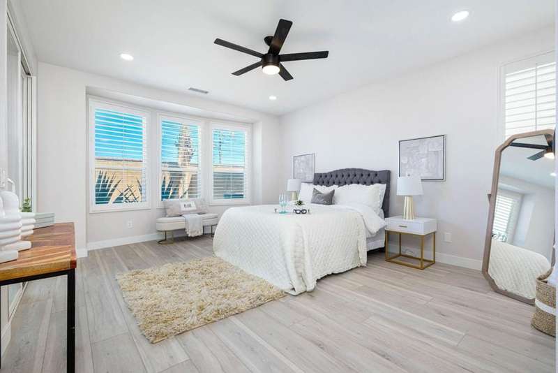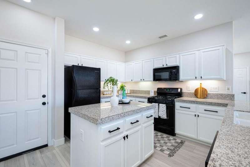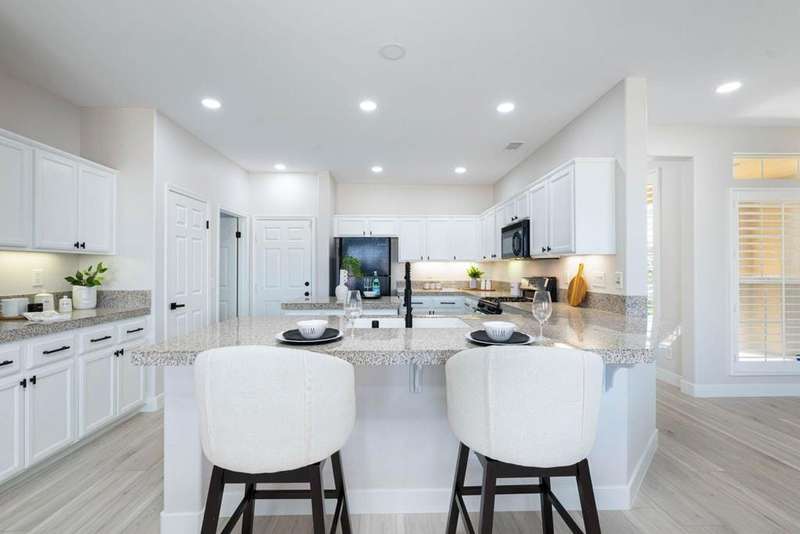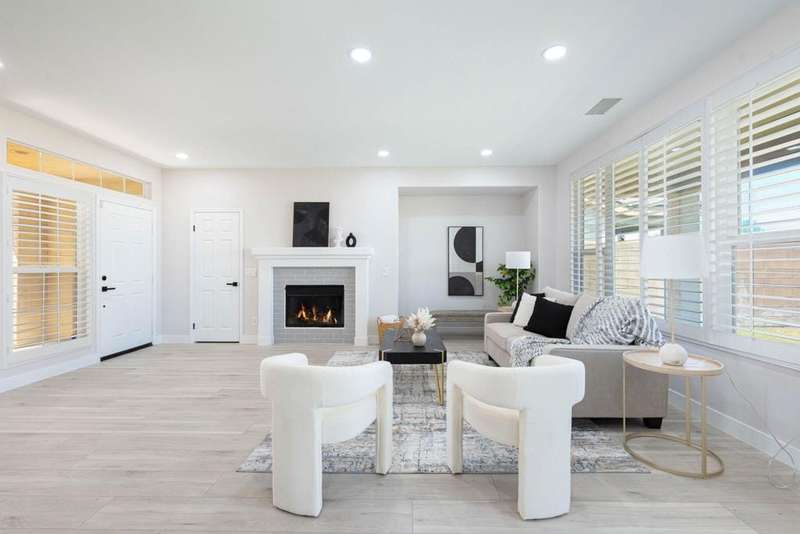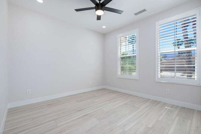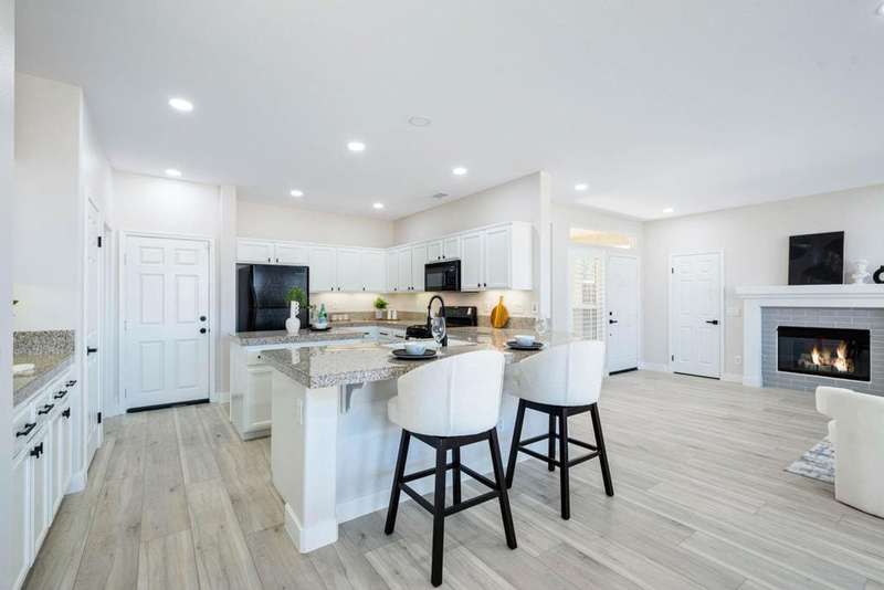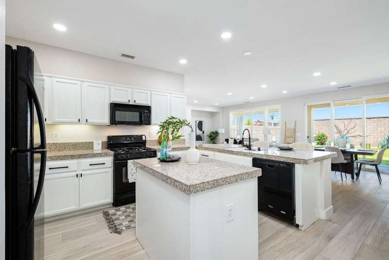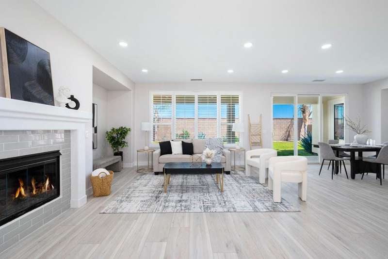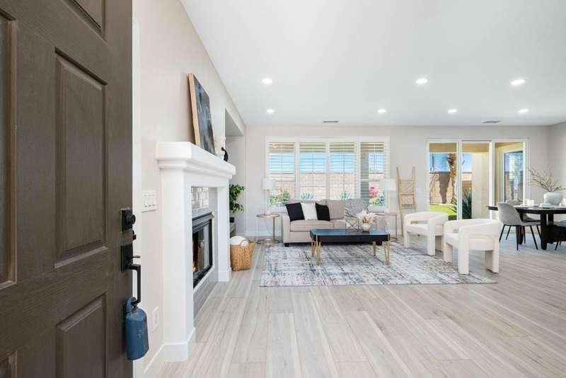 Welcome to Trilogy La Quinta, an exclusive 55+ resort community, where you'll find the epitome of luxury living in this stunning Oasis plan spanning 1580 square feet. This meticulously designed residence features 2 bedrooms and 2 baths, highlighted by a spacious great room adorned with plank flooring and a charming tile-surround gas log fireplace. Plantation shutters and a TV/Media niche add to the ambiance. The dining area is complemented by a hutch cavity and a soothing interior color scheme. The adjacent Chef's kitchen is a culinary haven, boasting granite counters, a peninsula with bar seating, black appliances, a prep island, pantry, and a gas range. Guests will enjoy their accommodations with a nearby full bath featuring a quartz counter, back-lit mirror, and shower-over-tub configuration. The primary retreat offers a slider to the back patio and an en suite bath complete with a dual vanity, large shower enclosure, and spacious walk-in closet. For added convenience, a separate laundry room with cabinetry is included. Outside, the rear yard presents a blank canvas with an extended covered patio and expansive views. Enjoy quick access to the Santa Rosa Clubhouse and its plethora of amenities and activities, just a short 5-minute golf cart ride away.
