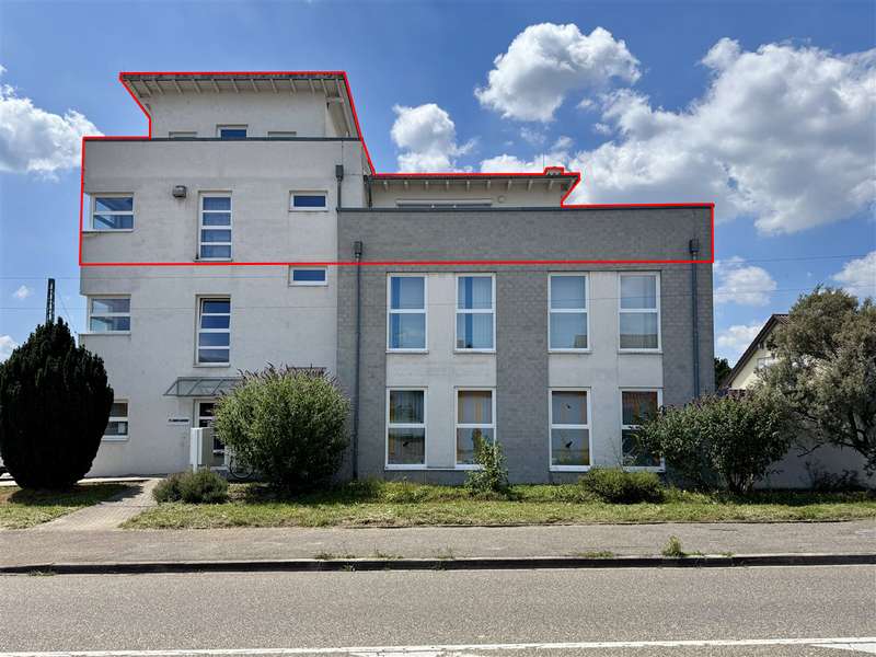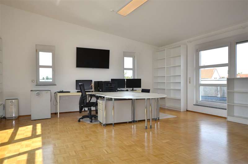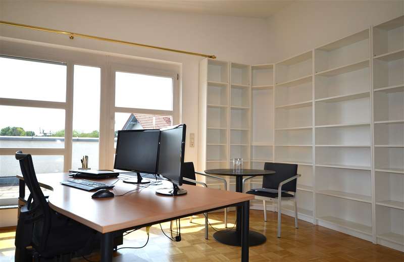 This smart office/practice unit is located on the 2nd and 3rd floors of a modern office building in a convenient location. The train station and highway are just a few minutes away. Approx. 136 m² of space is divided into three office/practice rooms, three bathrooms, a kitchen/living room, a file room and a storage/server room. The roof terraces account for a quarter of the total area of approx. 164 m². You can reach the unit via the staircase or conveniently by elevator. This leads directly to the office/paxis floor with a key only and is additionally secured with bars. On the lower floor, the commercial space itself has a lounge with a kitchen in mint condition, a small storage room that could also be used as a server room, two spacious offices, each with access to the roof terraces and the bathrooms. A file room is available for your files. A staircase takes you to the 3rd floor. The office located there with direct access to another roof terrace also boasts a gallery, which offers additional space for your files and books. A shower room completes this floor. The office/practice space is equipped with underfloor heating and electric shutters. A cellar room, a garage and two parking spaces round off the offer. In addition to the net cold rent of €1,435/month, there are 2 outdoor parking spaces for €25/parking space each and 1 garage for €50/garage each, bringing the total net cold rent to €1,535/month. The ancillary costs include heating costs, electricity must be billed directly by the tenant to the energy supplier. All costs (net rent and ancillary costs) are exclusive of VAT. The commercial unit can only be let to tenants entitled to deduct input tax.