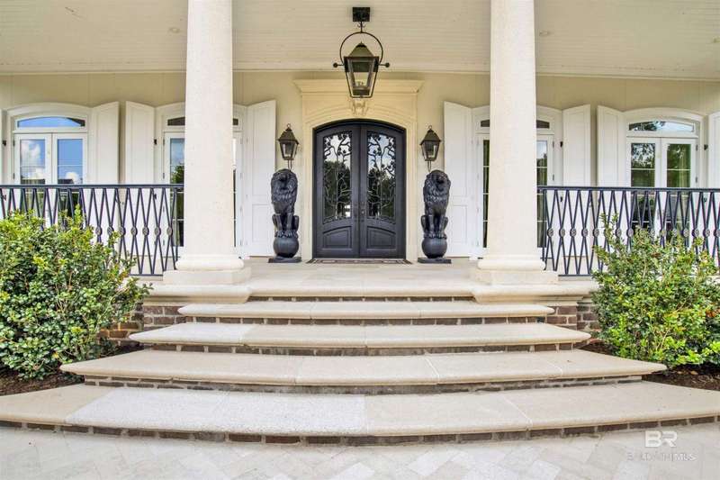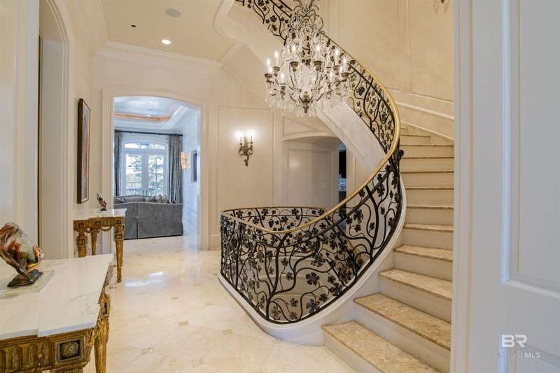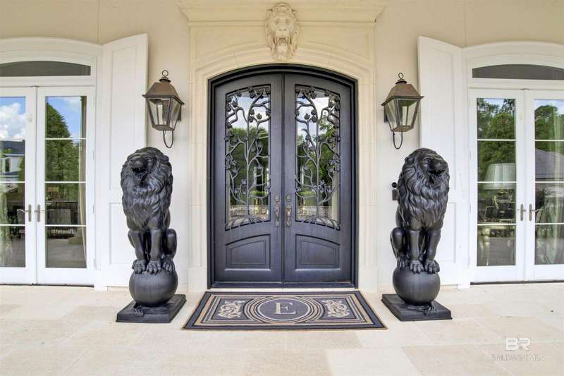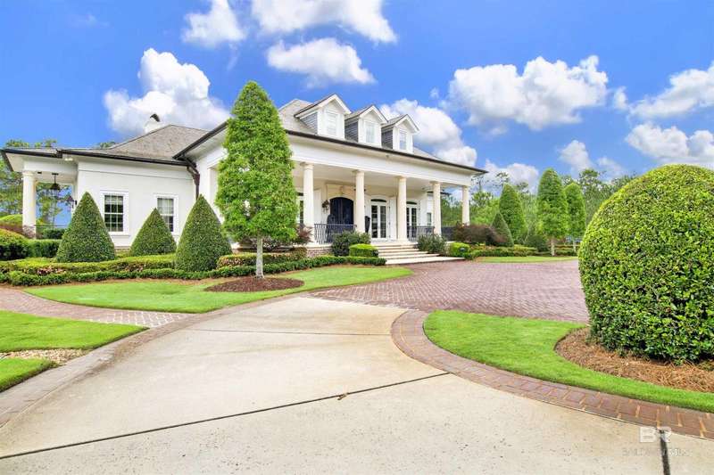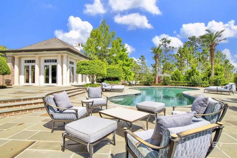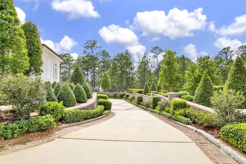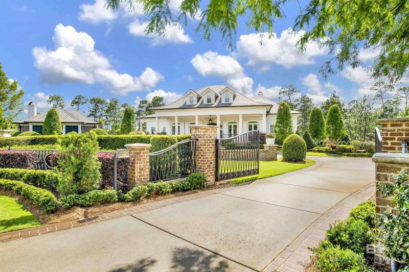 Luxury awaits in this gated Country Club community conveniently located between Pensacola, FL and Mobile, AL to the east and west along I-10, and Alabama beaches to the south and I-65 to the north. Several local airports within an hour's drive. Enjoy the clubhouse with restaurant and lounge, fishing, hunting, golf, as well as outdoor pools, exercise facilities, pro shop and a Chapel. This home is one-of-a-kind on 3 lots overlooking 4 holes of the award-winning golf course and the 200 acre Steelwood Lake. A gated circular drive to the Herringbone brick motor court is the perfect entry to this magnificent property. Completely fenced, the home, 2200 sf separate garage, and pool house offer one's own private resort. Step inside to find pure elegance with two toned marble floors throughout the main level and oak flooring in third level bedrooms. Kitchen features WOLF and Subzero appliances and a double island. The open concept is perfect for entertaining on a grand scale! In the master suite find His and Hers closets through a stunning bathroom with all the natural light. Enjoy heated floors and even a TV in the vanity mirror while you soak in the jetted tub overlooking the course and lake. Follow the marble steps and custom iron railing downstairs to the Sports Club, Wine Cellar, and Humidor to make the ultimate impression on your guests. The guest suite, office, and laundry facility can be found on the ground level just steps from the 3 car and 2 golfcart garage with 3 walk-in storage closets. On the 3rd level, 4 bedrooms and 3 baths offer a quiet escape for children and guests to rest. The pool deck and pool house are ideal for enjoying the abundance of warm, sunny days in South Alabama. Spend the evenings strolling the grounds in awe of the two fountains and elevated views of the golf course and sunsets over the lake. Whether for a weekend or a lifetime this is a magical place to unwind and recharge! Buyer to verify all information during due diligence.