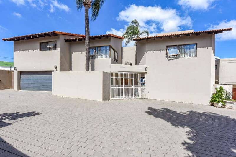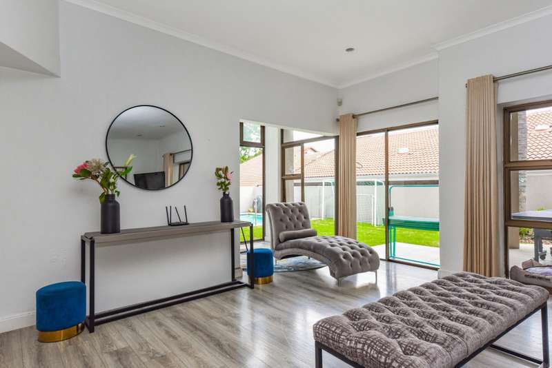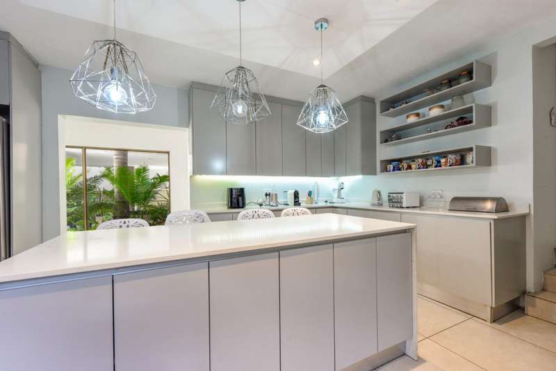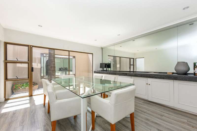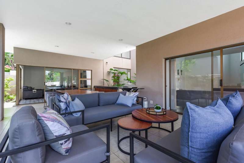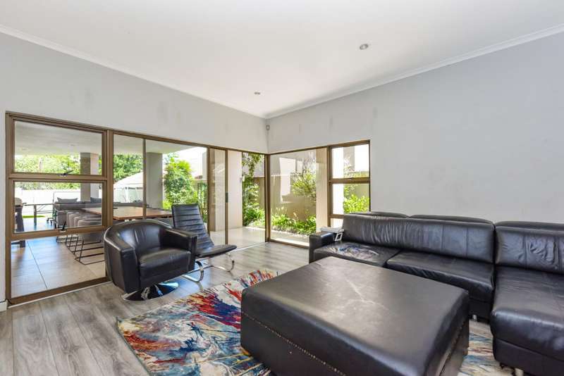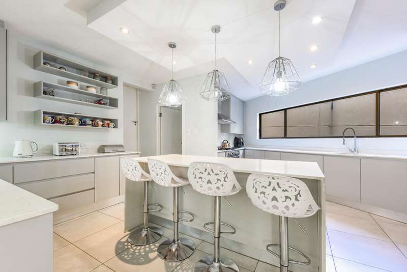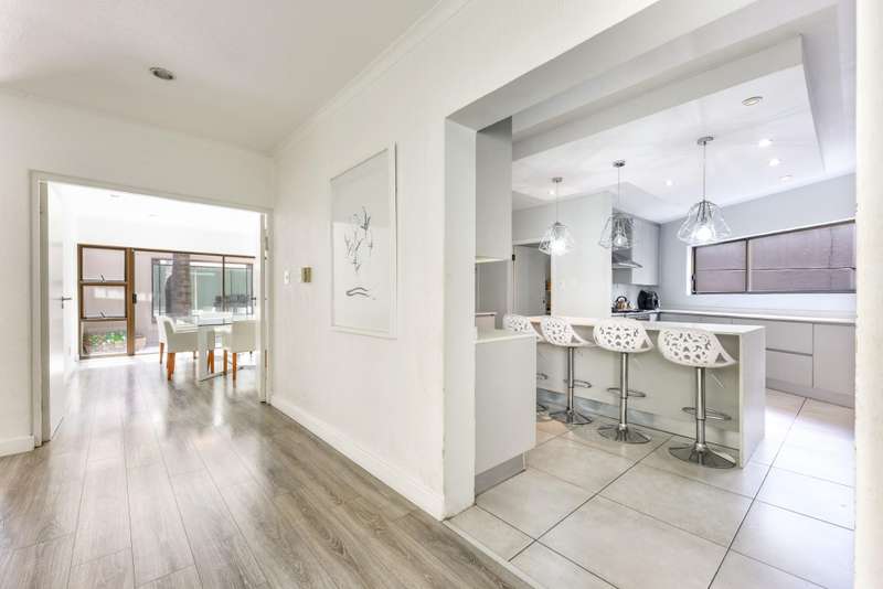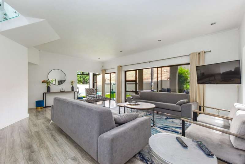 Walk into the front door and before you lies a sky high glass atrium filled with palm trees. Beautiful. Turn right, and will you pass the lovely guest loo and then you will see the formal lounge and/or TV room. Turn left on entrance and you will see the separate dining room. It is a very large separate dining room with sliding doors at the end that lead to a little oasis garden. There is a built in serving unit with cupboards. The kitchen is totally perfect and newly renovated with the most stunning built in appliances. There is a scullery too and a perfectly appointed staff quarters. Further along you will find the main living area and its expansive, light and modern. Sliding doors all roudn lead onto a big covered patio and entertainment area. Manageable sized garden space and a solar heated swimming pool. Back inside and up the stairs there are 4 big bedrooms and balconies. The main bedroom is ensuite and has two walk in dressing rooms. There is ample cupboard space in all the rooms plus a large walk in linen cupboard. This freehold cluster home is across the road from Redhill School, stones throw from Morningside shopping centre. Truly in the heart Morningside, Sandton.
