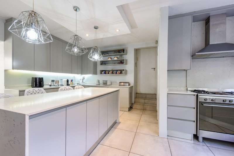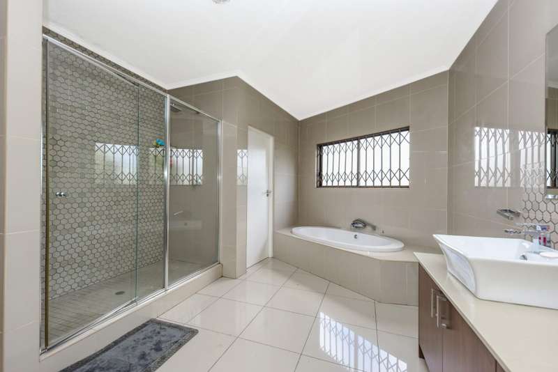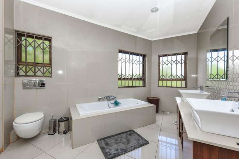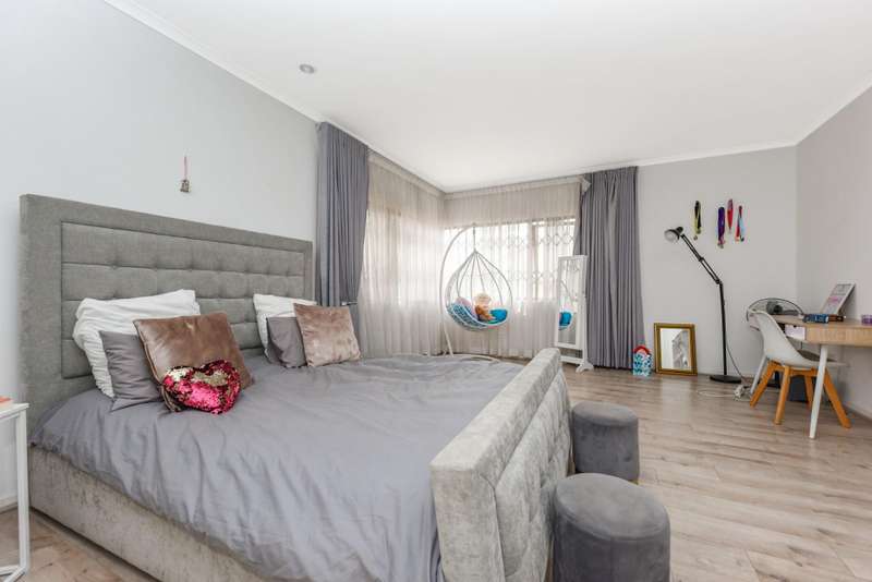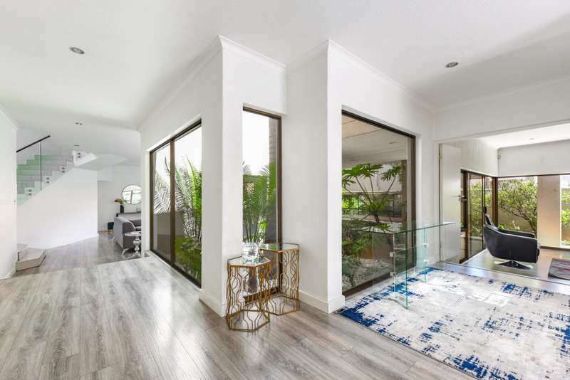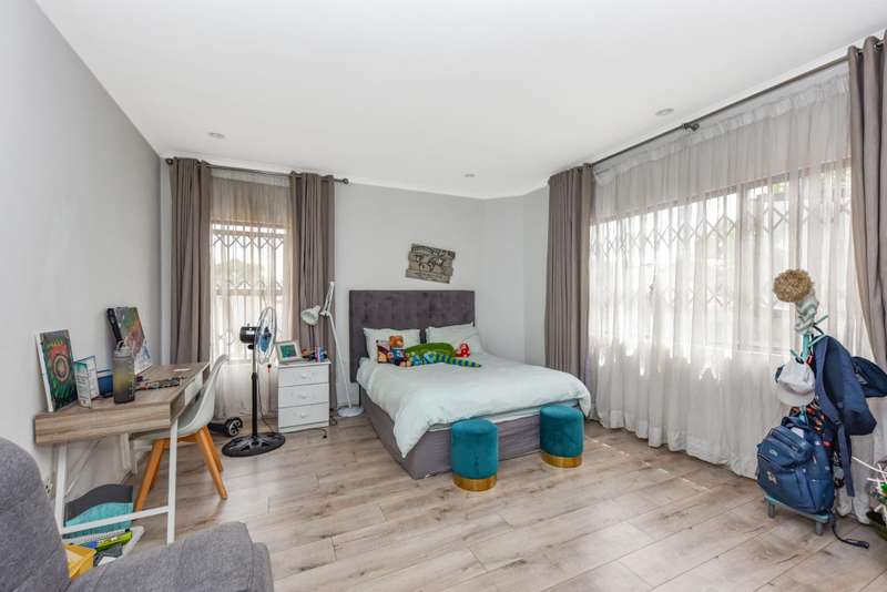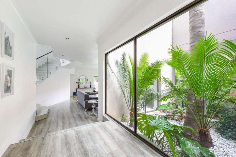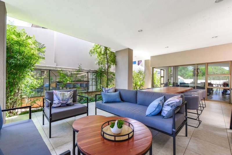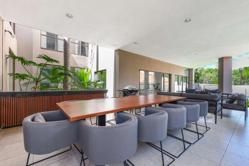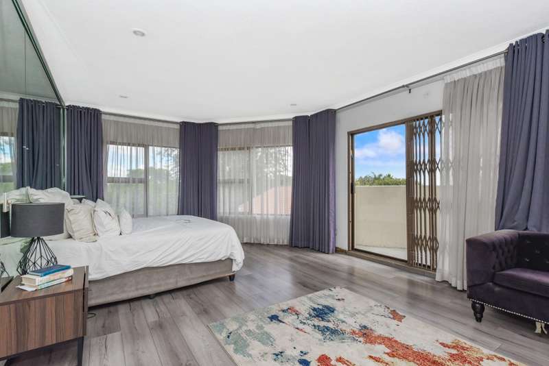 Walk into the front door and before you lies a sky high glass atrium filled with palm trees. Beautiful. Turn right, and will you pass the lovely guest loo and then you will see the formal lounge and/or TV room. Turn left on entrance and you will see the separate dining room. It is a very large separate dining room with sliding doors at the end that lead to a little oasis garden. There is a built in serving unit with cupboards. The kitchen is totally perfect and newly renovated with the most stunning built in appliances. There is a scullery too and a perfectly appointed staff quarters. Further along you will find the main living area and its expansive, light and modern. Sliding doors all roudn lead onto a big covered patio and entertainment area. Manageable sized garden space and a solar heated swimming pool. Back inside and up the stairs there are 4 big bedrooms and balconies. The main bedroom is ensuite and has two walk in dressing rooms. There is ample cupboard space in all the rooms plus a large walk in linen cupboard. This freehold cluster home is across the road from Redhill School, stones throw from Morningside shopping centre. Truly in the heart Morningside, Sandton.