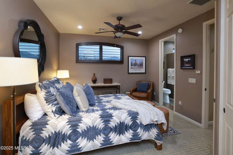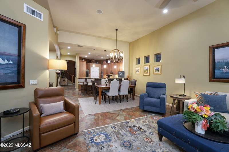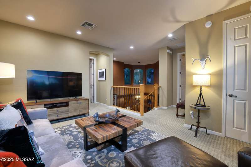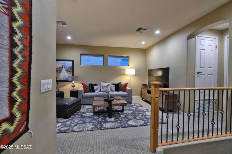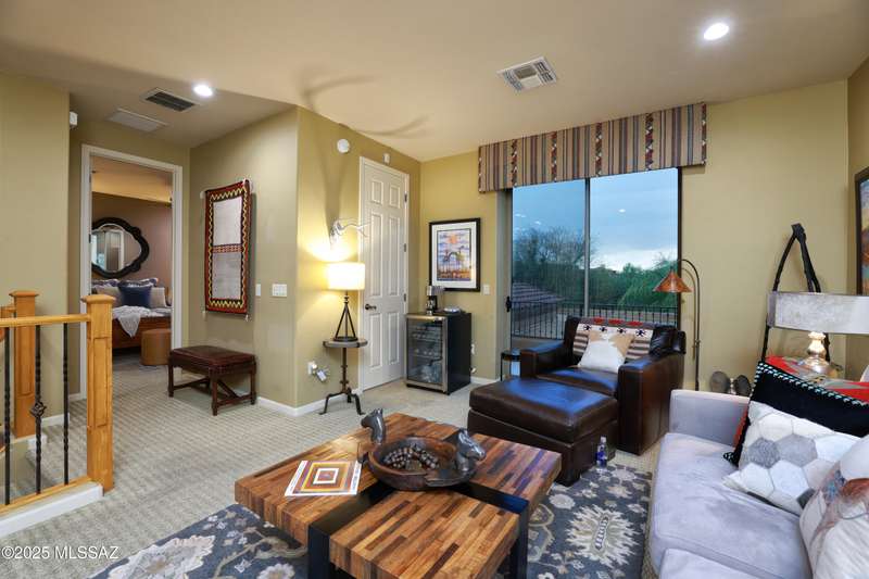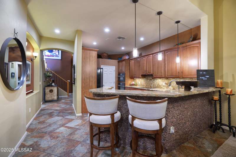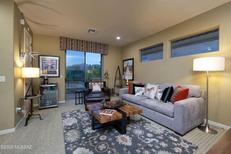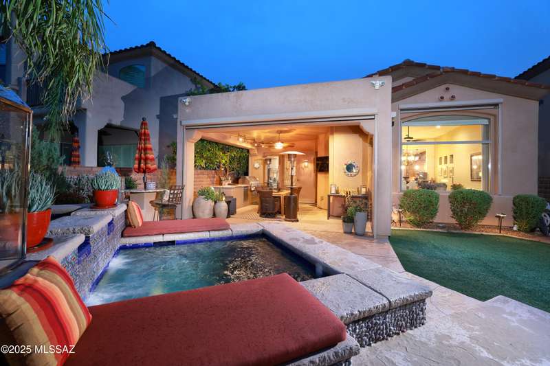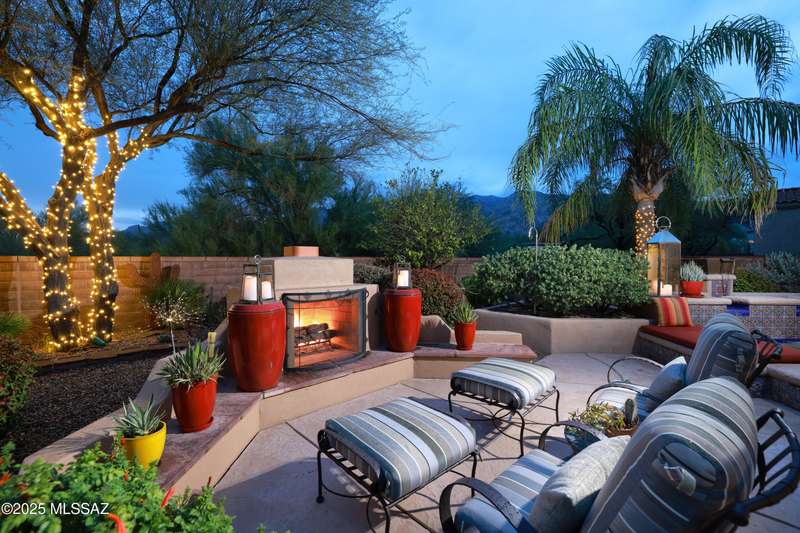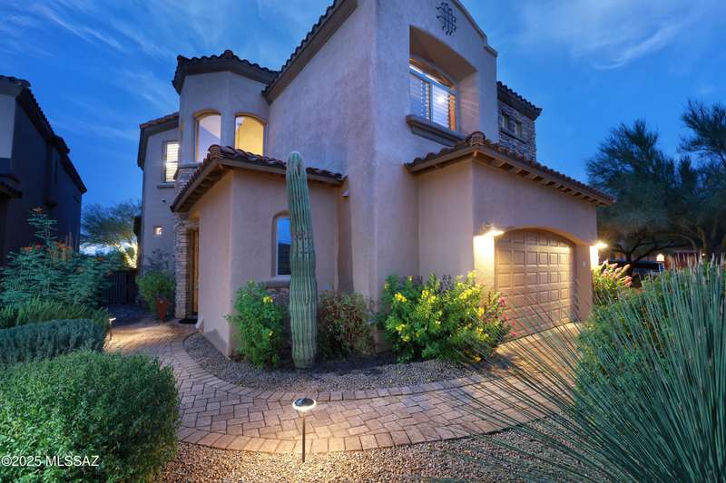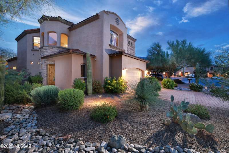 Former AF Sterling model home loaded with upgrades and further improved by seller (full list attached). Primary bedroom is on ground floor, two bedrooms upstairs with ensuite baths and additional living room/loft area with deck. Ground level features an open entertaining space, dining area, and great-room with access to the extended covered patio. Gourmet kitchen features black finish stainless Kitchen Aid and Bosch appliances, granite counters with chiseled edge, breakfast bar, full granite back-splash, cherry cabinets. Architect designed yard features in-ground spa with water feature with custom tile, Alfresco BBQ grill/out door kitchen under the covered patio, a cozy sitting area with built-in chimenea for star-gazing, and backs to natural desert area providing extra privacy.