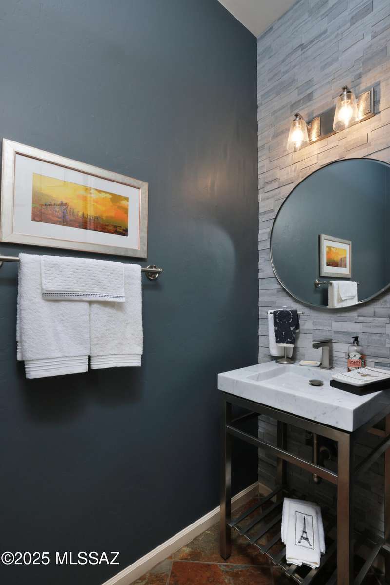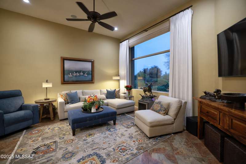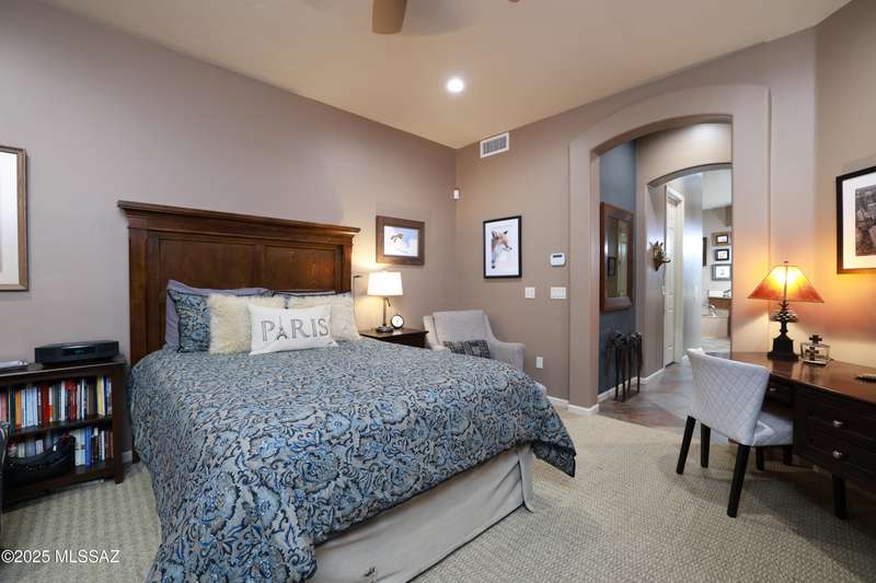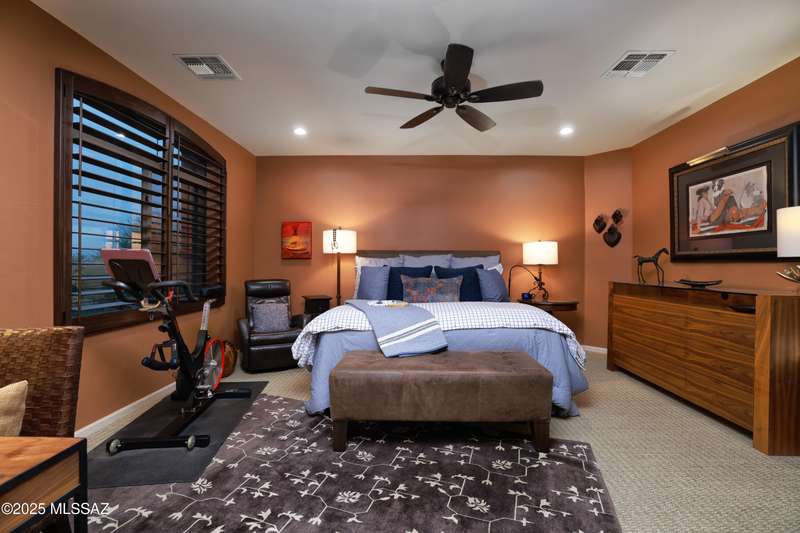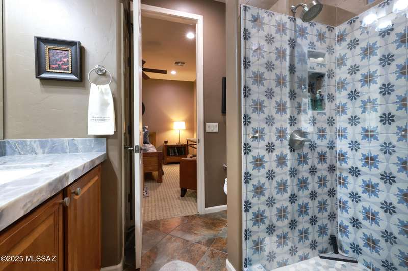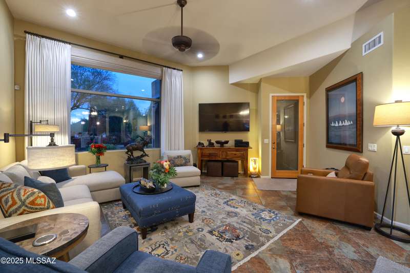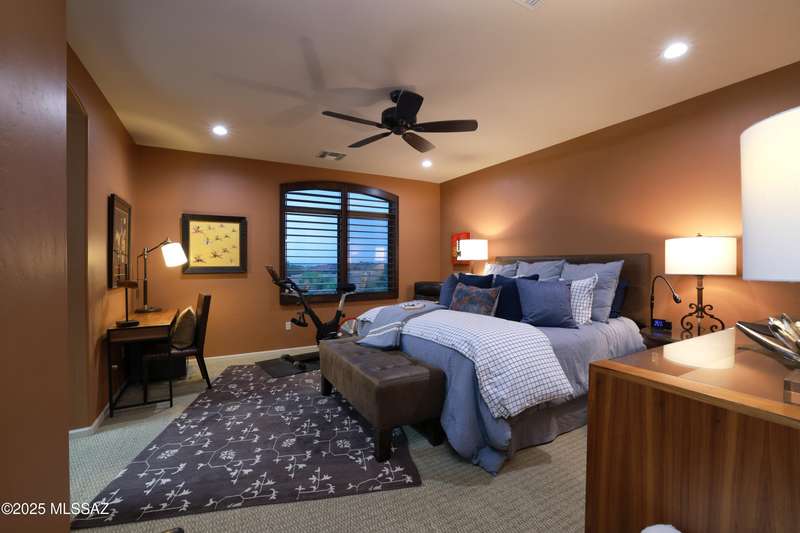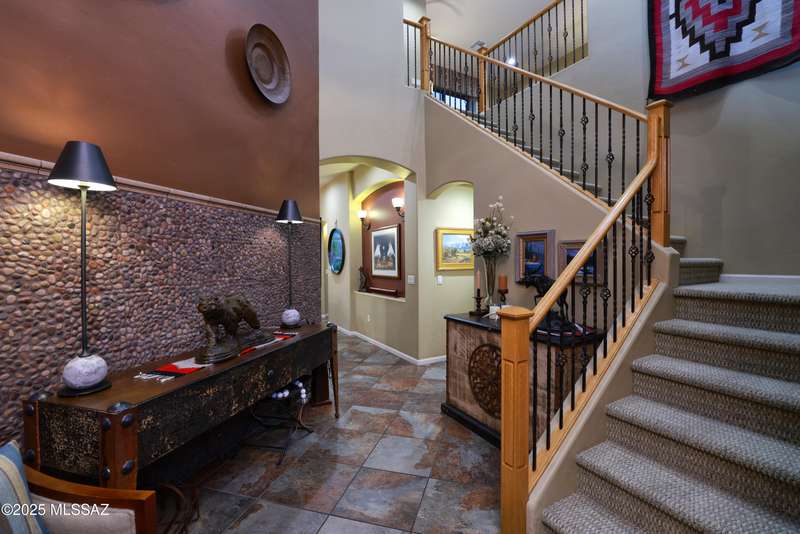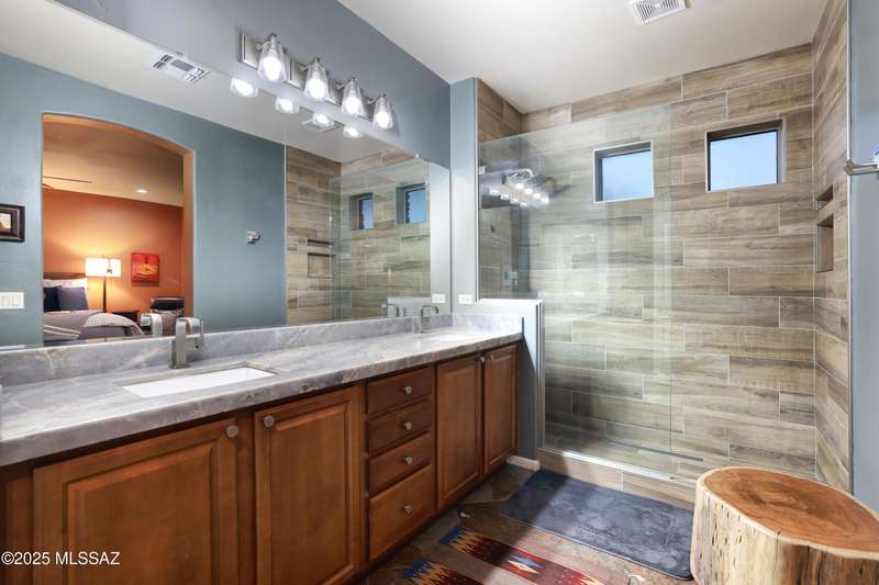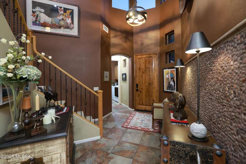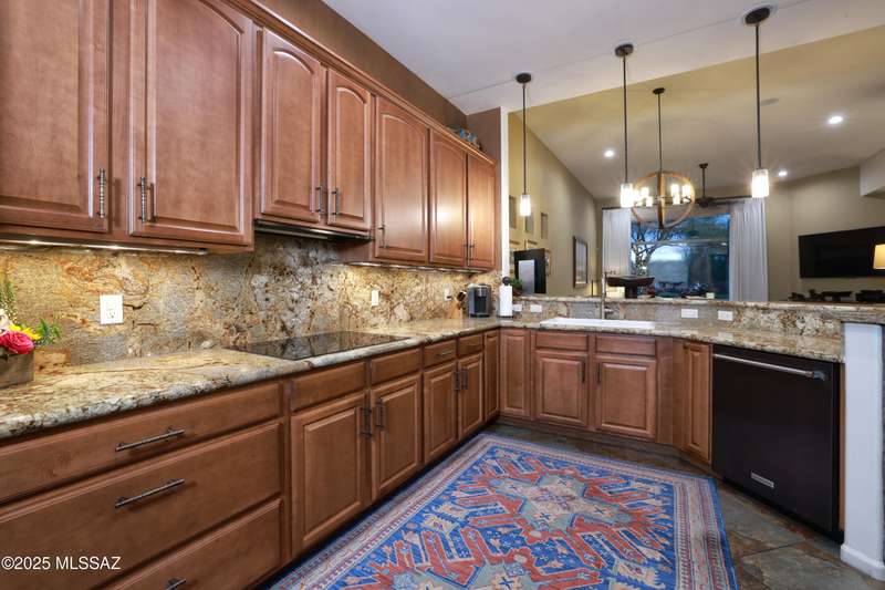 Former AF Sterling model home loaded with upgrades and further improved by seller (full list attached). Primary bedroom is on ground floor, two bedrooms upstairs with ensuite baths and additional living room/loft area with deck. Ground level features an open entertaining space, dining area, and great-room with access to the extended covered patio. Gourmet kitchen features black finish stainless Kitchen Aid and Bosch appliances, granite counters with chiseled edge, breakfast bar, full granite back-splash, cherry cabinets. Architect designed yard features in-ground spa with water feature with custom tile, Alfresco BBQ grill/out door kitchen under the covered patio, a cozy sitting area with built-in chimenea for star-gazing, and backs to natural desert area providing extra privacy.