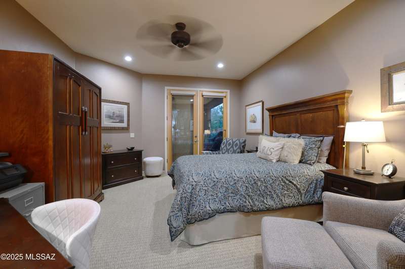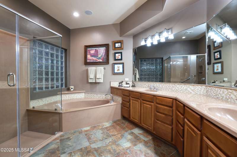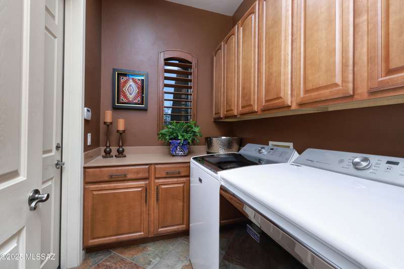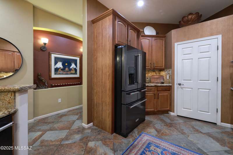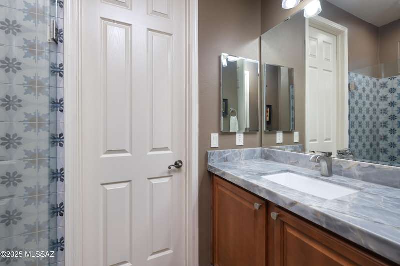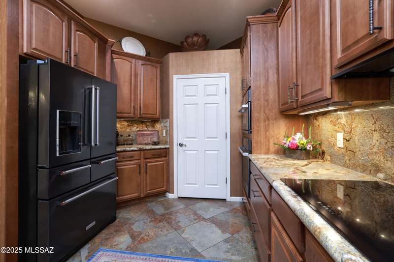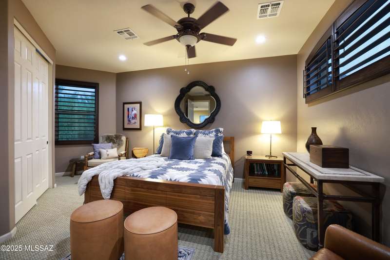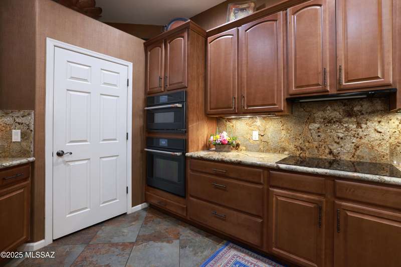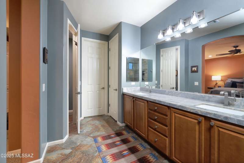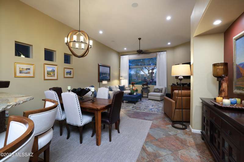 Former AF Sterling model home loaded with upgrades and further improved by seller (full list attached). Primary bedroom is on ground floor, two bedrooms upstairs with ensuite baths and additional living room/loft area with deck. Ground level features an open entertaining space, dining area, and great-room with access to the extended covered patio. Gourmet kitchen features black finish stainless Kitchen Aid and Bosch appliances, granite counters with chiseled edge, breakfast bar, full granite back-splash, cherry cabinets. Architect designed yard features in-ground spa with water feature with custom tile, Alfresco BBQ grill/out door kitchen under the covered patio, a cozy sitting area with built-in chimenea for star-gazing, and backs to natural desert area providing extra privacy.
