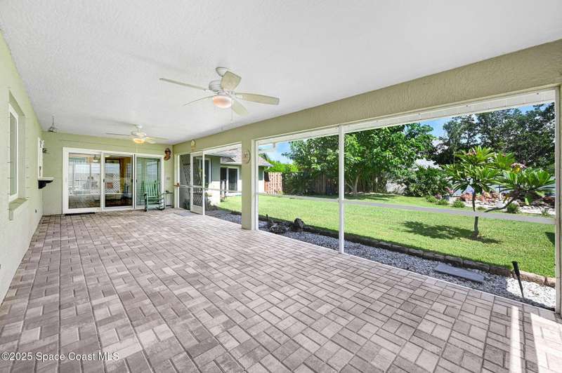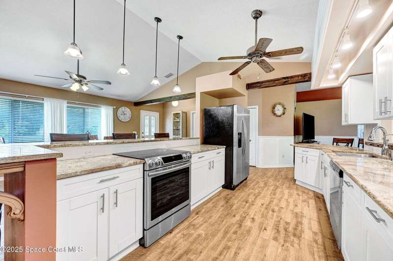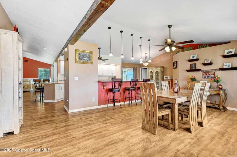This 3BR/2BA home offers nearly 2,000 sq. ft. of living area plus a 2-car garage on a .36-acre corner lot. Recent updates include a newer roof, impact-rated windows/doors, and AC. Outdoor living features an 11x33 screened lanai with pavers, tranquil fish pond with waterfall, powered shed, and 20x28 carport with double gates-ideal for RV, boat, or extra vehicles. Inside, luxury vinyl plank flooring flows through most of the home, complemented by cathedral ceilings with a wood beam for warmth and character. The kitchen boasts granite counters, white shaker cabinets, and ample storage, all open to the dining and living areas. The large flex room offers endless possibilities (3rd bedroom). The primary suite includes sliders to the lanai, a huge walk-in closet, serene and stylish bathroom with a door to exterior. Lovingly maintained and feature-rich, this inviting home is a MUST SEE! ROOF 9/22 WH 2018 AC 11/24 Just minutes to shopping, parks, restaurants, Harris, interstate, beaches!