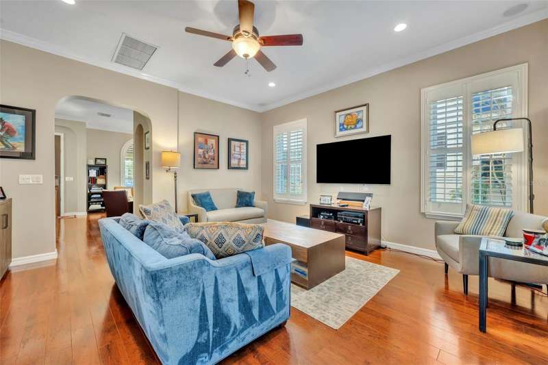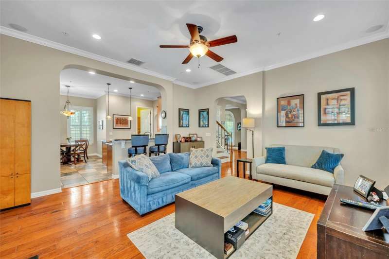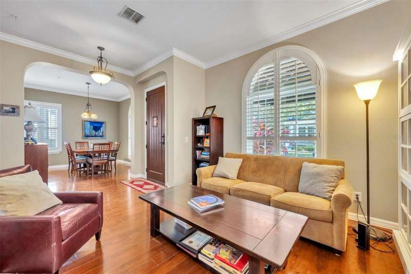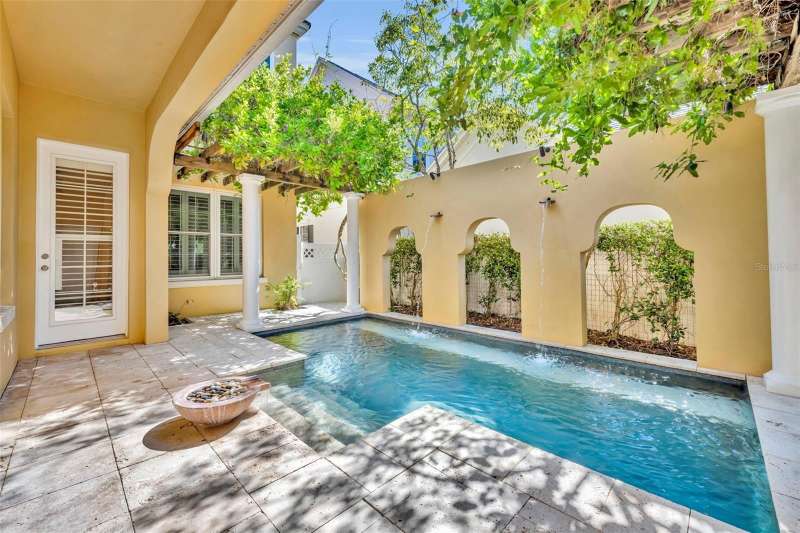 Under contract-accepting backup offers. Welcome to this stunning Mediterranean-inspired home in the heart of Baldwin Park! Move right into this 3 bedroom PLUS BONUS ROOM/ 2.5 bath home! Step into your private oasis featuring a captivating backyard pool with elegant fountains, surrounded by a charming courtyard patio framed by classic columns, trellises, and lush mature landscaping — the perfect setting for al fresco dining and entertaining under the Florida sky. A quaint fenced front yard greets you upon arrival, leading inside to soaring ceilings, elegant archways, rich hardwood floors, detailed crown molding, and custom window treatments that exude timeless elegance. The formal living and dining rooms overlook the front yard and flow seamlessly through a butler’s pantry into the serene chef’s kitchen, complete with an island, breakfast bar, gas range and cozy eat-in nook — all open to the inviting family room. The spacious first-floor primary suite with tray ceiling offers the ultimate retreat with its luxurious ensuite bath featuring dual vanities, a soaking tub, walk-in shower, private water closet, and a custom-designed walk-in closet. Upstairs you’ll find two bright guest bedrooms with new carpet, a study nook, and a huge bonus room — ideal for a home office, gym, or additional family space. Additional highlights include an indoor laundry room, rear-entry 2+ car garage with abundant storage (27x23), AC & water heater 2017, double paned windows throughout and an unbeatable location near Cady Way Trail, Baldwin Park Trail, and all the amenities of the Baldwin Park lifestyle — community pools, parks, fitness centers, dining, and shoppes. WELCOME HOME!