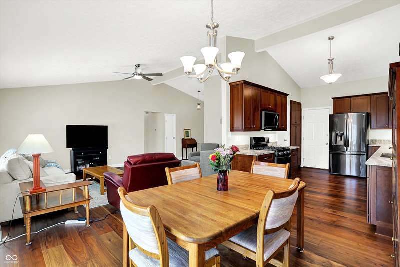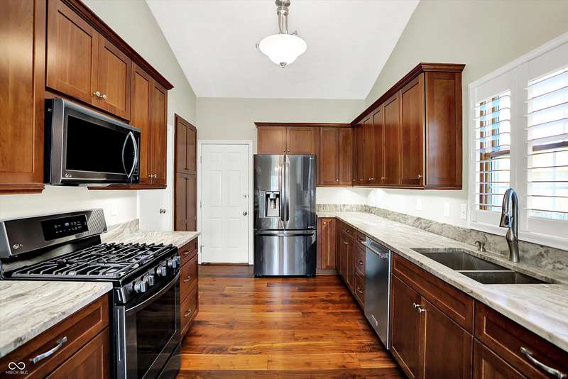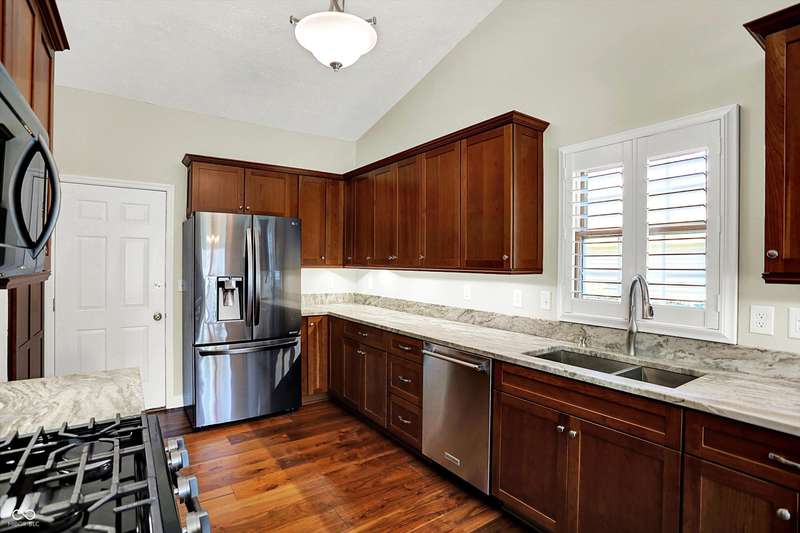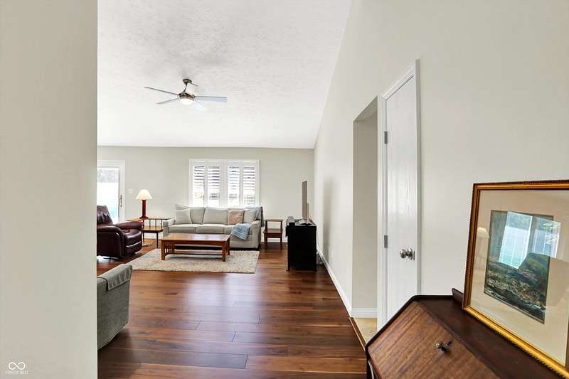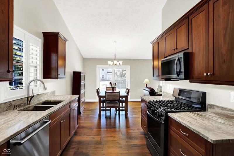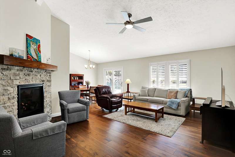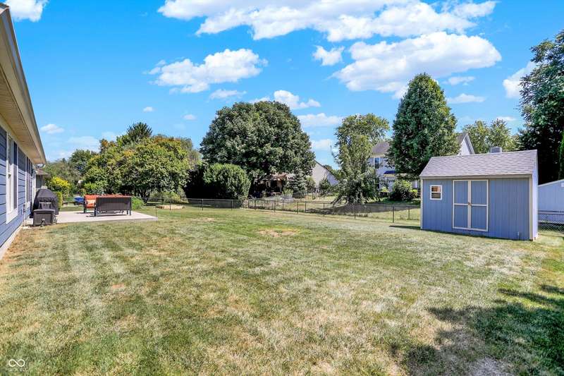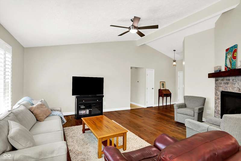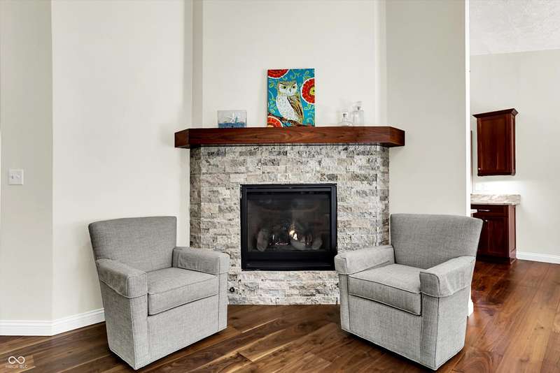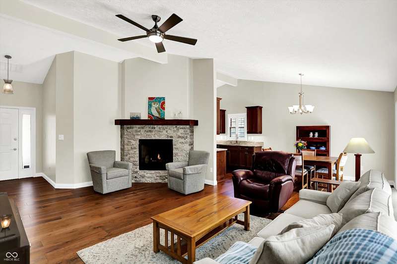 Welcome to this beautiful, one owner, well maintained ranch home in the popular Sunblest neighborhood! The remodeled kitchen is a showstopper, featuring 42-inch cabinets, leathered quartz counters, gas oven range, and stainless-steel appliances. The spacious great room boasts a vaulted ceiling, a cozy updated gas fireplace with custom mantle, and beautiful wide plank walnut engineered hardwood floors. The primary suite offers an updated bathroom including dual sinks, tiled shower, tile flooring, and a walk-in closet with built-in organizers. The second full bath has also been tastefully updated. Fresh interior paint (2025) and washer and dryer are included. Bonus highlights include a finished garage with workbench and heater, storage shed with electricity, and a large, fenced backyard perfect for entertaining. Recent updates provide peace of mind: Hardie Plank siding, soffit, gutters, and roof (2020), water heater (2021), and water softener (2024). All of this is just a short walk to downtown Fishers, the Nickel Plate District Amphitheater, Holland Park, shopping, restaurants, and more!