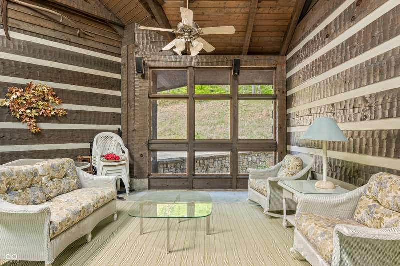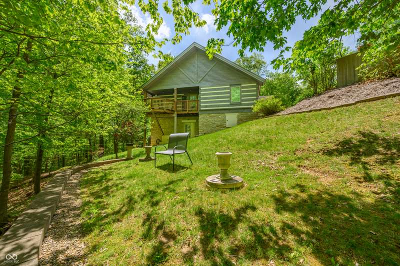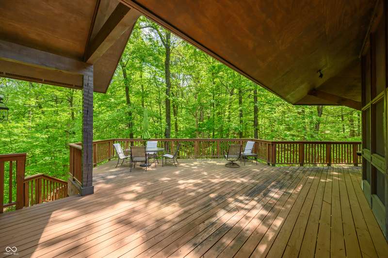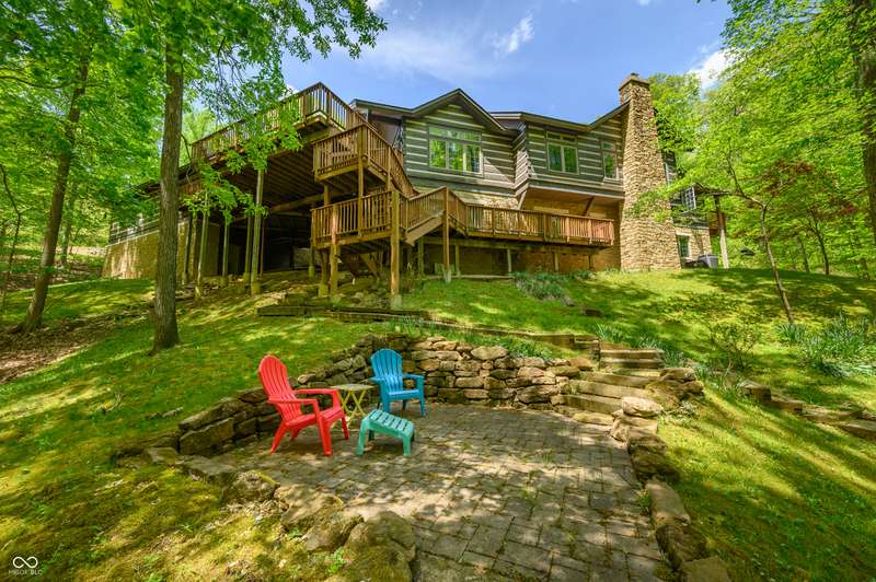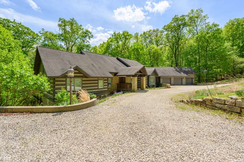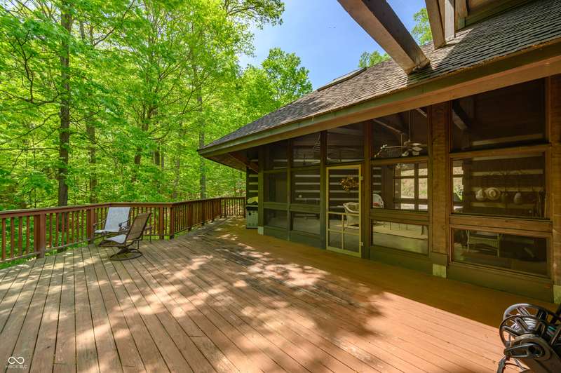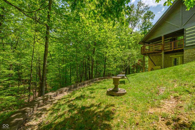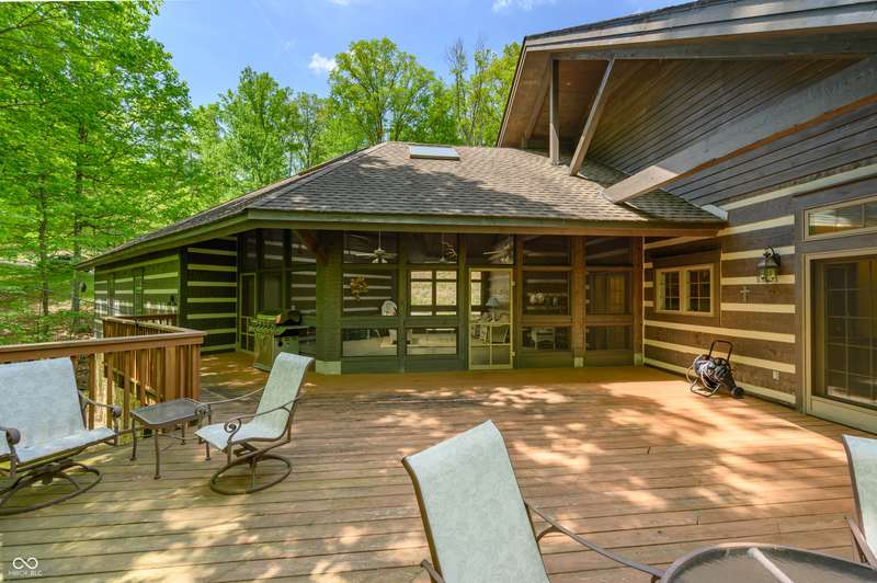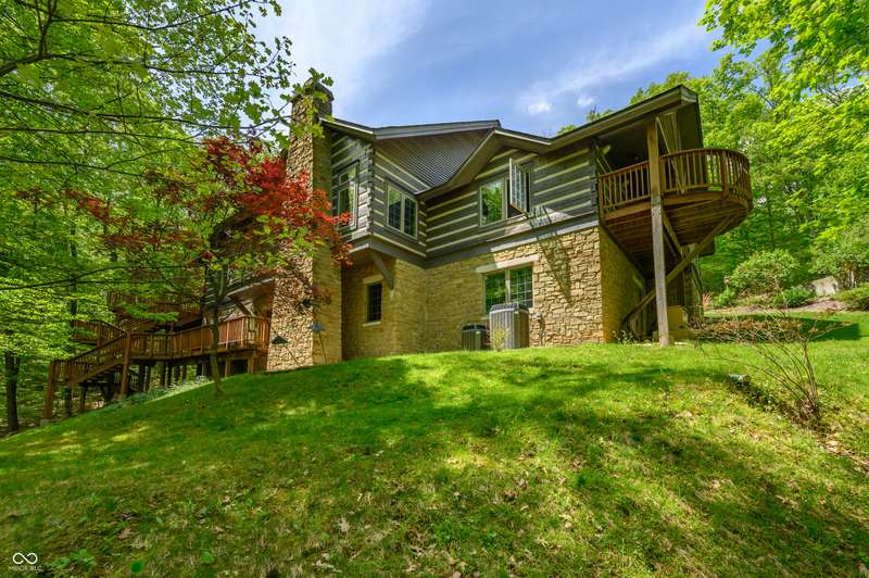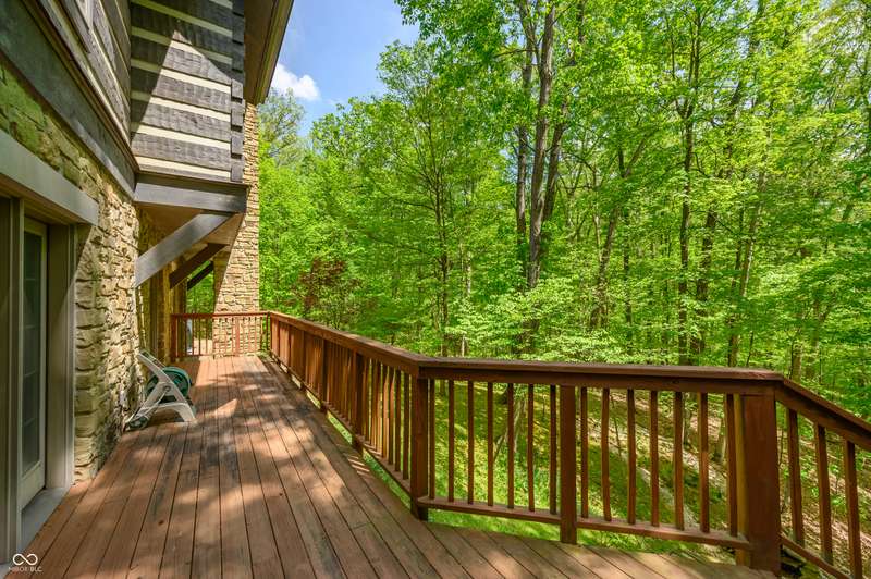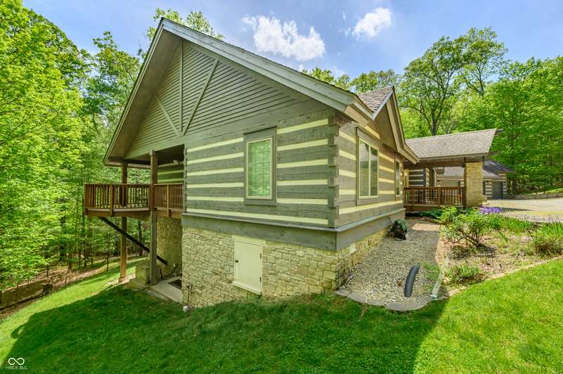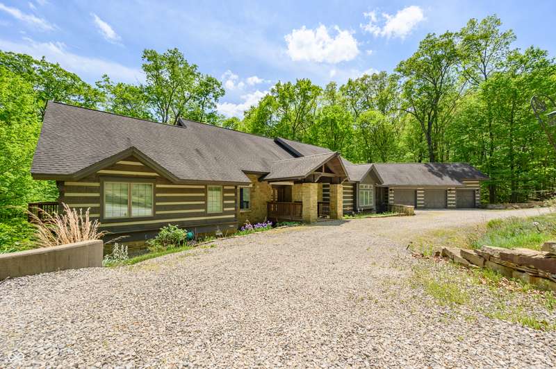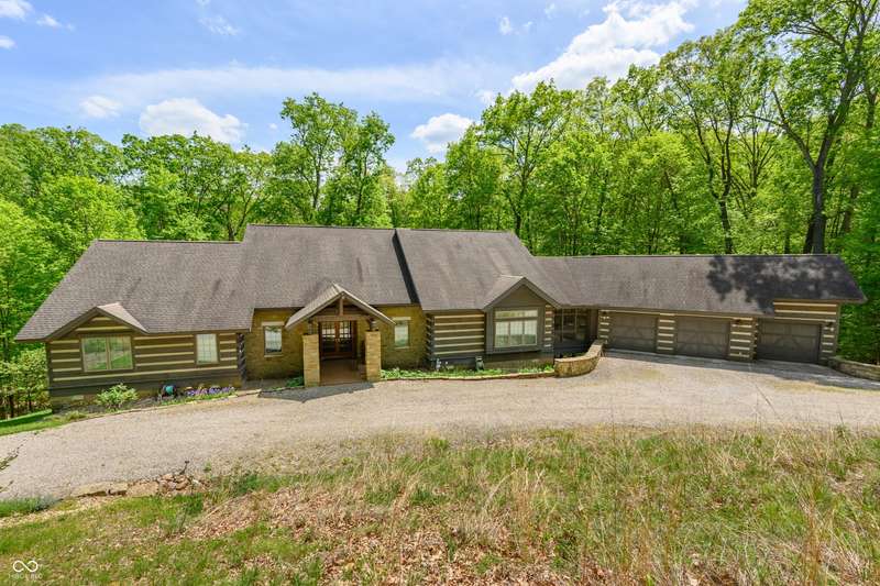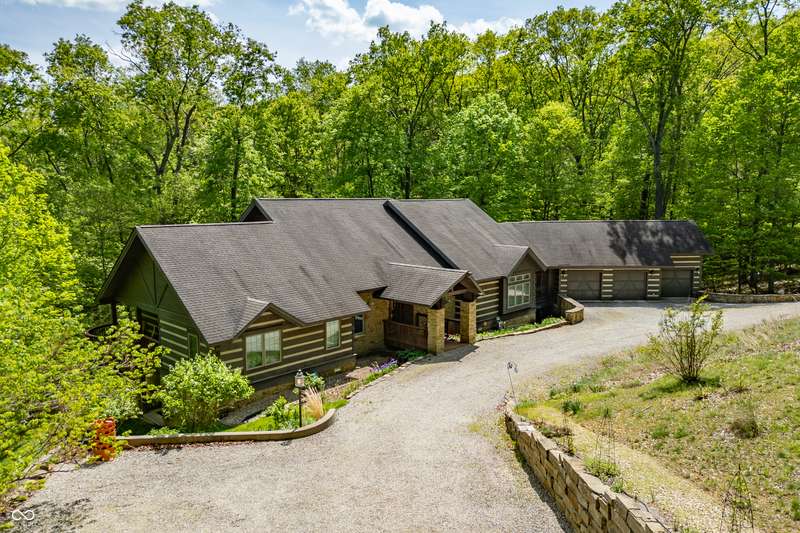 Bright and spacious luxury log home on 25 acres of mature forest. Expansive decking creates a treehouse effect and exceptional al fresco dining and entertaining space. Outdoor sculptures, including a bronze fountain piece, will remain with the cabin. Large Pella windows, ten-foot ceilings and accessibility features are throughout the home. The great room focal point is a floor to ceiling Brown County stone fireplace. Socializing with friends and family is taken to the next level with a wet bar, wine cooler, party fridge and ample area to present refreshments to guests. The dining room is ready to accommodate a banquet style table and chairs. The kitchen includes a dining area, solid surface counter tops, ample cabinetry/ pantry space, and high-end appliances. Split bedroom layout. Spacious owners suite with dual walk in closets and private bathroom with oversized threshold less glass wall shower and double sinks. Third bedroom/ library/den with built in bookcases and private deck. The lower level recreation room leads to storage and mechanical rooms, a workshop/ gym/ studio space and a back deck. Flexible basement layout could be re-envisioned for use as a separate living area, in-law quarters or create a home movie theater. Spacious screened porch with skylights and ceiling fans. An oversized three-car garage can comfortably accommodate multiple machines, gardening equipment and staging space for hobbies and outdoor pursuits. A built-in Walker Display System, with dedicated lighting, is in place for hanging fine art. The whole-home alarm system includes sensors to alert to smoke, excess moisture and other hazardous conditions. Separate thermostat controls on each level. All utilities are buried. Fiber internet. Generac generator. Conveniently located close to the town of Nashville, Bloomington and Columbus. Potential tourist home.