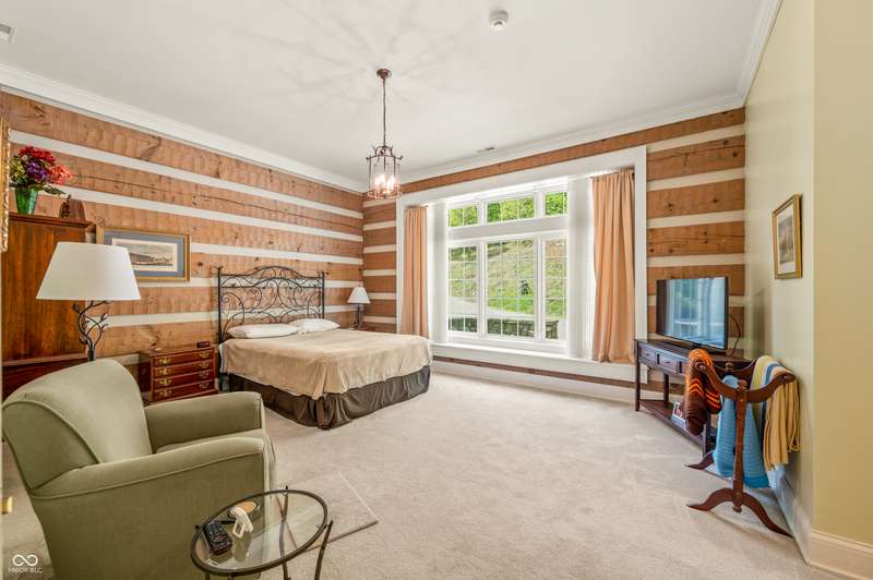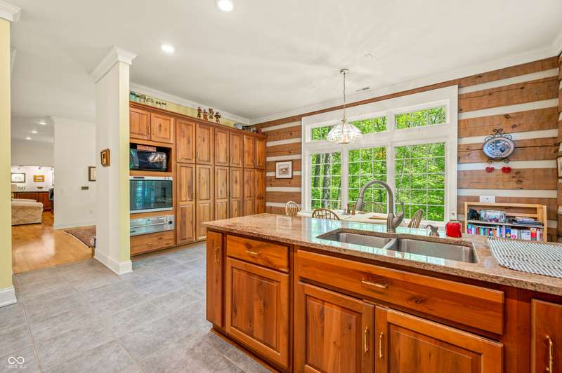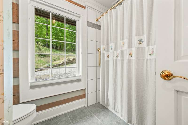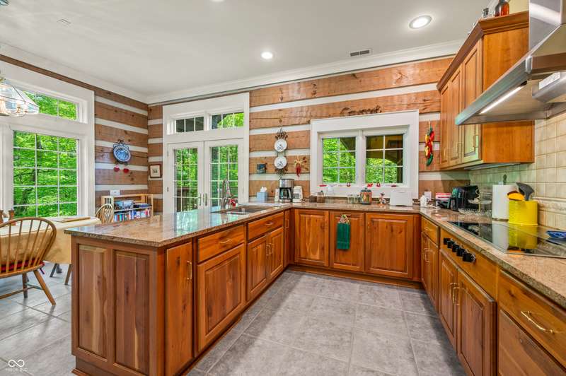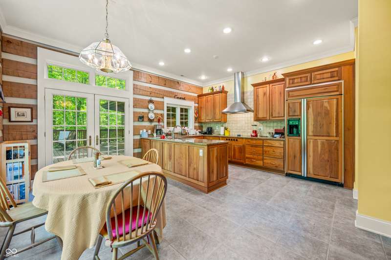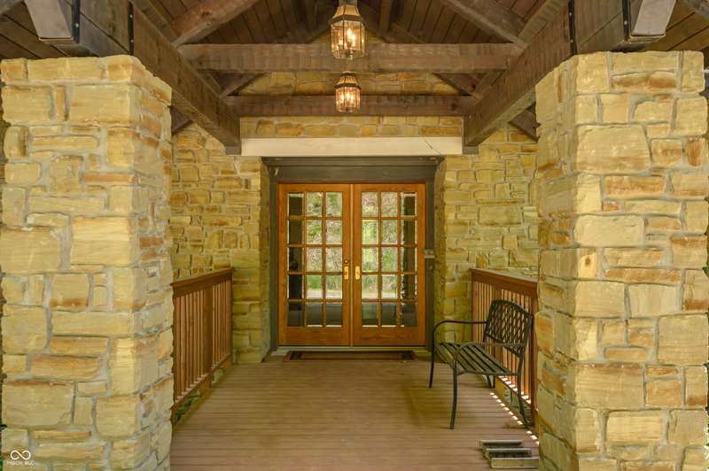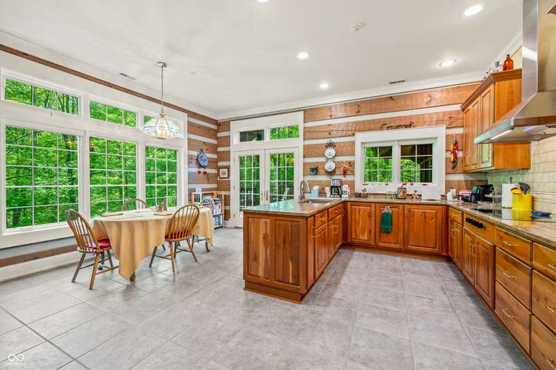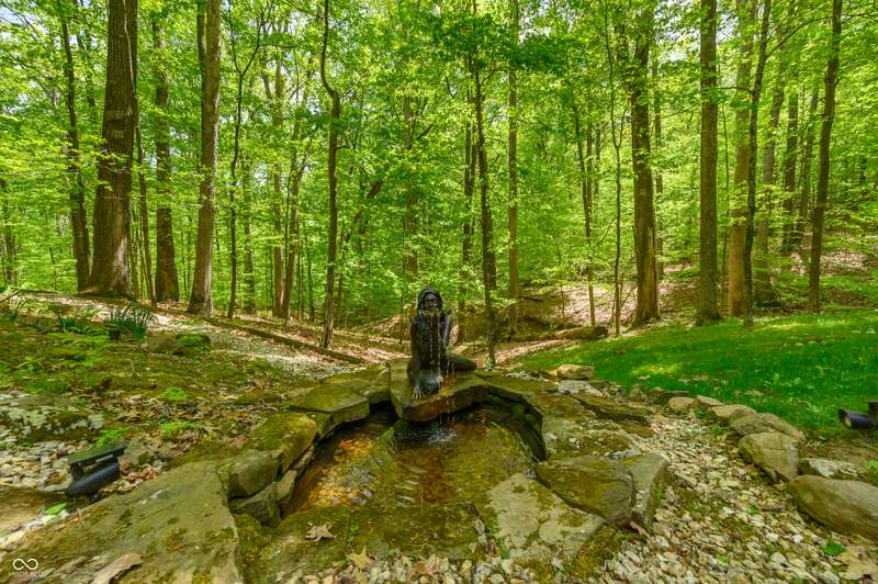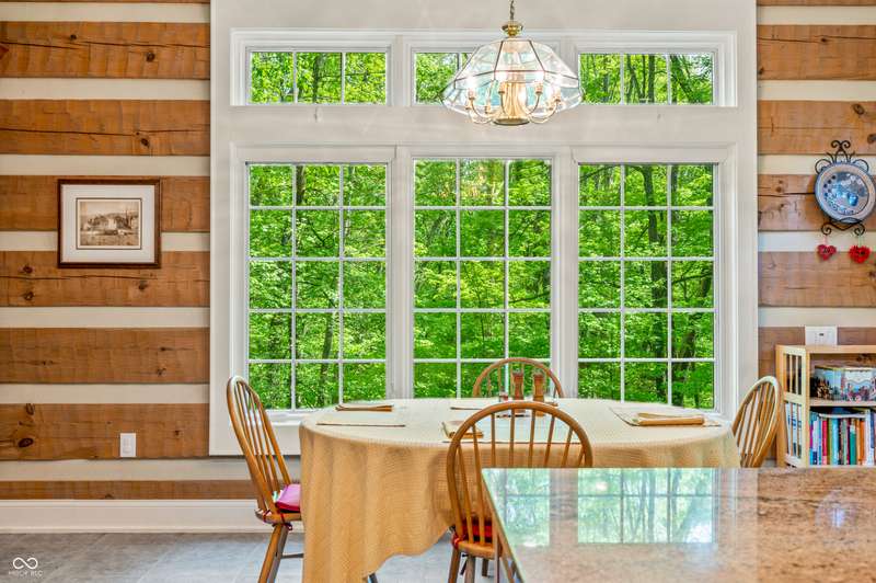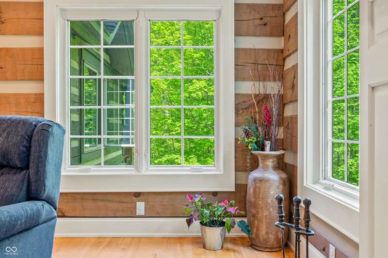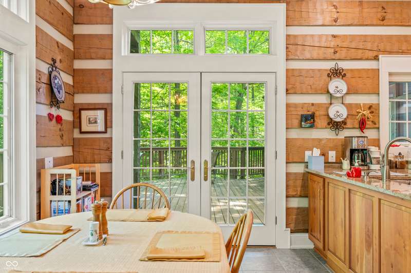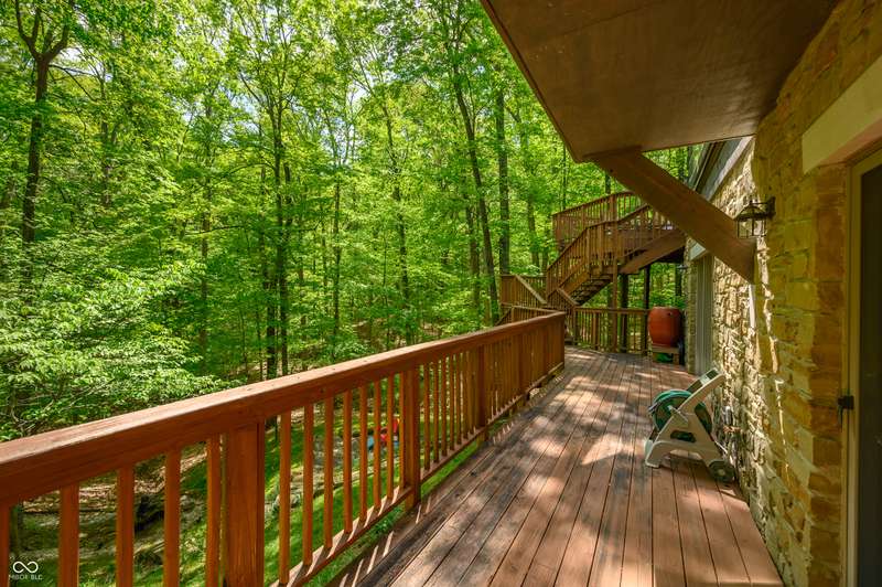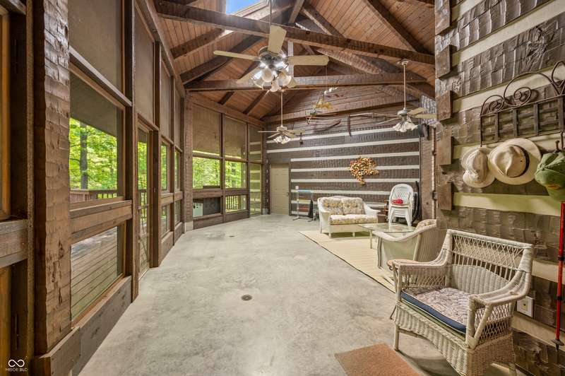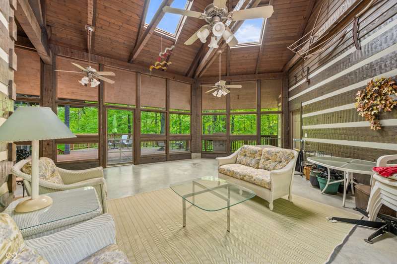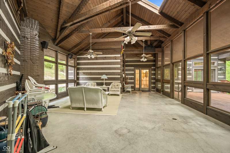 Bright and spacious luxury log home on 25 acres of mature forest. Expansive decking creates a treehouse effect and exceptional al fresco dining and entertaining space. Outdoor sculptures, including a bronze fountain piece, will remain with the cabin. Large Pella windows, ten-foot ceilings and accessibility features are throughout the home. The great room focal point is a floor to ceiling Brown County stone fireplace. Socializing with friends and family is taken to the next level with a wet bar, wine cooler, party fridge and ample area to present refreshments to guests. The dining room is ready to accommodate a banquet style table and chairs. The kitchen includes a dining area, solid surface counter tops, ample cabinetry/ pantry space, and high-end appliances. Split bedroom layout. Spacious owners suite with dual walk in closets and private bathroom with oversized threshold less glass wall shower and double sinks. Third bedroom/ library/den with built in bookcases and private deck. The lower level recreation room leads to storage and mechanical rooms, a workshop/ gym/ studio space and a back deck. Flexible basement layout could be re-envisioned for use as a separate living area, in-law quarters or create a home movie theater. Spacious screened porch with skylights and ceiling fans. An oversized three-car garage can comfortably accommodate multiple machines, gardening equipment and staging space for hobbies and outdoor pursuits. A built-in Walker Display System, with dedicated lighting, is in place for hanging fine art. The whole-home alarm system includes sensors to alert to smoke, excess moisture and other hazardous conditions. Separate thermostat controls on each level. All utilities are buried. Fiber internet. Generac generator. Conveniently located close to the town of Nashville, Bloomington and Columbus. Potential tourist home.