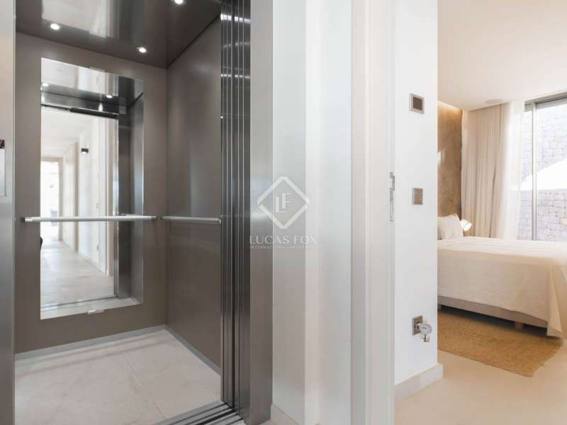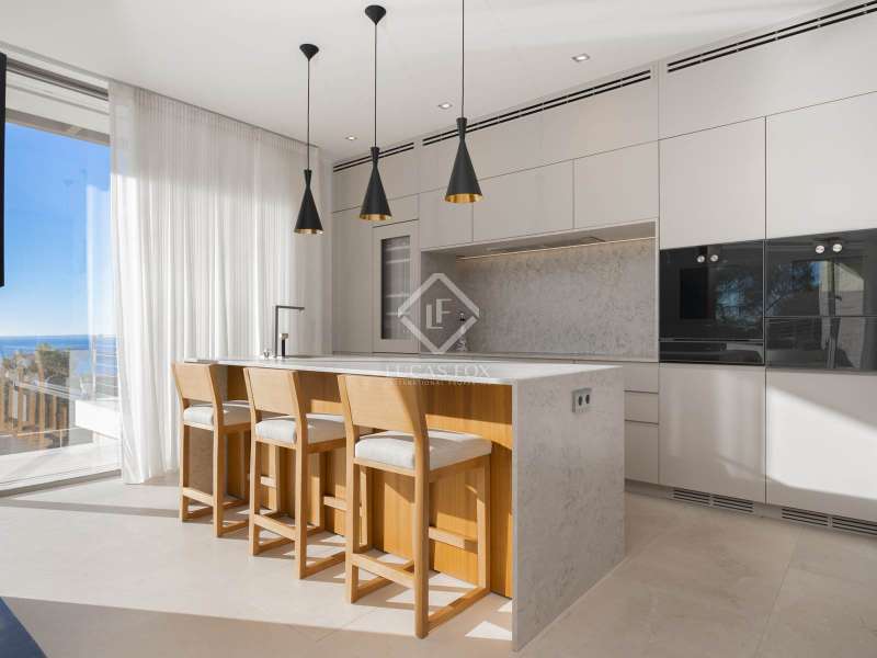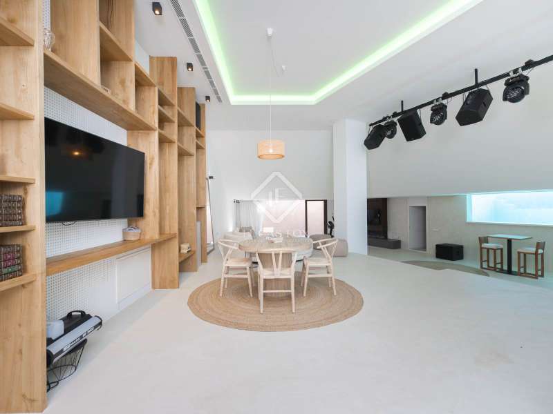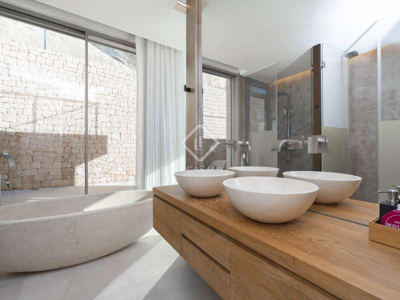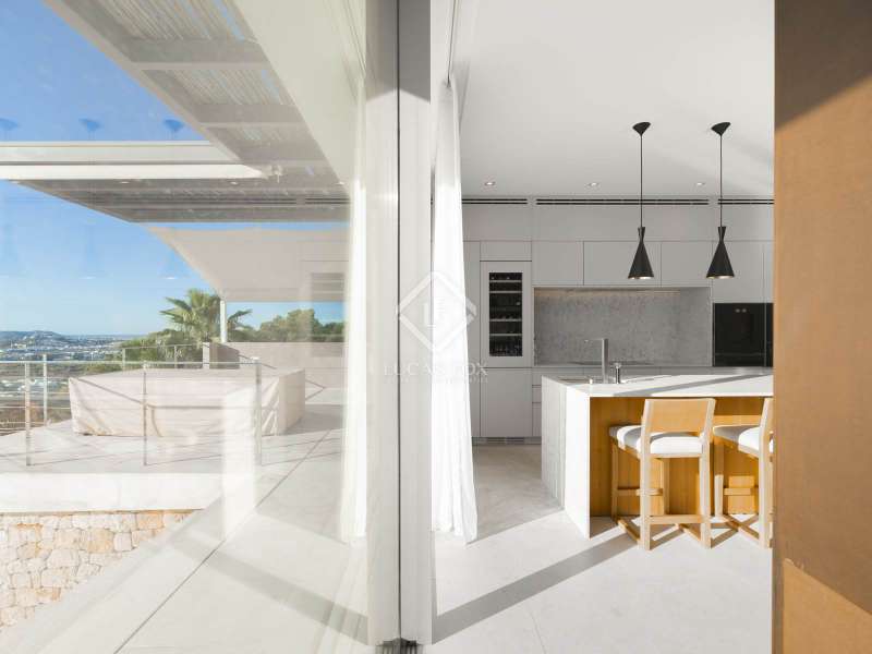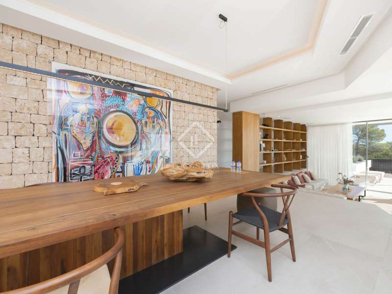 This opulent 462 m² villa epitomizes luxury living in the prestigious Can Rimbau neighbourhood of Ibiza, and with over 2,200 m² of land situated at the edge of the development, it allows residents to revel in total privacy. This villa boasts distinctive details, premium materials, and a thoughtfully designed layout which come together to create a truly exceptional home. We can enter the villa through the vibrant disco, featuring a professional sound system and pool-reflected ambient lighting. This versatile space extends to include a sauna and seamless outdoor access, ideal for moments of relaxation and disconnection from the stresses of daily life. Outside, the pool awaits, enveloped by breathtaking Mediterranean, Dalt Vila, and mountain scenery. Upstairs in the villa, we find the main entrance hall, kitchen, and living area showcasing panoramic outdoor views. On this level of the home, we encounter a dedicated office space for work or study, three elegantly appointed en-suite bedrooms with access to a shared terrace and an impressive main suite with an expansive terrace. The top floor of the villa invites you to elevate your experience with a private lift leading to a flawless finale: a rooftop terrace with a bar and a jacuzzi for unforgettable moments in complete privacy. The lower floor provides staff accommodation in the form of a studio apartment with an independent entrance, kitchen, and two additional guest rooms. This villa is a harmonious blend of sophisticated design, luxury amenities, and a prime location, offering an unparalleled living experience. Please contact us for further information.