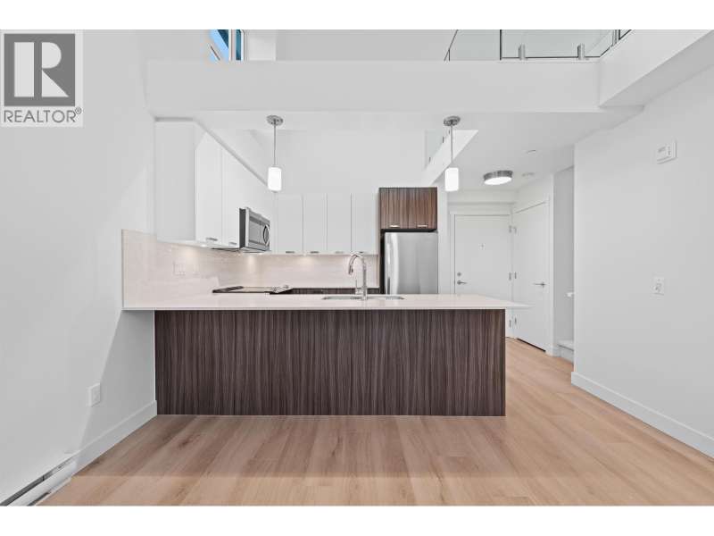 Elevated Loft Living - Now, a true 2 Bedroom at Edge 2. Renovated two-level loft-style penthouse in a substantially rebuilt building, located in the heart of Maple Ridge just steps to shops, dining, and transit. Unlike typical lofts, the upper-level bedroom is fully enclosed for true privacy, making this a functional 2-bedroom home. Soaring 18 ft ceilings and expansive windows flood the space with natural light. The modern kitchen features quartz countertops, soft-close cabinetry, and stainless steel appliances. The main level includes a spacious bedroom with walk-in closet and cheater en-suite. Laminate flooring throughout, custom shelving in upped bedroom closet. 1 parking and storage included. Pets and rentals welcome. (id:58403)