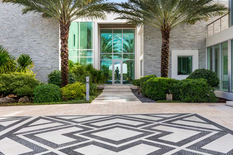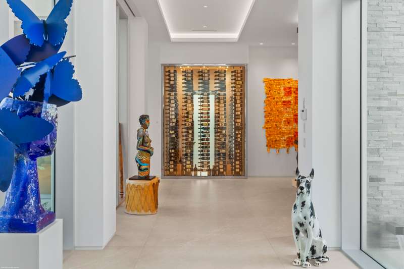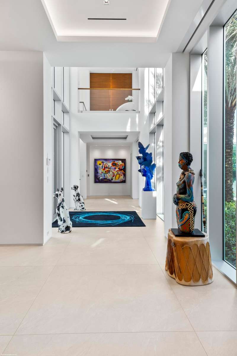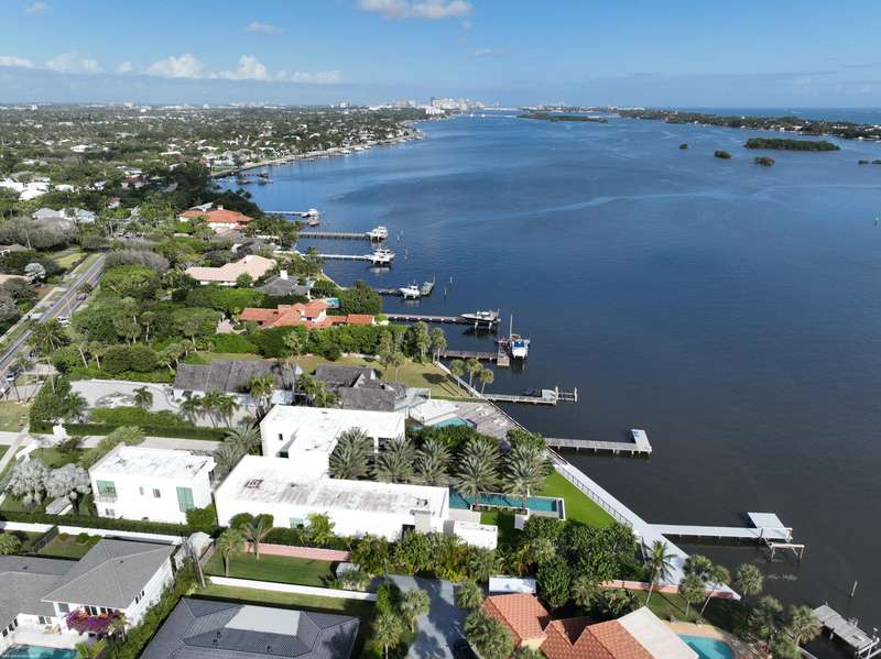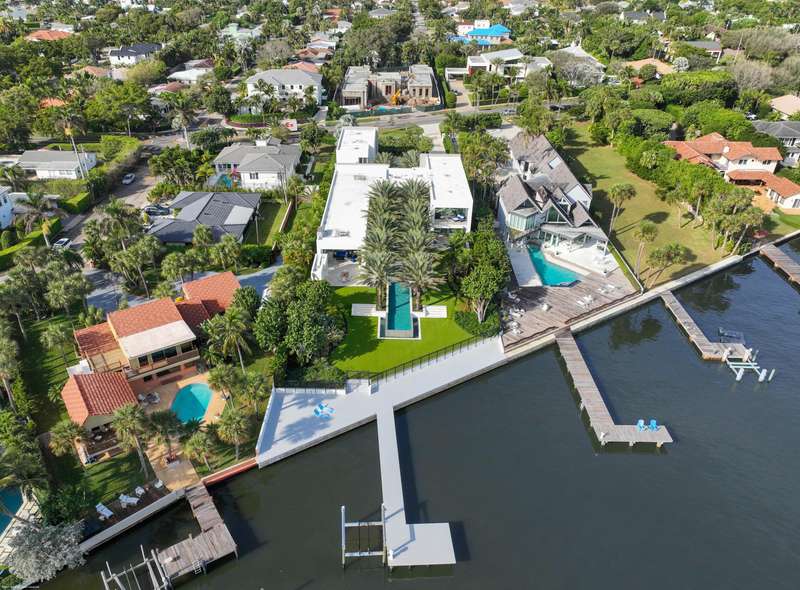 From the moment you enter the gates of this massive direct Intracoastal waterfront estate, you will experience first hand the hundreds of hours of creative design by famed and respected architect George Brewer. His vision coupled with the direction and inspiration from the owners' decades of world travels have created this stunning modern masterpiece that was completed in 2021.Water is the main focus as you experience it throughout this nearly one acre property. From the front entrance and its cascading fountains, to the walls of glass that frame the entire eastern elevation of the home showcasing the massive resort style pool and turfed courtyard including a unique acrylic heated spa actually sitting in the water, to the expansive Intracoastal waterfront that has one of the