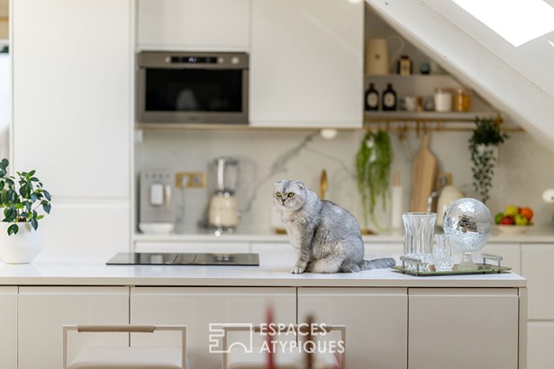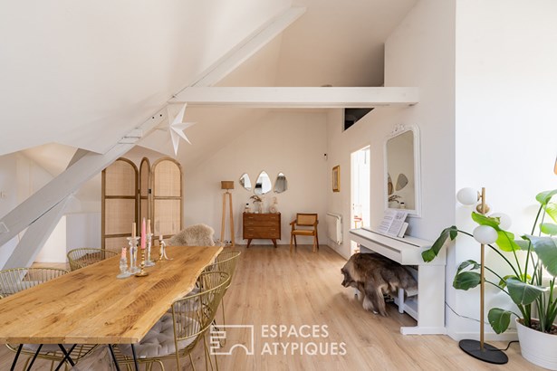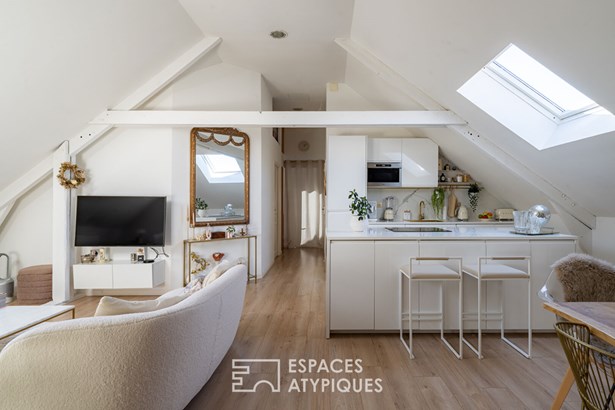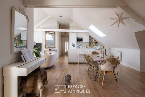 Upon entering, the beautiful attic living room captivates with its exceptional brightness, enhanced by large skylights and an elegant set of exposed beams. The open, equipped kitchen with clean lines blends perfectly into this welcoming space.