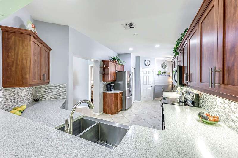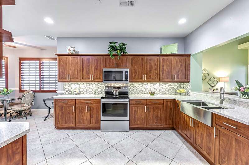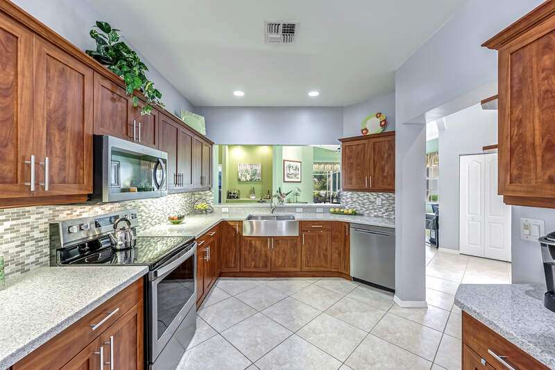 BACK-UP OFFERS WELCOME - KICK-OUT CONTINGENCY IN PLACE - Charming Villa in Heritage Greens with Golf & Lake Views. Welcome to this beautifully updated 3-bedroom, 2.5-bath villa offering serene views of the Arrowhead Golf Course and tranquil lake, along with your own private screened-in pool - perfect for enjoying sunny Florida days. Set on a wide, meticulously landscaped lot, this residence features a thoughtfully designed floor plan with high vaulted ceilings and beautiful finishes throughout. The owner's suite is a true retreat, complete with private pool views, a spacious walk-in closet, and a luxury bath featuring dual vanities with custom cabinetry, quartz countertops, and a spa-inspired frameless glass shower. The third bedroom includes its own ensuite, ideal for guests or multi-generational living. The kitchen is a chef's delight, boasting a farmhouse apron sink, stainless steel appliances, and generous counter space perfect for an espresso bar or culinary prep. Additional features include a spacious laundry room with overhead cabinets, a two-car garage with overhead storage, storm protection, space for indoor-outdoor entertaining by the pool and more! The roof, a/c and water heater have all been updated. Heritage Greens offers low HOA fees and an array of amenities including tennis and pickleball, multiple community pools, a fitness room, basketball court, playground, clubhouse, and on-site property management. The Arrowhead Golf Course is a public facility offering both membership packages and pay-as-you-play options, with a convenient pub for post-game refreshments or simply grab a bite to eat. Conveniently located in North Naples with easy access to top-rated dining, shopping, and entertainment. CCPS shows "A" rated schools. Your Florida lifestyle awaits - imagine the possibilities!
