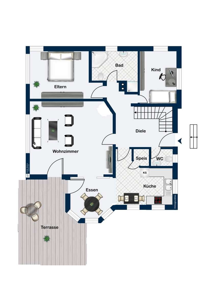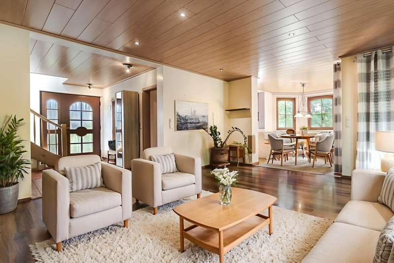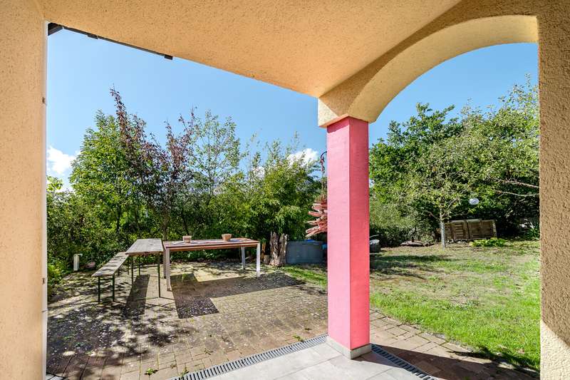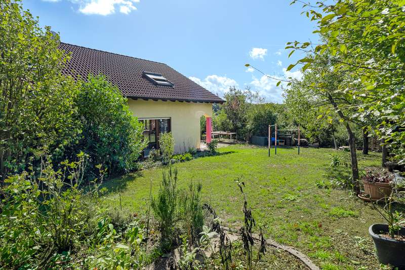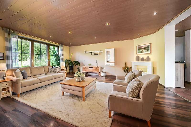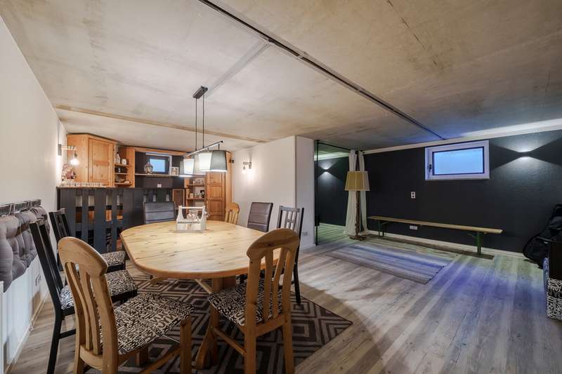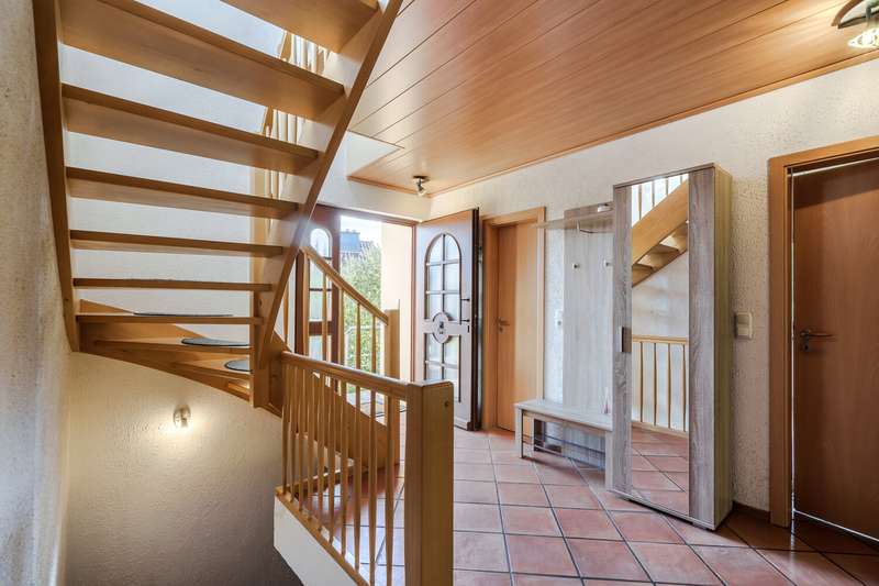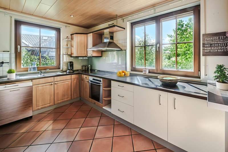 This well-kept, sunny detached house built in 2000 is located in a quiet residential area of Grävenwiesbach-Zentrum that is particularly popular with families with children. The neighborhood is characterized by detached houses, lots of greenery and a very pleasant, friendly atmosphere. The upper floors offer an impressive panoramic view of the surrounding area. With a living space of around 190 m², the house has a total of six rooms, including up to five possible bedrooms, which opens up a wide range of design and usage options, especially for families with many children. The spacious first floor welcomes you with a bright hallway, fitted with real terracotta tiles, which also create a cozy overall impression in the guest WC, staircase, kitchen, dining area and basement vestibule. The living area has a renewed laminate floor, in the dining area you will find a cozy sunny dining area with a large solid corner bench and a dining table with pull-out function. The two other rooms on the first floor are ideal as a separate parents', guest or work area. The daylight bathroom, also located on the first floor, boasts a corner bath, separate shower, ladder radiator, washbasin and WC. Living on one level is therefore very possible here. There are three bedrooms, a daylight shower room and a spacious storage room on the top floor. Two of the rooms enjoy direct access to the large sunny balcony with a wonderful panoramic view! The house has a full basement and impresses with a large, comfortably converted hobby room with new laminate flooring and a cellar bar. Whether as a fitness area, home cinema or children's playroom - the design is up to you. There is also a separate guest WC and shower in the basement. The high-quality materials used in the construction are impressive: solid exterior walls in Poroton with additional insulation ensure durability and a pleasant indoor climate. The double-glazed wooden sash windows have removable bars and are fitted with manual shutters. Heating is provided by a central heating system from the year of construction. A fiber optic internet connection is possible. The outdoor areas are equally inviting: the large, partially covered terrace offers you complete privacy - thanks to the ingrown garden, you can always keep to yourself here. The balcony balustrade has been renewed, the garden fence provides a clear boundary, paved access and parking spaces round off the overall structure. There is a carport for your vehicle, supplemented by two further parking spaces. The house is in a condition commensurate with the year of construction. It has been lived in exclusively by the owners since it was built and is now waiting to be adapted to the individual ideas and wishes of a new family. Discover this house with character, many rooms and absolutely individual use on a quiet corner plot - the best conditions for your new home. Please feel free to arrange a viewing appointment.