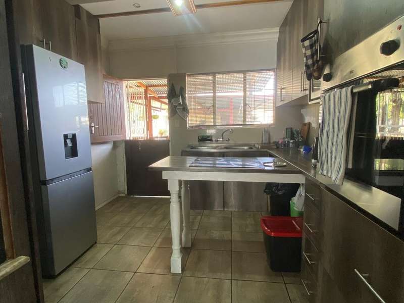 Discover comfort and versatility in this well-maintained 3-bedroom, 1-bathroom home, perfectly complemented by two 1-bedroom flatlets, each with its own kitchenette and bathroom – perfect for extended family or generating rental income. The home boasts a modern fitted kitchen with an electric hob and eye-level oven, a spacious lounge with parquet flooring, and a dining room ideal for family gatherings. Step outside and enjoy your very own entertainment haven – a big yard with newly refurbished swimming pool, patio with built-in braai, verandah and cozy seating area, perfect for hosting friends and family. Additional features include: Workshop for all handyman projects Carports for 4 vehicles Income-generating flatlets Spacious yard with plenty of potential This property offers the best of both family living and investment opportunity. Don’t miss out – homes like this are rare to find!