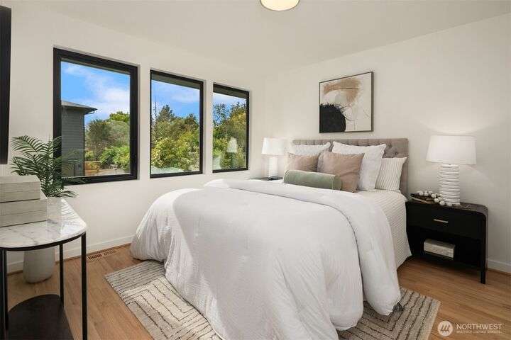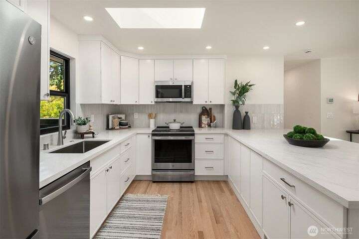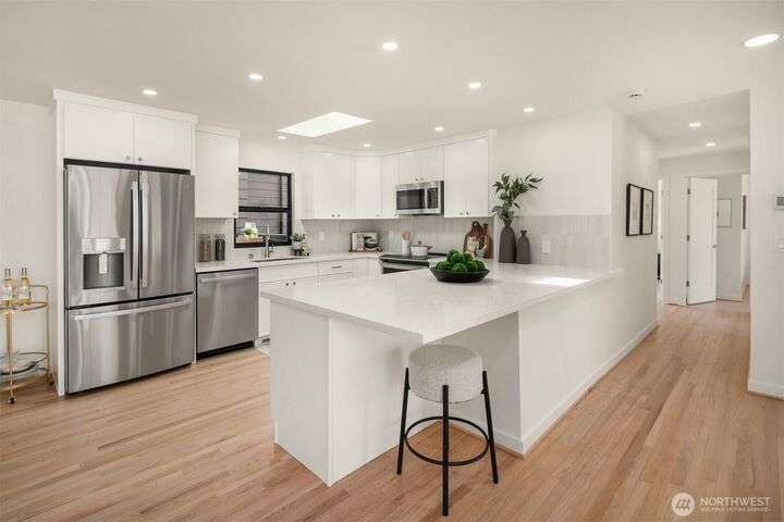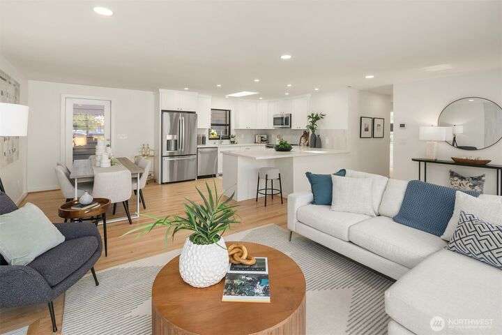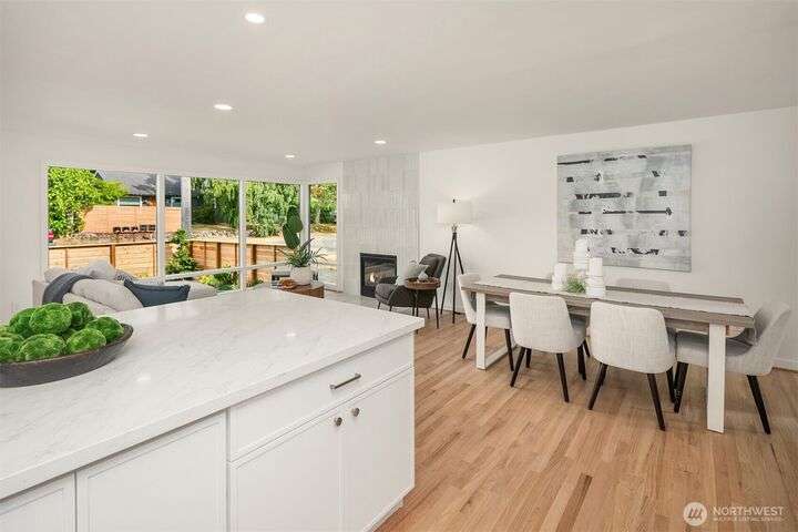Beautifully remodeled 4-bedroom home in Seattle’s Bitter Lake neighborhood blends modern updates with classic charm. The spacious main level features an open-concept living and dining area with new hardwood floors, a gorgeous tiled gas fireplace, and abundant natural light. The new kitchen boasts quartz countertops, stainless steel appliances and stylish cabinetry. Four generous bedrooms offer flexible living, work-from-home, or guest space. Lower level rec room and laundry area. Enjoy new bathrooms with heated floors, new systems, new windows and thoughtful finishes throughout. One car attached garage. Convenient location near Bitter Lake Park, trails, shopping, and easy commuter access. Move-in ready and full of possibilities!