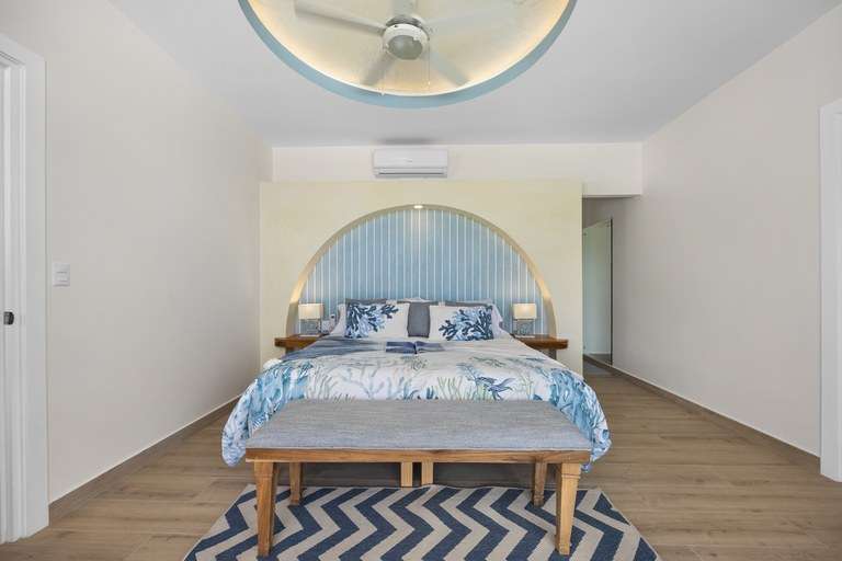 The home features four master suites, each inspired by Cote Sur, a French magazine, and designed with unique ambiance and luxurious finishes. One suite exudes a calm coastal vibe, showcasing soft blue and white tones. Another suite embraces tropical elegance, featuring delicate palm leaf patterns hand-painted on the walls and ceiling. A third suite presents a striking black-and-white, tribal African-inspired theme, while the fourth suite boasts a fresh tropical ambiance with soothing lime-green accents and bamboo paneling.