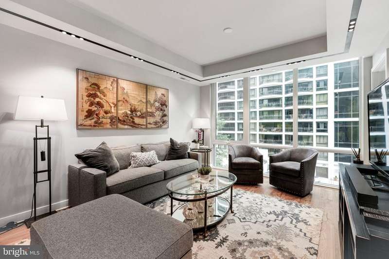 Substantial (100 k) Price Reduction !!! Welcome to luxury living at its absolute finest at the Pierce, Rosslyn's newest condominium offering the ultimate in luxury and convenience. Prime location with a 96 out of 100 walk score : Short walk to Rosslyn's and Courthouse METRO stations, 25 minutes walk to Georgetown, 10 minute drive to Reagan National airport or the Kennedy center!! Unit 303 has a sought after open floor plan offering a total of 1270 sq ft featuring living and dining spaces open to a gorgeous kitchen, one bedroom plus DEN, two full bathrooms, a separate laundry room and TWO PARKING SPACES that convey with the unit. This lovely unit has floor-to-ceiling windows enhancing views and day light, exceptional finishes including hand -scraped hickory floors, high tray ceilings and museum quality lighting throughout. The modern high end kitchen features Sleek Snaidero cabinets with quartz counter tops and Thermador appliances including a gas cook top. The island with its seating for 4 and waterfall counter tops makes cooking and entertaining a true delight !! The primary suite has a custom designed walk in closet, a second wall closet and a gorgeous spa like bathroom with heated marble floors, walk in glass shower and marble counter tops. The Den is spacious and can be used as a study or guest bedroom with easy access to the second full bathroom that has a soaking tub/ shower , marble floors and marble counter tops. A separate laundry room with a full size washer and dryer and a utility sink just adds to the convenience and ease of living in this home. The Pierce offers an unmatched amenity package including a rooftop terrace with spectacular views of DC monuments and the Potomac river, grills, multiple dining and lounge spaces, and an outdoor gas fireplace. Adjacent to the rooftop terrace is the pool with cabanas, lounge chairs and impressive views. The penthouse-level owner's club provides another jaw-dropping space to gather or work, with a gas fireplace, multiple gathering spaces, tables, and a bar; It can be rented out for private, catered events. The two-story fitness center is down the hall from unit 303; it includes cardio equipment, weights, and a yoga studio. Additional amenities include a conference room, on-site bike storage, electric vehicle charging stations and a dog-washing stations. The 24/7 concierge manages deliveries, welcomes guests, and assists with residents needs.