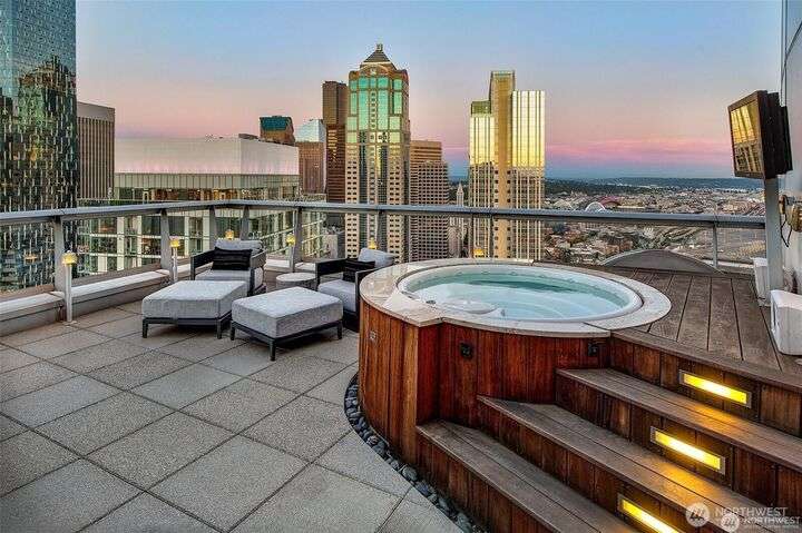 PENTHOUSE perfection-Perched atop the southeast corner of one of Seattle’s most coveted buildings, this exceptional two-level penthouse offers a rare blend of uncompromising luxury, privacy, and awe-inspiring views. Wrapped with floor to ceiling windows this home is flooded with natural light. A sky-high sanctuary capturing the very essence of PNW living, views stretch across the Sound to the Olympics, including views of the Seattle Great Wheel. Timeless elevated finishes through out the home. Arguably the best PRIVATE rooftop deck in the city, includes kitchenette, beverage center, kegerator, Jacuzzi,outdoor TV & speakers, gas fireplace, built-in Wolf BBQ. World class building & location.PIKE PLACE Market is you next door neighbor-2parking
