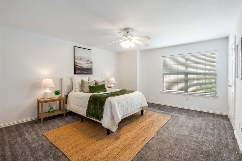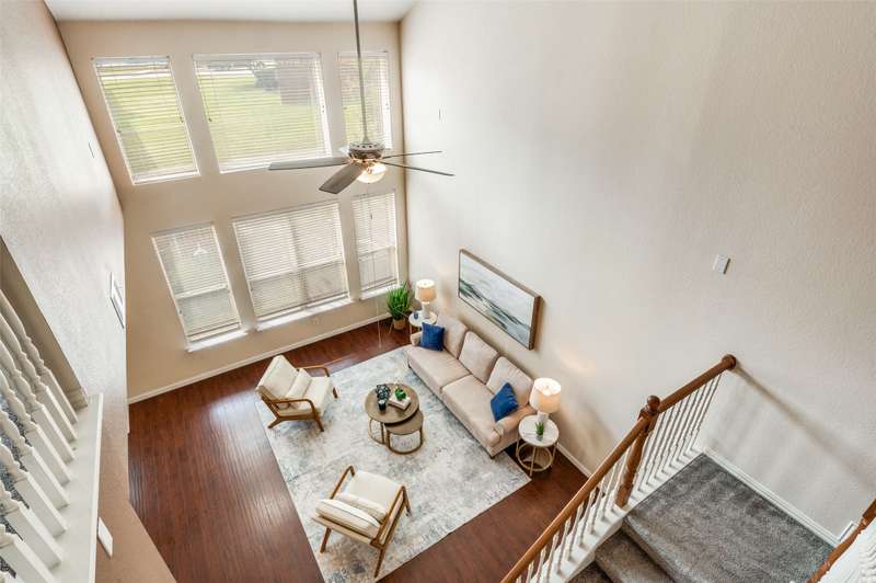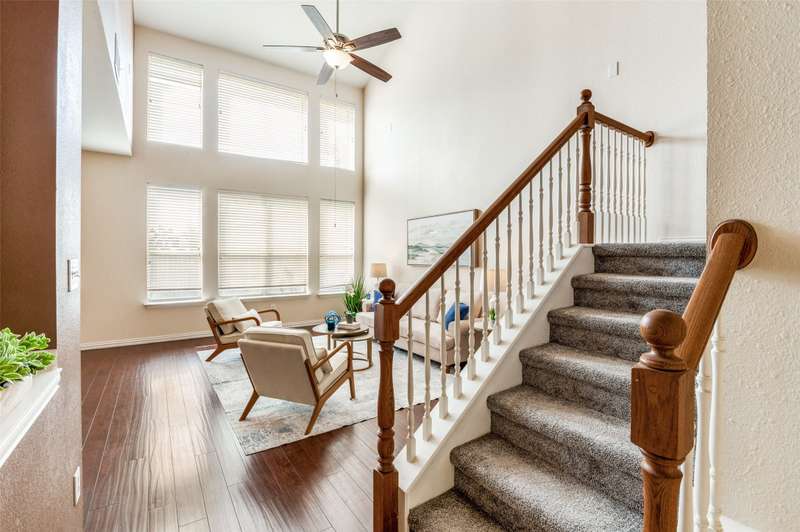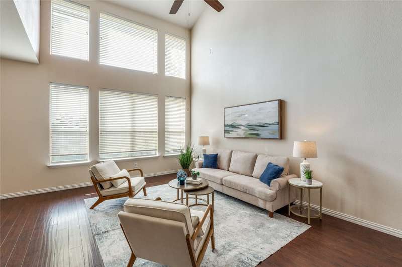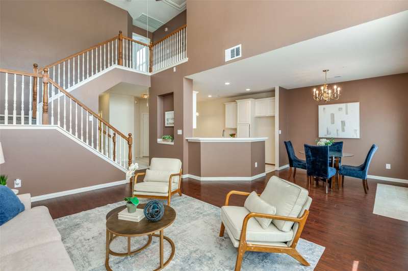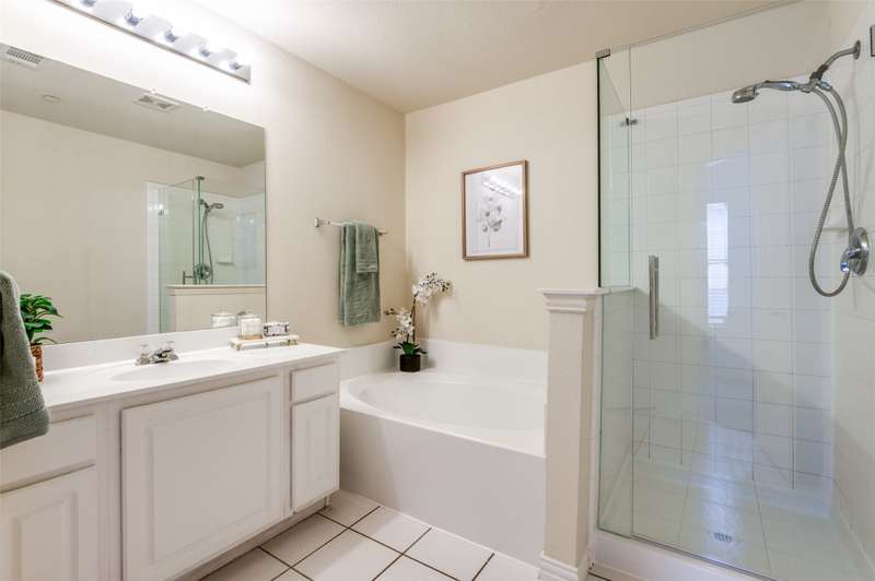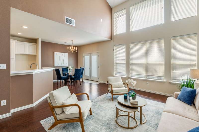 Bright and open with tall ceilings and a wall of windows in the living room that flood the room with natural light. The open feeling continues in the delightful dining area with french doors that lead to a small patio, perfect for a small garden or pet. The kitchen is well equipped with good storage and prep space PLUS a breakfast nook. The utility room is nearby with additional room for storage. A powder bath completes the first level. There are two spacious bedrooms upstairs, each with an ensuite bath. The primary bathroom has a separate tub and shower. Air purification system installed inside HVAC ductwork. Residents enjoy two pools and well maintained grounds so upkeep is never an issue and you can leave the lawnmower behind. The convenient location close to Central Expressway makes it easy to get downtown for business or pleasure and popular restaurants and shops are nearby. This is a wonderful option for downsizing or first time homeowners in a central Plano location!
