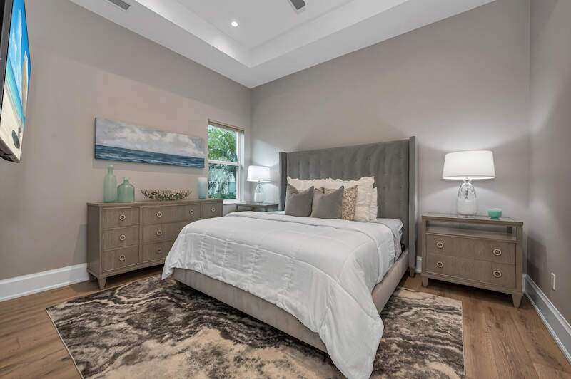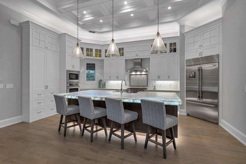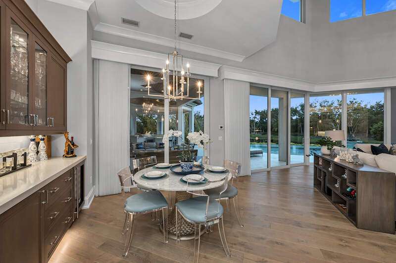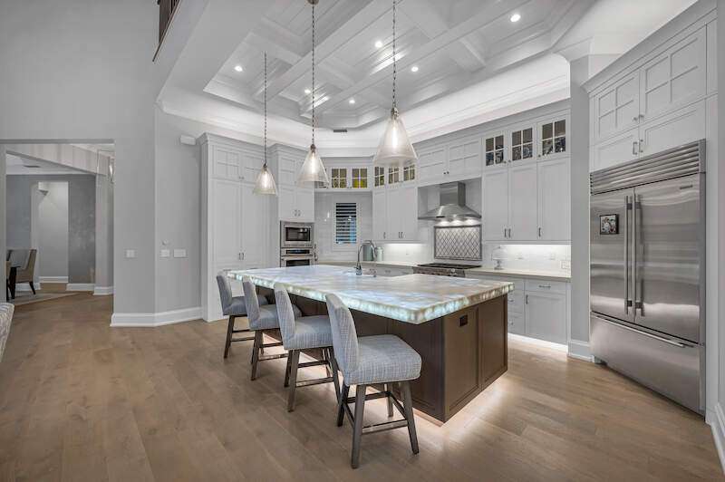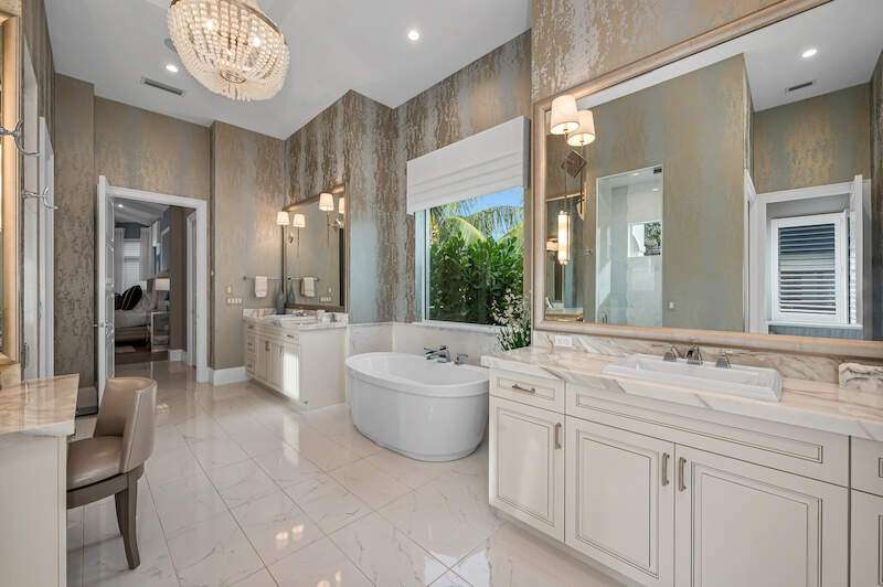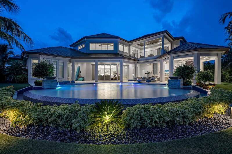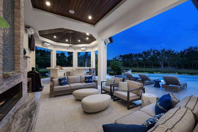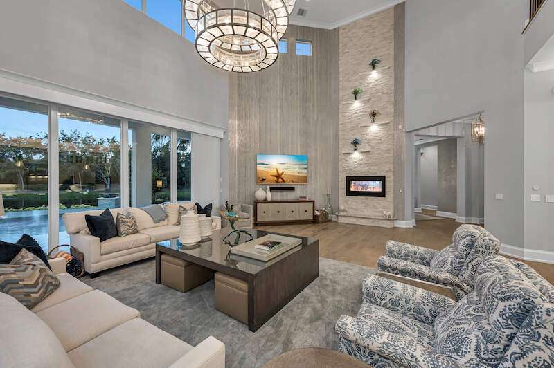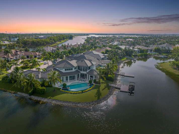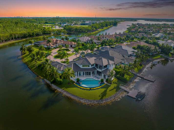 The ultimate waterfront lifestyle awaits in this exclusive Estate property with private dock in Miromar Lakes Beach & Golf Club. Perfectly designed on a private peninsula waterfront homesite, this magnificent 5-bedroom residence showcases exquisite architectural details. The centerpiece is a soaring, open-concept great room with grand chandelier & lighted 24-foot dual-sided linear gas fireplace. Design features include white oak wood flooring, tongue-and-groove and wood beam ceiling details, designer tile, open concept gourmet kitchen, butler's pantry, and back-up generator. The primary suite offers a gracious bath with dressing area, steam shower, 3 walk in closets including a hers dressing room and separate entry. The second-floor with elevator access includes a game room, en suite bedroom, and open-air balcony. The outdoor oasis offers living room, fireplace, cooling system, electric screens, fully turfed yard with sprinkler system, wrap-around bar with grill and resort-style saltwater infinity edge pool, spa, outdoor shower, private dock. Tesla charger, AC garages, and home gym which can be converted back to additional garage. This is the perfect property for a discerning buyer looking to immediately begin enjoying the Miromar Lakes lifestyle and its unparalleled waterfront living. As the only southwest Florida community with miles of beach, boating, golf, and resort-style amenities in one picturesque destination, it offers a truly remarkable lifestyle. Water-ski, paddle board, kayak, sail, or fish on the 700-acre freshwater lake, unwind at the wellness spa, play the Arthur Hills "Signature" championship golf course, hone your tennis, or pickleball skills, or simply relax in the dreamy beachfront cabanas. Located minutes from Southwest Florida International Airport, world-class beaches, shopping, and dining.