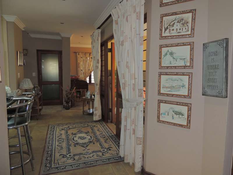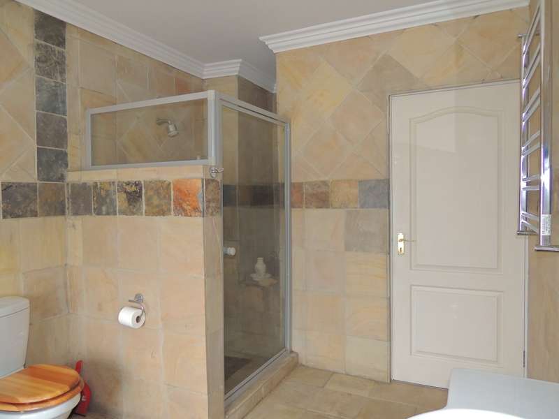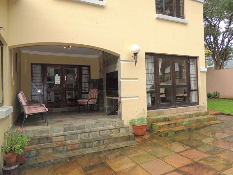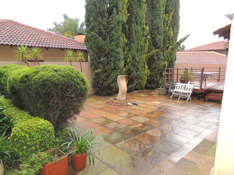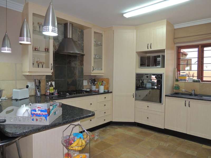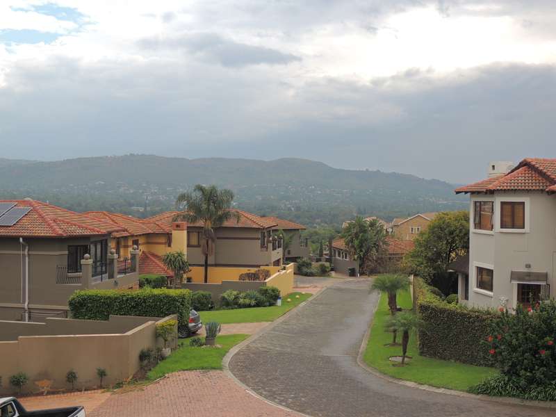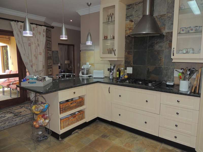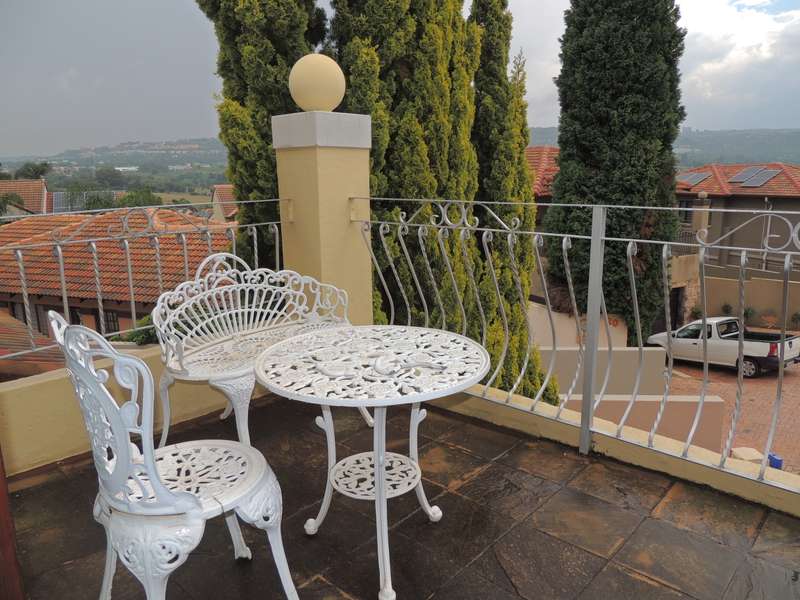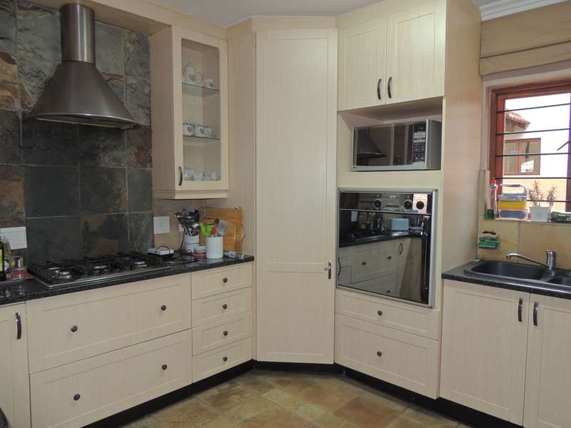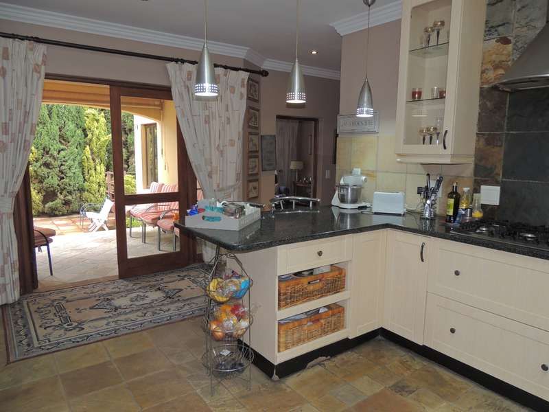 This charming duplex townhouse is located within a lovely estate of only thirty-nine units, offering a peaceful and secure environment. The property sits on a 464 square meter stand, featuring beautiful finishes throughout. Downstairs: The home welcomes you through double wooden doors into a warm and inviting space. The lounge area boasts carpeted flooring and underfloor heating, providing comfort and a cozy ambiance. From here, you have access to a wooden deck, perfect for outdoor relaxation. The remainder of the downstairs area features natural beige slate tiles, enhancing the home’s elegance. The dining room, located nearby, opens up through double wooden doors into a slate-tiled courtyard. The kitchen is equipped with a five-plate gas hob, an eye-level oven, an extractor fan, and ample space for an undercounter appliance and a double-door fridge. The granite countertops add a touch of luxury. From the kitchen, you step into a patio fitted with a built-in braai, electrical points, and serving counters, providing an ideal space for dining and entertaining. Fitted canvas roll-up blinds added convenience and weather protection. A guest loo is also located downstairs for added convenience. Upstairs: Upstairs, the property features three generously-sized bedrooms, all with plush carpeting. The main bedroom is particularly spacious, filled with natural light, and has doors leading out onto a private balcony that offers breathtaking views of the estate and the distant mountains. The en-suite bathroom is well-appointed with a corner tub, towel-warming rack, washbasin, toilet, bidet, and shower, all finished in natural slate for a stylish and earthy feel. The second bathroom offers a bath, basin, toilet, and towel-warming rack. Outdoor Area: The property boasts a well-established, neatly manicured garden that enhances its charm. There is also a wooden hut in the garden, providing additional storage. For parking, there is ample space for four additional vehicles, as well as a double automated garage with room and facilities for a washing machine, including water inlets and outlets. Additional Features: The property offers pre-paid electricity, ensuring full control over your energy usage. This townhouse is a perfect blend of comfort, luxury, and practicality.