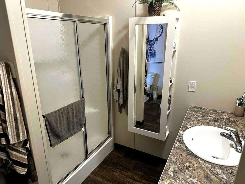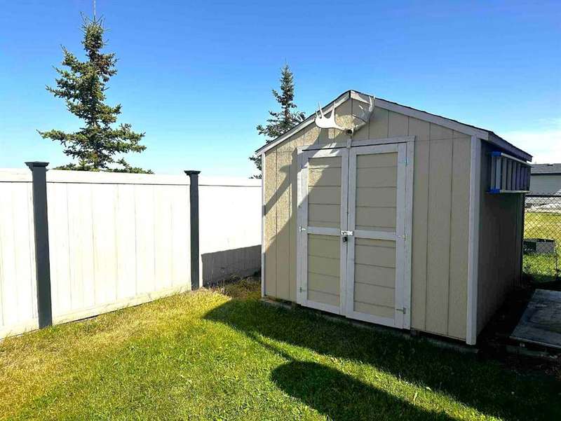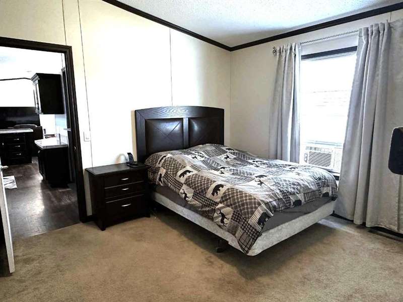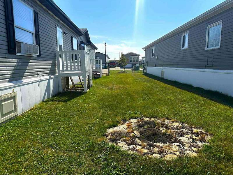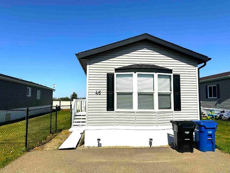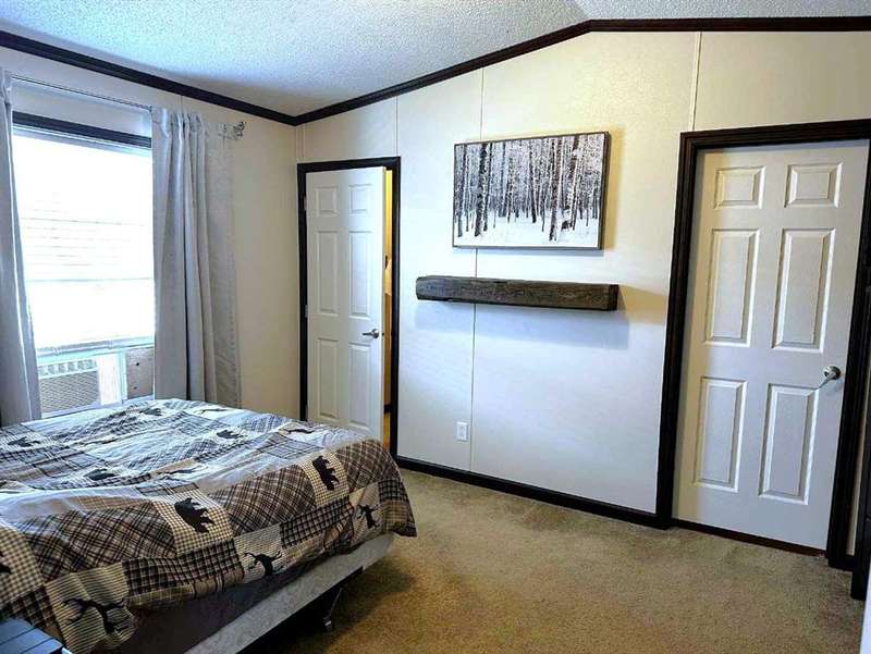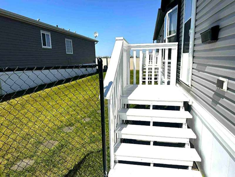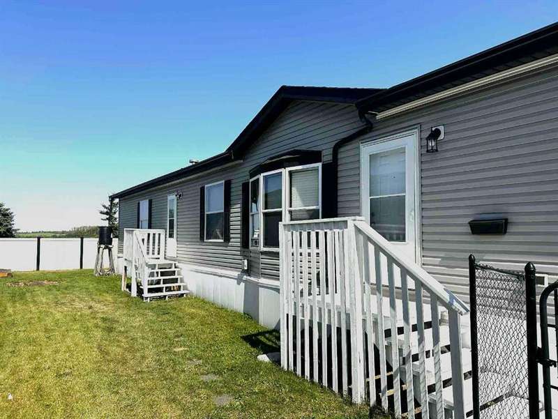 MOVE IN READY home in McKay Ranch! This 3 bedroom 2 bathroom home offers easy main floor living in a well kept bungalow on a quiet street. This open floor plan provides lots of light with big windows and VAULTED CEILINGS. The kitchen is spacious and functional with loads of cabinetry and storage. The primary bedroom is at the back of the home and has a four piece bath with separate shower, large SOAKER TUB and WALK IN CLOSET. The laundry room and second entrance to the home is located just off the kitchen and bedroom as well. At the front of the home there are 2 more good sized rooms and a full bathroom. Outside the yard is partially fenced and has a shed for your lawn mower, garden tools etc. This home is in the new phase of East Blackfalds, is close to walking trails and offers quick access to highway 2A. It has been very well kept and ready for it's new owners! Lot rent includes snow removal and lawn mowing. Pets allowed with park approval.