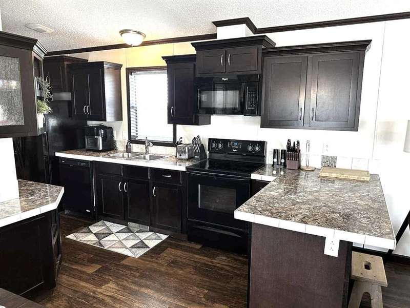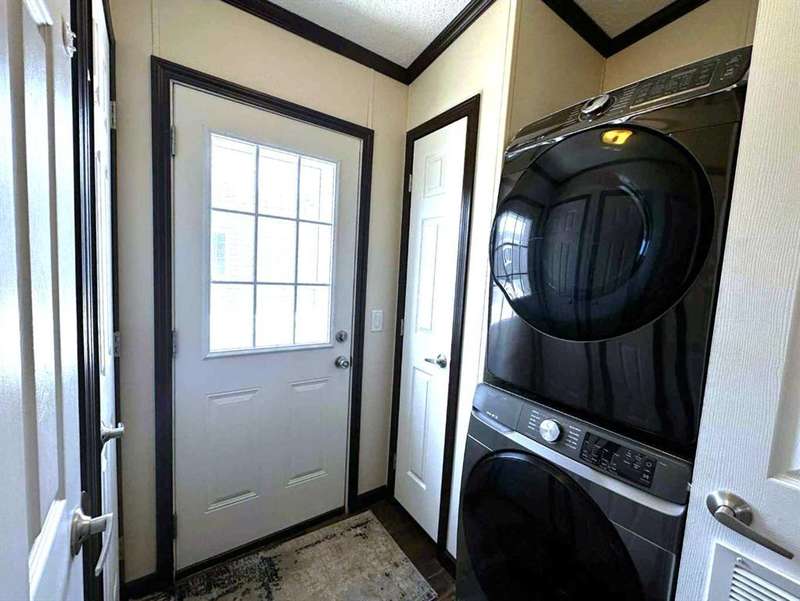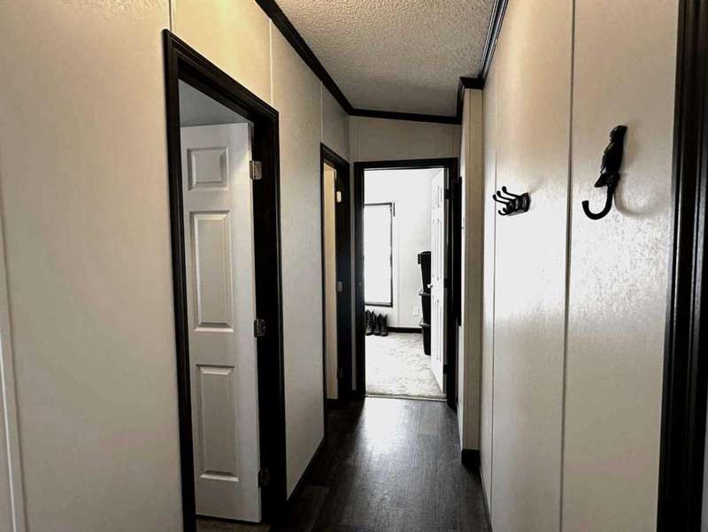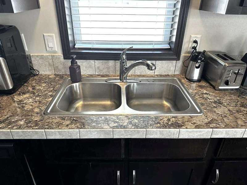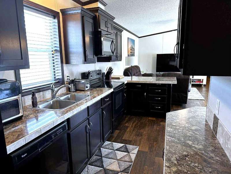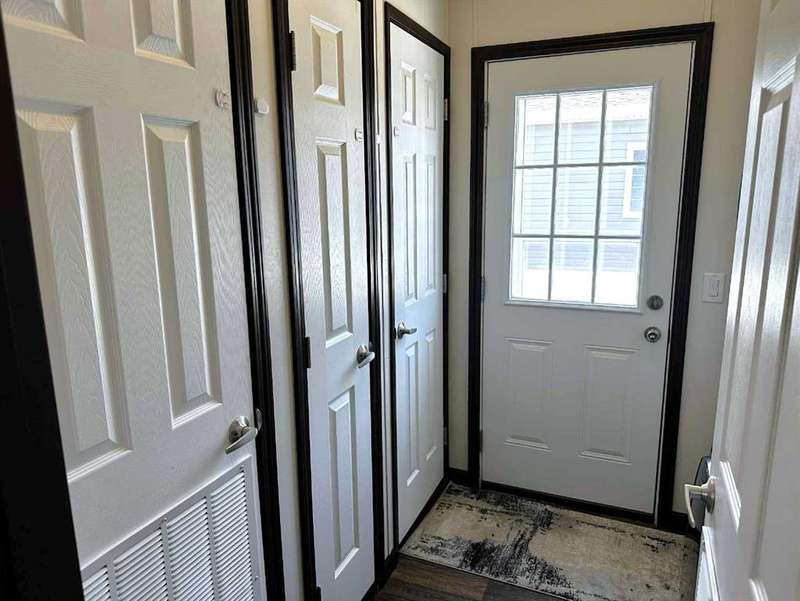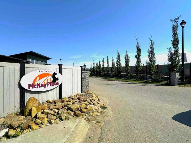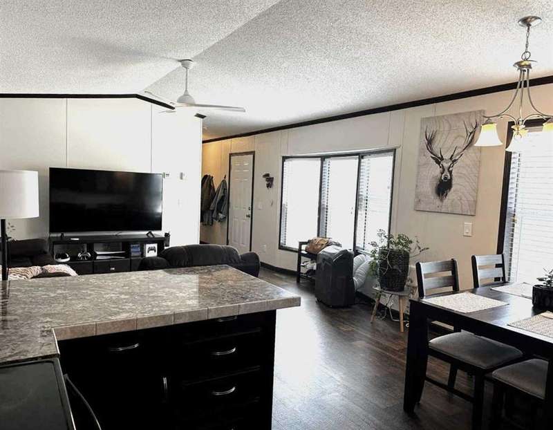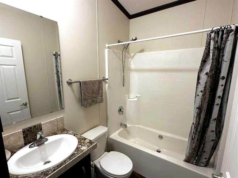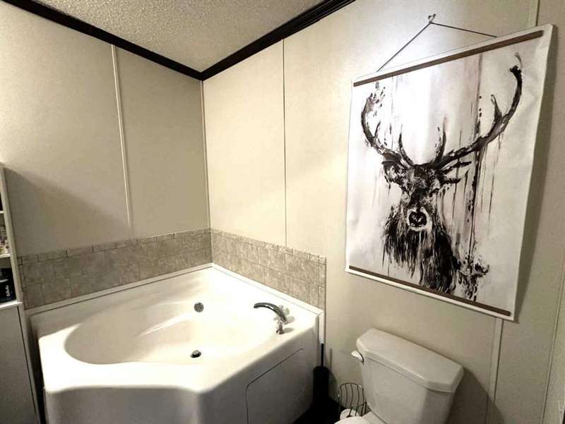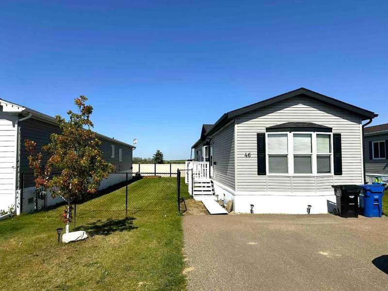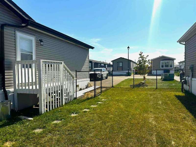 MOVE IN READY home in McKay Ranch! This 3 bedroom 2 bathroom home offers easy main floor living in a well kept bungalow on a quiet street. This open floor plan provides lots of light with big windows and VAULTED CEILINGS. The kitchen is spacious and functional with loads of cabinetry and storage. The primary bedroom is at the back of the home and has a four piece bath with separate shower, large SOAKER TUB and WALK IN CLOSET. The laundry room and second entrance to the home is located just off the kitchen and bedroom as well. At the front of the home there are 2 more good sized rooms and a full bathroom. Outside the yard is partially fenced and has a shed for your lawn mower, garden tools etc. This home is in the new phase of East Blackfalds, is close to walking trails and offers quick access to highway 2A. It has been very well kept and ready for it's new owners! Lot rent includes snow removal and lawn mowing. Pets allowed with park approval.