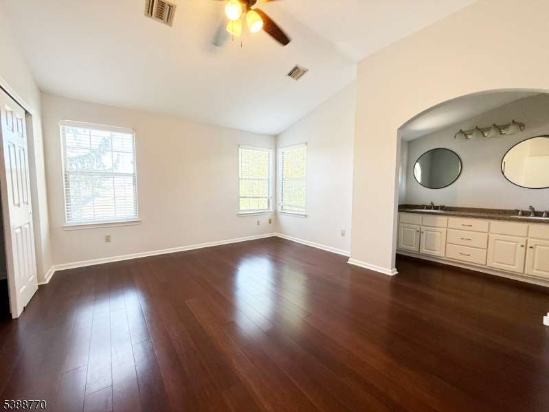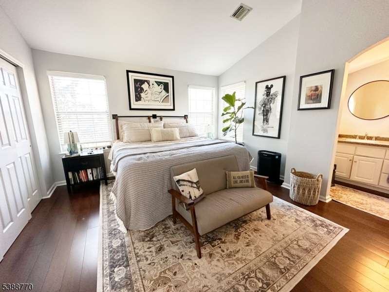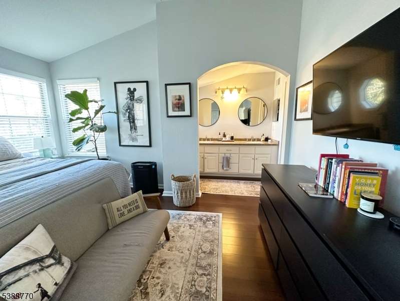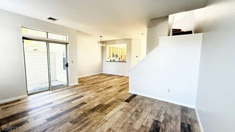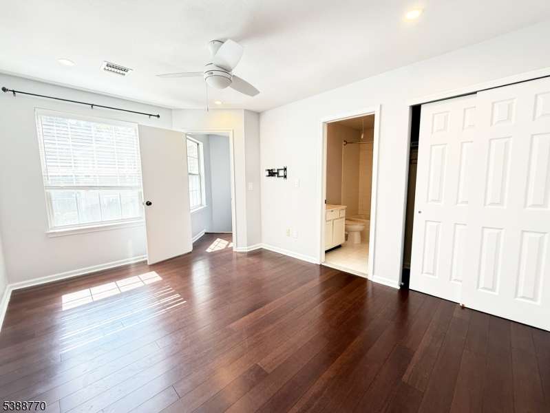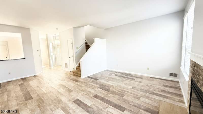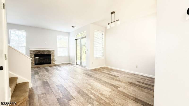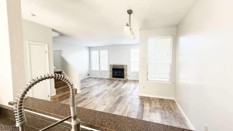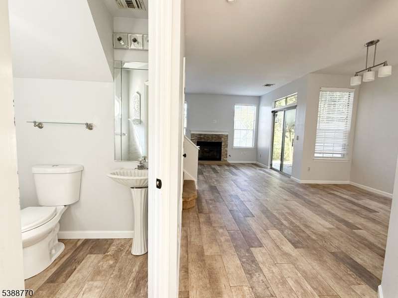 Welcome to this surprisingly sunny interior unit townhome in the desirable Wood Duck Pond enclave. A freshly painted open floor plan awaits.9ft ceilings and large windows add to the airy feeling in this 2nd largest E model. Spacious EIK boasts stainless steel appliances, granite counters, pantry and direct access to the garage. The cabinetry blends beautifully with the low maintenance porcelain tile flooring which resembles reclaimed wood, unifying the entire 1st(ground) level. A Gas fireplace, sliders to the private patio and custom wide, wood-slat blinds complete this level. Travel upstairs to the Primary and 2nd bedrooms each with their own ensuite, more wooden blinds, engineered wood floors and conveniently located laundry. Newer(2021) HVAC system adds to your comfort. If you choose Verizon as your cable/internet provider, please have the company use the special exterior outlet installed by the HOA to avoid damaging the newer siding and roof(2023).