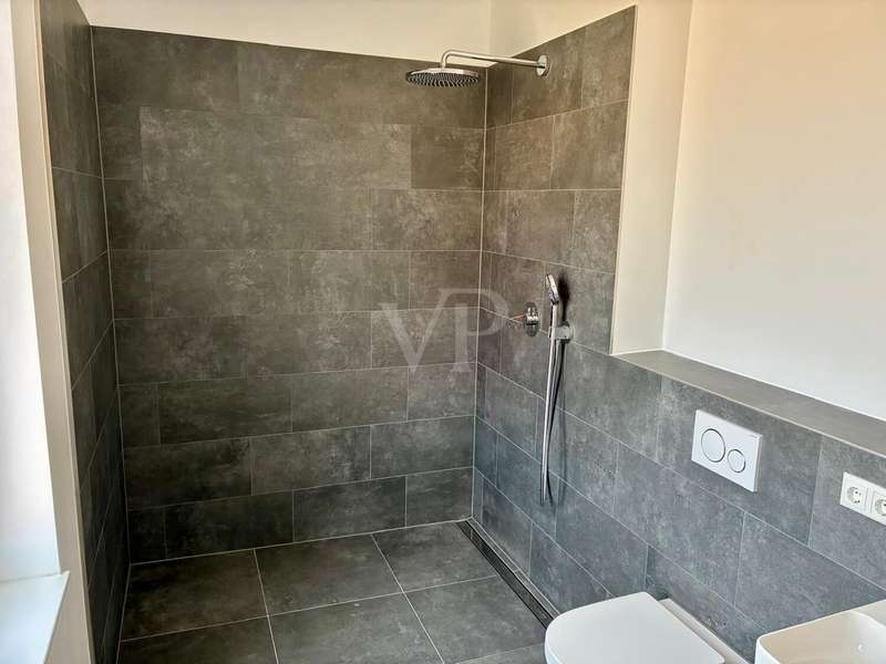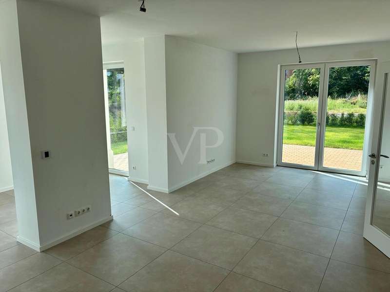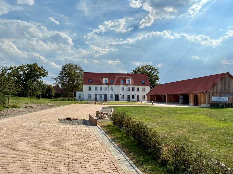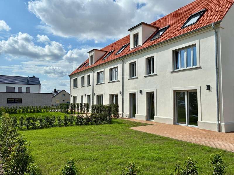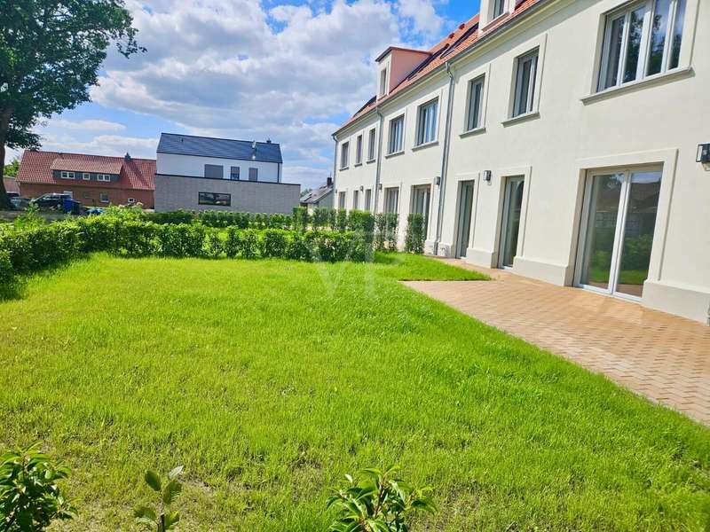 Welcome to your new home! This exceptional terraced house, which is available for you as a first-time occupancy, is currently in the final construction phase; you will be able to move in from July. The lovingly and carefully planned and well thought-out house offers maximum living comfort, efficiency and a particularly cozy feeling of living in an innovative way. Thanks to the unusual manor-style design, which blends harmoniously into the picturesque surroundings, and the high-quality workmanship, the property will appeal to anyone who values that special feel-good factor. The terraced houses are heated by an air heat pump and are equipped with underfloor heating, which ensures particularly pleasant warmth on cold days. Inside, you will find an open-plan living, dining and cooking area, which forms the heart of the residential unit. A video intercom system ensures security and communication. In addition, the house is equipped with a fiber optic internet connection, which includes network connections (CAT 7) in all living areas, ensuring fast and stable internet connections. The living area gives you access to your beautiful terrace and private garden. Here you can enjoy contemplative hours outdoors or simply relax and unwind. The property also includes an additional storage room for each residential unit. A spacious, 290 cm wide garage parking space can be rented separately for €50/month. Electromobility has also been taken into account: A connection for a charging station/wallbox is available for each garage parking space. Additional car parking spaces on the approx. 10,000 m² plot and a general bicycle storage room round off the offer. This property offers modern living comfort at a high level and combines functionality with attractive and harmonious architecture. This house is ideal for you... ... if you value quality and a house with a special feel-good factor. ... if you want the quality of life of a village environment and yet a central location. ... if you are looking for a special place for you and your loved ones to feel at home.