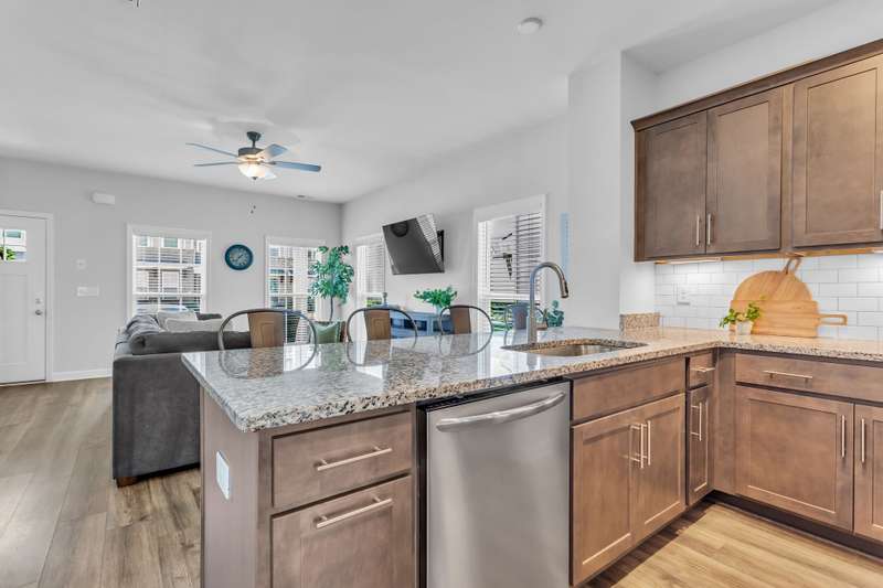 Welcome home to this bright and spacious end-unit townhome featuring a flexible open-concept layout designed for modern living. Nestled against a private, tree-lined green space, this home offers rare backyard privacy and a peaceful view. Inside, you'll find a light-filled living room and kitchen with large windows and eat-in peninsula--perfect for casual dining or entertaining. The kitchen offers generous cabinetry, a large pantry, and plenty of counter space to meet all your culinary needs. A versatile flex space off the kitchen can be used as a home office, dining room, or playroom.