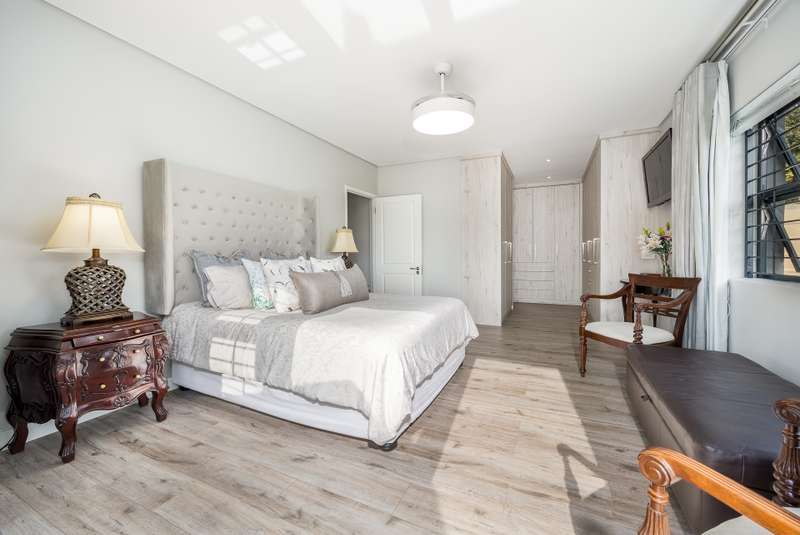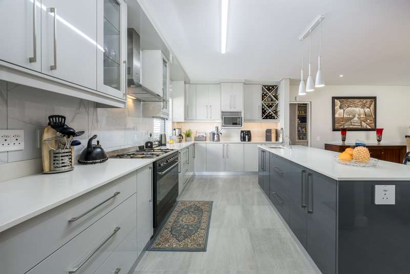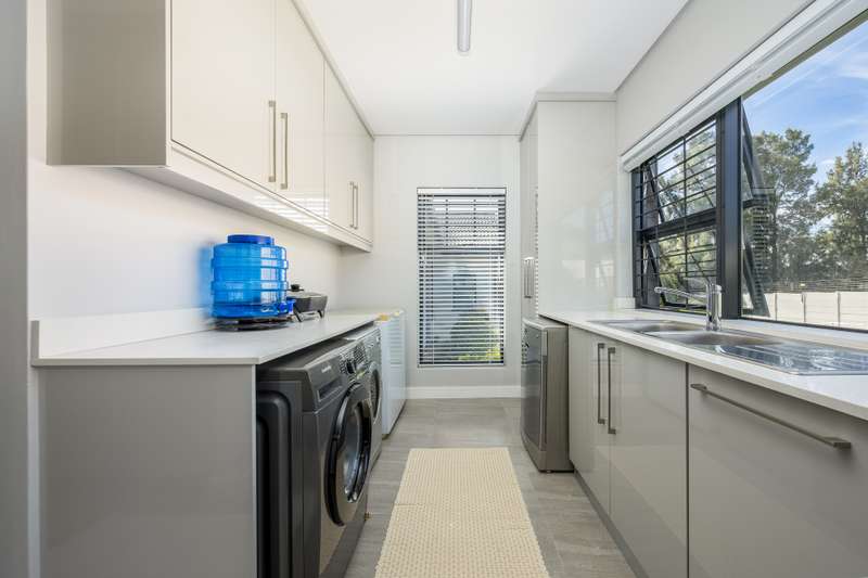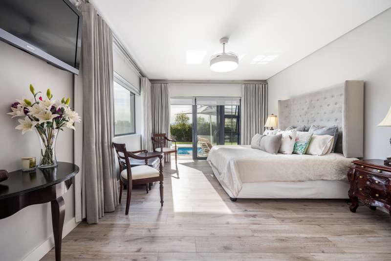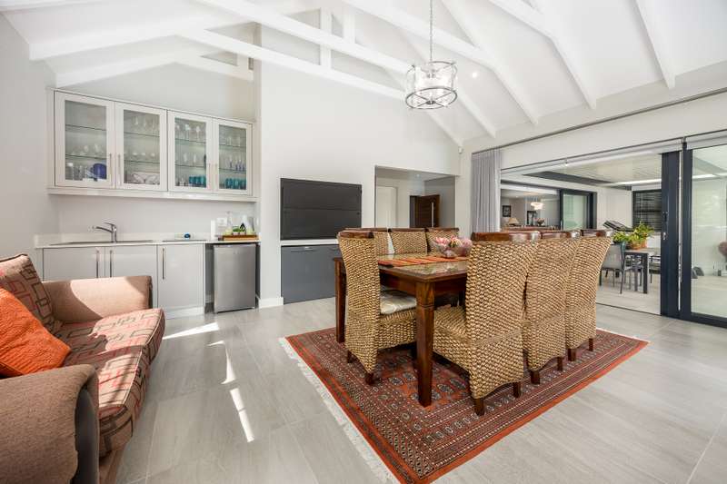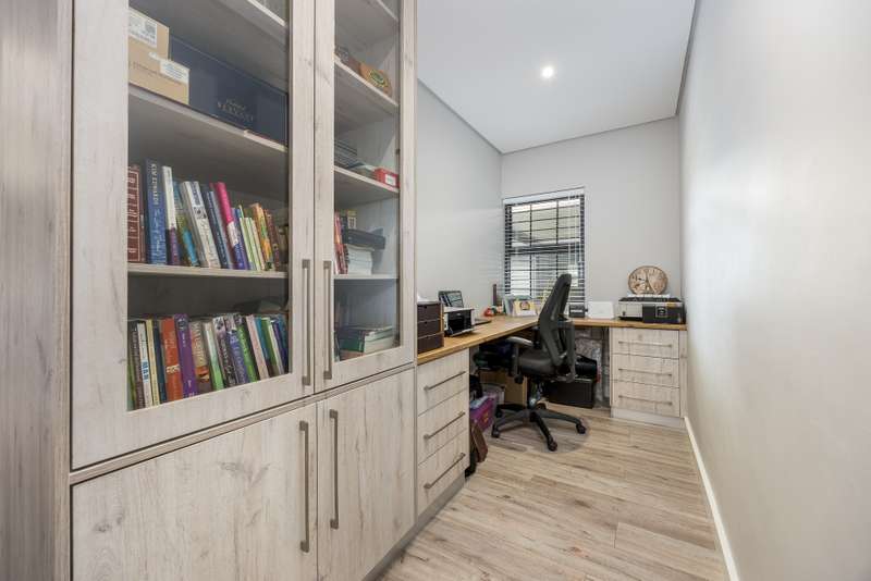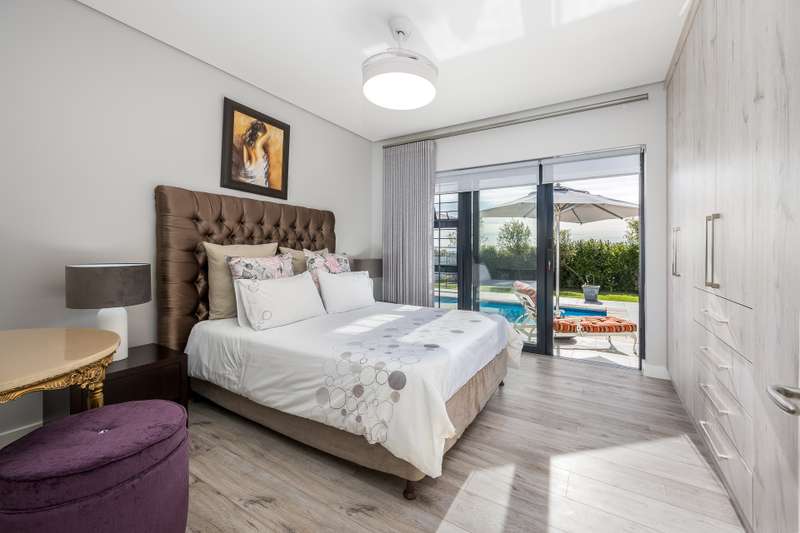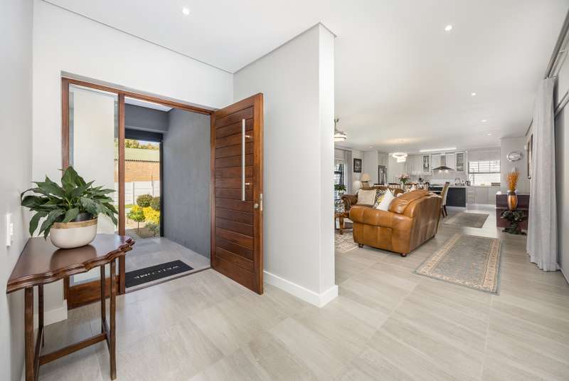 Step into comfort and style with this stunning modern home, ideally located in a small, secure gated community. Designed for both everyday living and effortless entertaining, this property truly offers it all. From the moment you enter, you'll be captivated by the abundance of natural light and the spacious open-plan layout. The heart of the home features a generous braai room that flows seamlessly to a covered patio—perfect for year-round entertaining. The modern kitchen, dining area, and family lounge also open out to the patio and sparkling pool area, creating a seamless indoor-outdoor living experience. The large scullery provides ample space for all your appliances, keeping the main kitchen clutter-free and functional. A private passage leads to four well-sized bedrooms. The guest bedroom includes its own en-suite, while two additional bedrooms share a full family bathroom. The luxurious main suite offers a full en-suite bathroom complete with double vanity. Three of the bedrooms open onto the garden and pool area via sliding doors, offering a tranquil retreat. Included: alarm system, beams, burglar bar, garden shed, beautiful curtains and blinds.