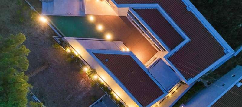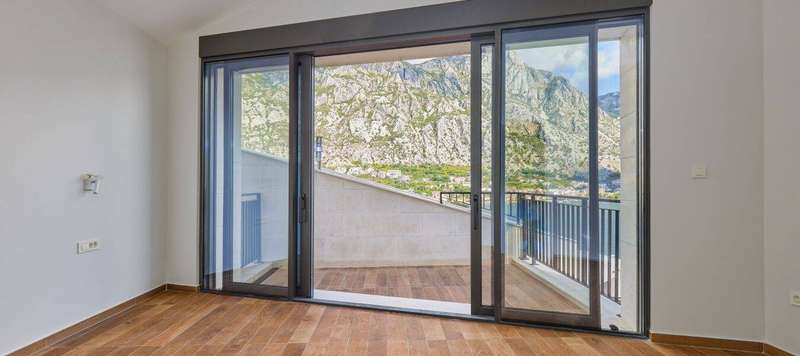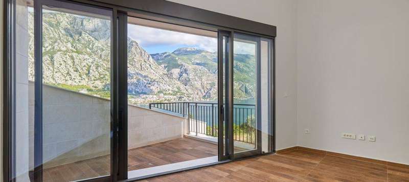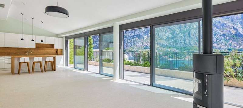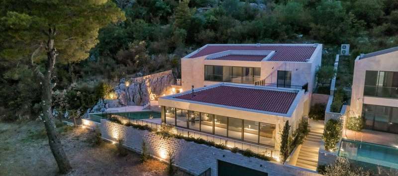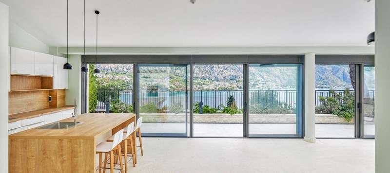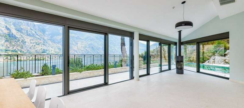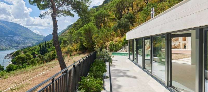 The villa design is sleek, with clean lines and open, spacious interiors. Mediterranean limestone walls and characteristic sloping terracotta roof tiles float above floor-to-ceiling glass windows to maximize natural light and unobstructed, dramatic views across the Bay towards Kotor Old Town and the mountains beyond.