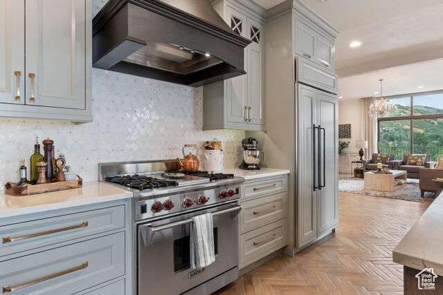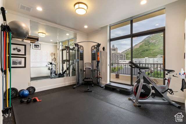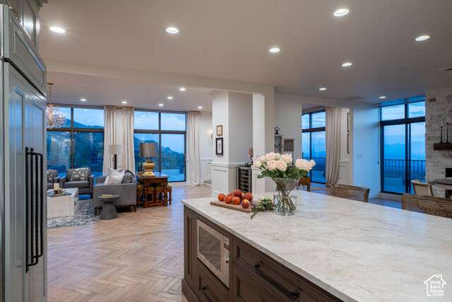 Timeless. Inviting. Functional. Elegant. Set high above the city with park, mountain, and skyline views, this extraordinary penthouse combines classic design, elevated comfort, and cosmopolitan ease. From the marble-inlaid foyer to the floor-to-ceiling windows, every detail reflects thoughtful craftsmanship and enduring style. The living and dining spaces are wrapped in glass, immersing you in Utah's natural beauty. Crisp architectural lines, warm wood finishes, and artful lighting fixtures establish a refined yet welcoming tone. At the heart of the home, the kitchen balances sculptural beauty with exceptional function: custom cabinetry, a rift-cut white oak island topped with leathered Taj Mahal quartzite, and seamlessly integrated Wolf and Sub-Zero appliances. Gold-tone hardware and hand-forged refrigerator handles bring artisan character into daily use, while a luminous marble backsplash glimmers like a constellation. Private spaces are equally considered. A den, tucked behind 18th-century carved Balinese doors, offers intimacy and character. The primary suite is a true retreat, with glass walls framing mountains, lake, and city lights. A fireside sitting area, spa-inspired marble bath, and dual, cedar-lined walk-in closets complete the sanctuary. This is more than a home, it's a mountain-framed haven where every hour reveals something beautiful anew.