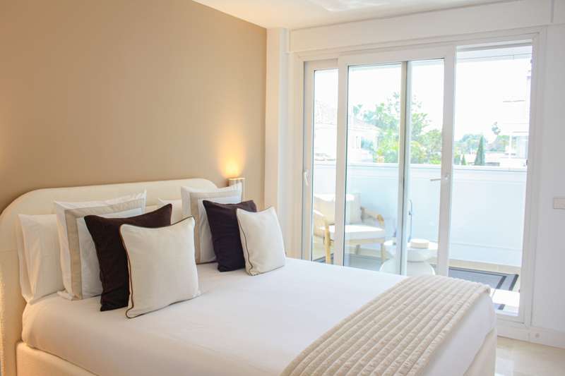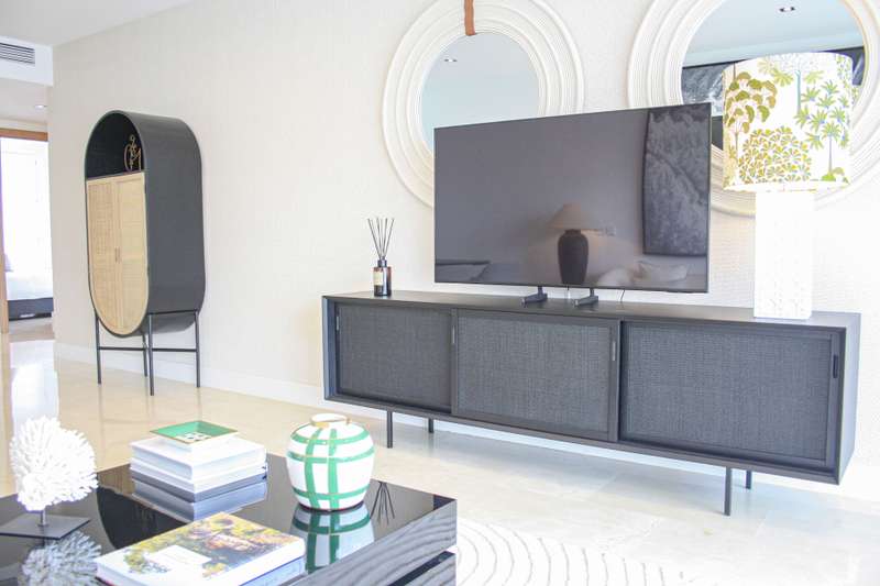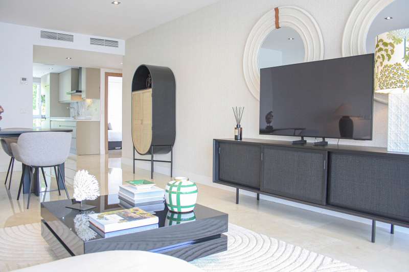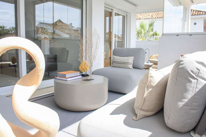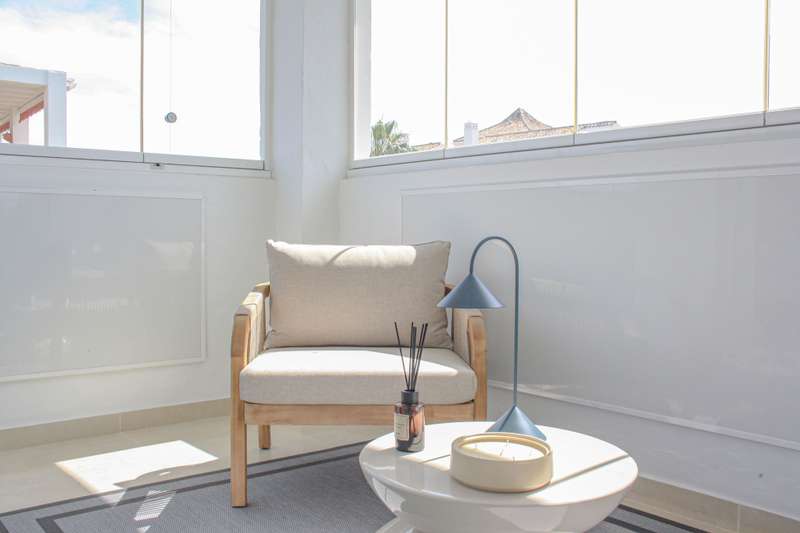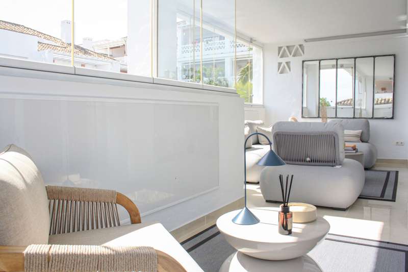 Located on Marbella’s prestigious Golden Mile, this refined apartment in Las Cañas Beach perfectly balances timeless elegance with the comfort of a true home. Recently renovated and thoughtfully furnished with premium materials, it’s offered exactly as it is: pristine, tastefully designed, and ready for immediate enjoyment. Spanning 110 m², the layout includes two generously sized bedrooms and two bathrooms — with the master suite offering added privacy and comfort. Wake up to partial sea views from the second bedroom, a daily reminder of the unique setting. The 20 m² terrace, enclosed with glass curtains, seamlessly extends the living space and offers year-round enjoyment of the lush gardens, serene pool, and glimpses of the Mediterranean. Luxury finishes such as marble floors, air conditioning, electric shutters, and a comprehensive security system — including 24-hour surveillance — provide a sense of effortless comfort and safety. The apartment also comes with its own private park