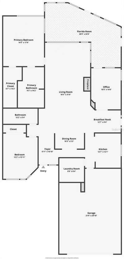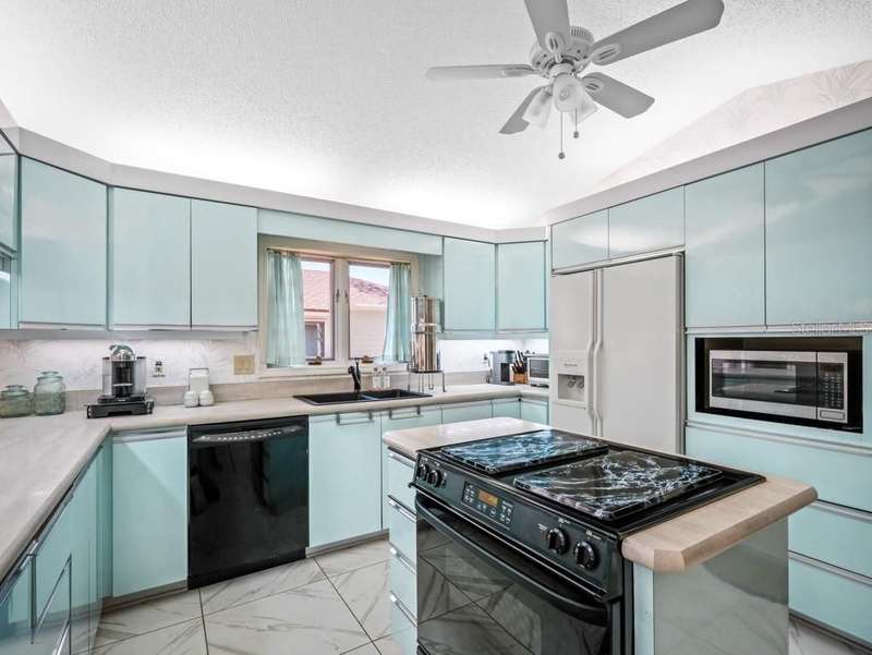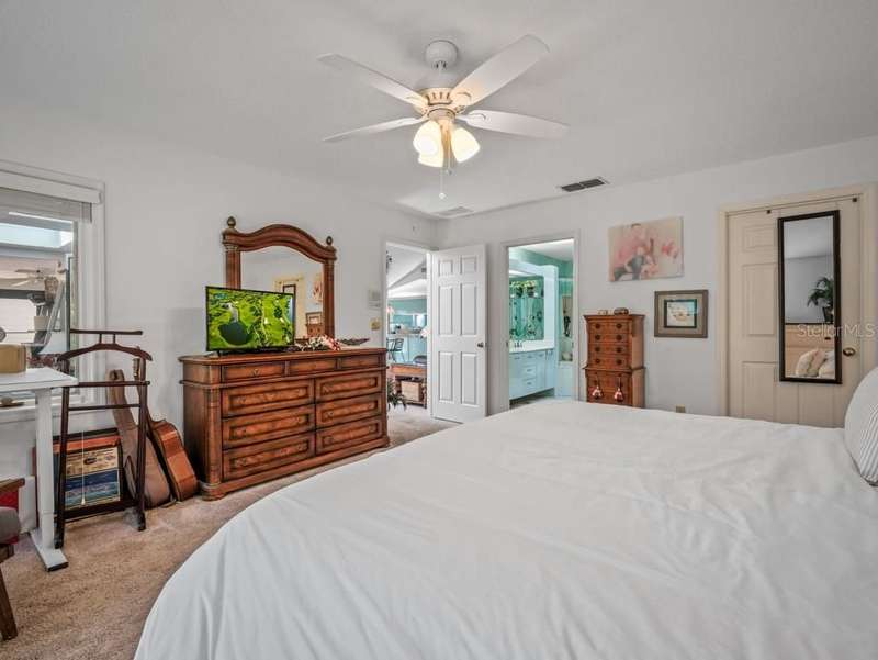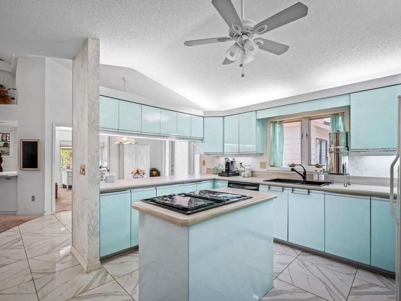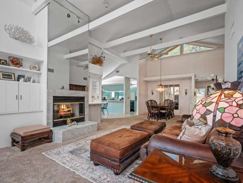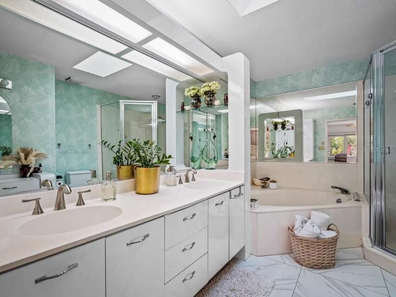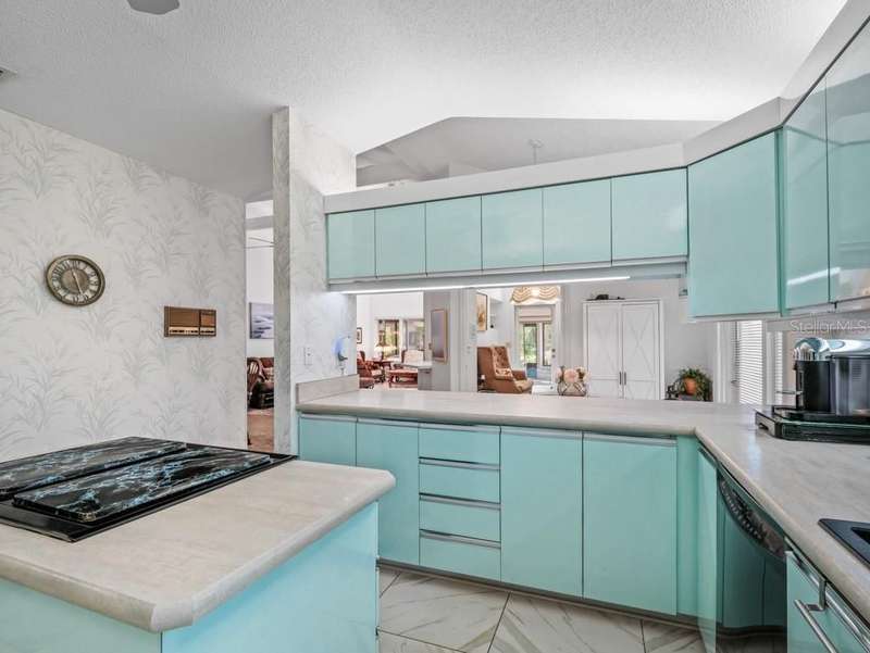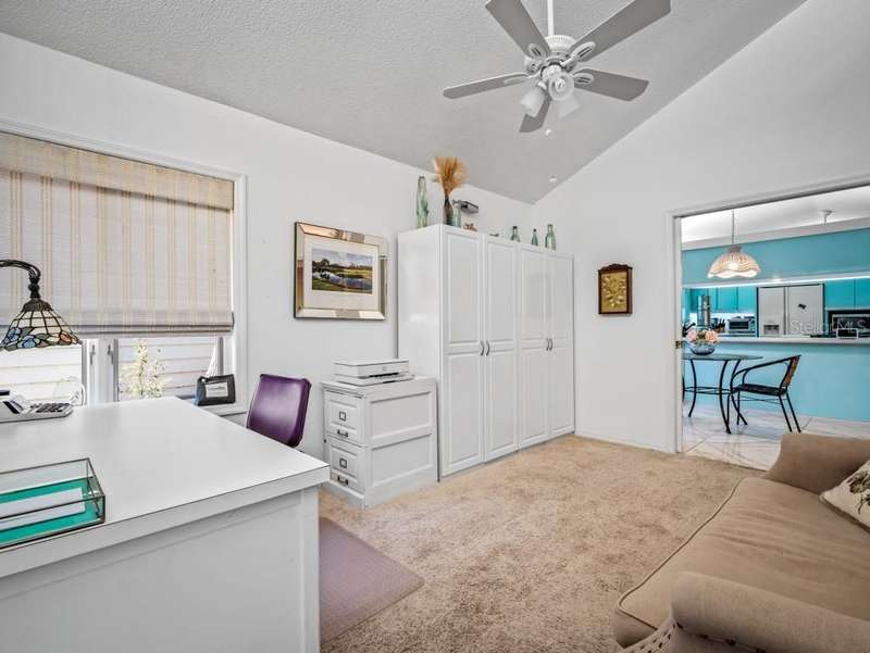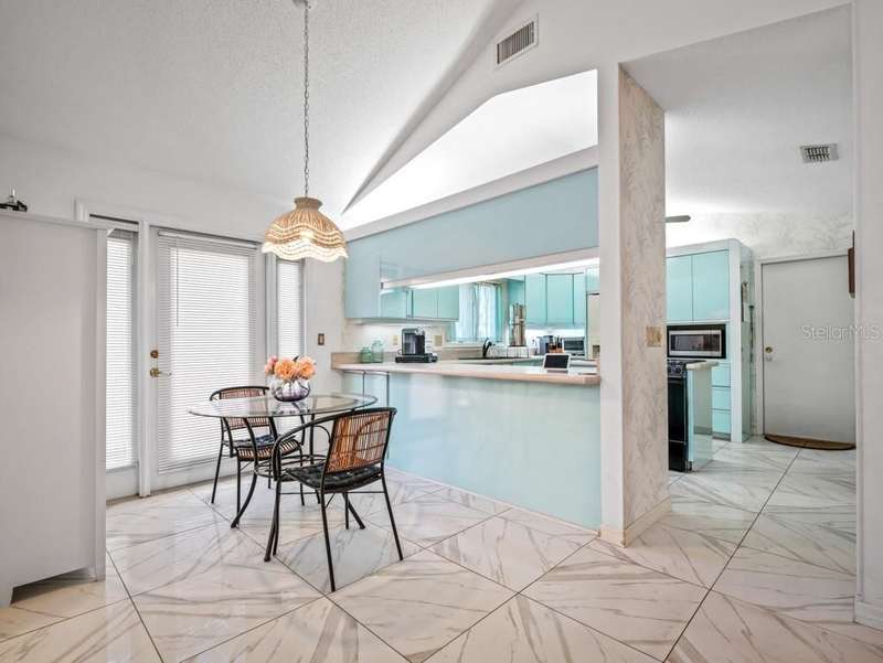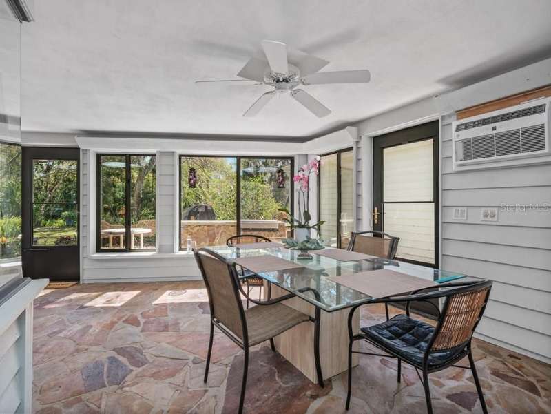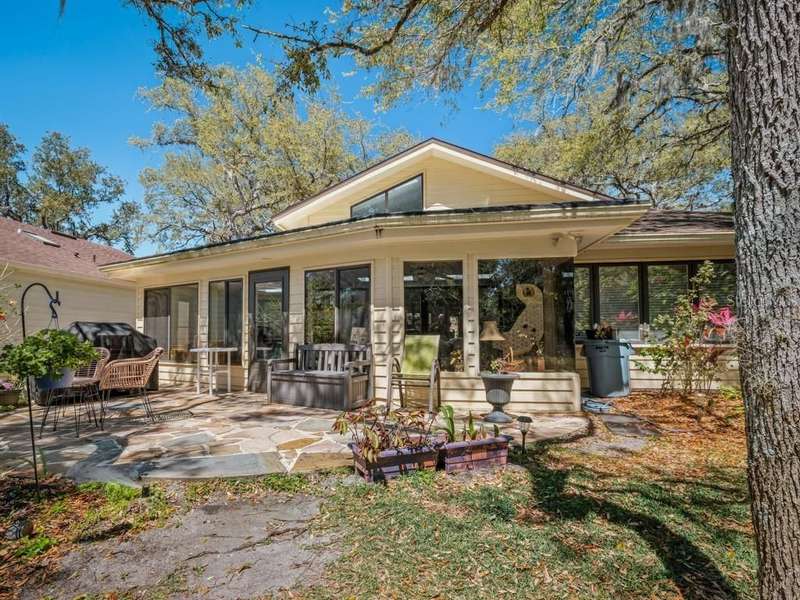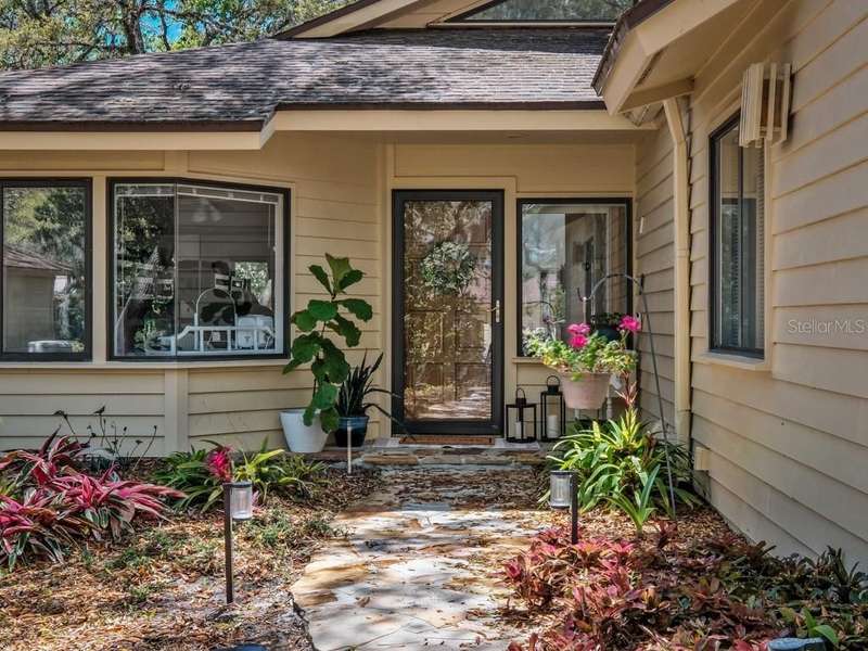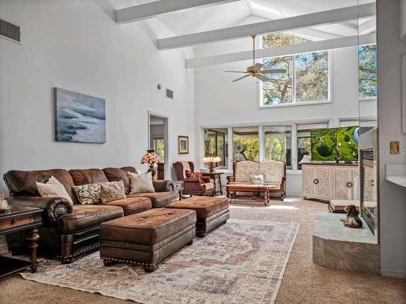 Welcome to this beautifully maintained 2-bedroom, 2-bathroom home located in the sought-after St. Andrew neighborhood, part of the exclusive Sugar Mill Country Club community. This light-filled residence offers a thoughtful split floor plan designed for comfort and privacy.Step inside to find soaring vaulted ceilings, creating an airy, open ambiance. A cozy fireplace and built-in wet bar add character to the spacious living area-perfect for entertaining or quiet evenings at home. The kitchen includes a charming breakfast nook, ideal for morning coffee. The versatile Florida room features a unique stone floor that brings the outdoors in. Step outside to enjoy the serene stone patio, perfect for dining al fresco or simply soaking in the Florida sunshine. A dedicated office space provides flexibility for remote work or hobbies. The primary suite is a relaxing retreat, while the guest bedroom and second bath are perfectly positioned for privacy. With large windows throughout, this home is bathed in natural light and surrounded by the lush, tranquil backyard. Enjoy the lifestyle that comes with this gated community, just minutes from beaches, shopping, and dining. St Andrews features it's own community pool and separate gate from the main entrance. Sugar Mill Country Club amenities available through private membership. HVAC 2014, water heater 2022