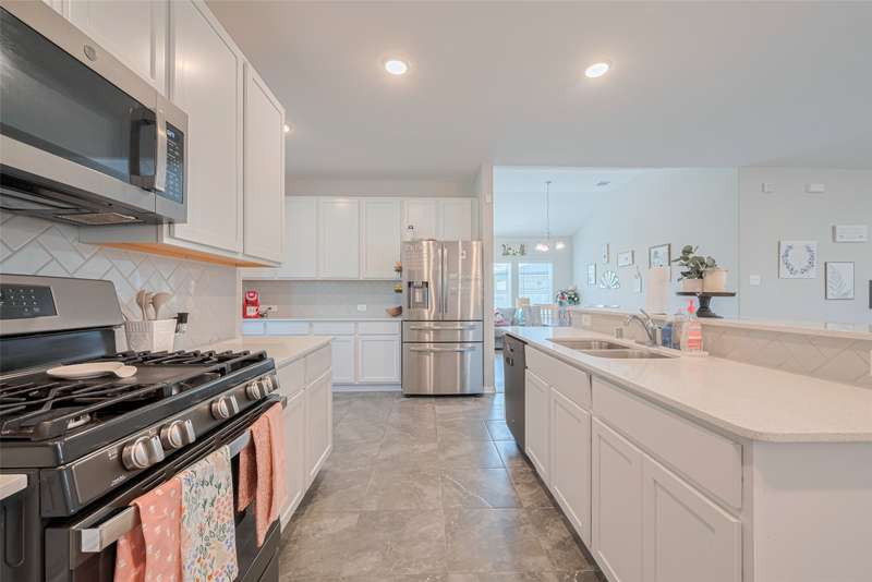Prepare to be awed... imagine, enjoying your private back patio that leads to a sprawling back yard sans back neighbors; yes no back neighbors! This beautiful open-concept Sabine floor plan features 3 bedrooms and 2 full baths. Open the door to and enter the foyer leading to the spacious living room that opens to the kitchen and breakfast room. Preparing meals in the chef's kitchen will be a delight! The owners retreat boasts a sizeable bedroom with an en-suite bathroom featuring double sinks, and a large soaking tub. Vinyl plank floors, quartz countertops, stainless steel appliances all contribute to the aesthetic; what's not to love?! oh and the flex room is a flex!! Easy access to Hwys 6 and 288. Home is zoned to Alvin ISD. It's time to see 2446 Palisade Crest in person... from the curb appeal to the backyard; it will not disappoint!!