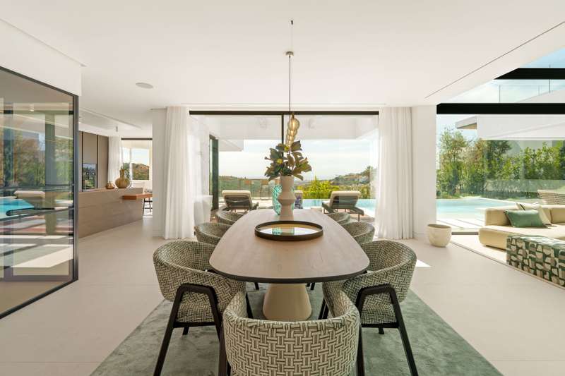 This modern six bedrooms residence situated on a 1.515 m2 plot in the gated community of Lomas de la Quinta. The property combines architectural precision with functionality, designed to maximize space, light and panoramic views across the surrounding landscape. Its elevated position ensures privacy while offering uninterrupted outlooks towards the Mediterranean and surrounding mountains. The home is structure around an open plan concept, seamlessly connecting living, dining and kitchen areas to expansive terraces. Floor to ceiling glass doors create a natural flow between indoor and outdoor spaces, enhancing the sense of light and openness. Multiple lounge and dining areas, both inside and out, make the property well suited for contemporary family living as well as entertaining. An entire level of the property is dedicated to leisure and wellness. This includes a fully equipped home gym, spa facilities and an indoor pool designed with modern finishes. A separate entertainment space