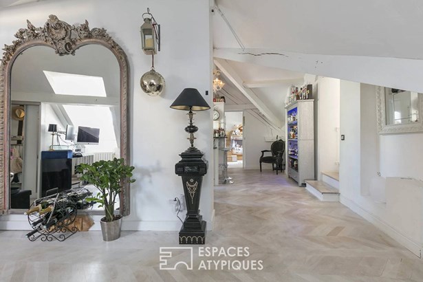 This beautiful prestigious apartment renovated with quality materials, which has a surface area of 94 sqm Carrez, 170 sqm on the ground, is located on the top floor of a very beautiful private mansion located at the foot of the Chateau de Saint Germain en Laye. The common part of the building offers a superb three-story old staircase, made of old wood, tiles and ironwork.