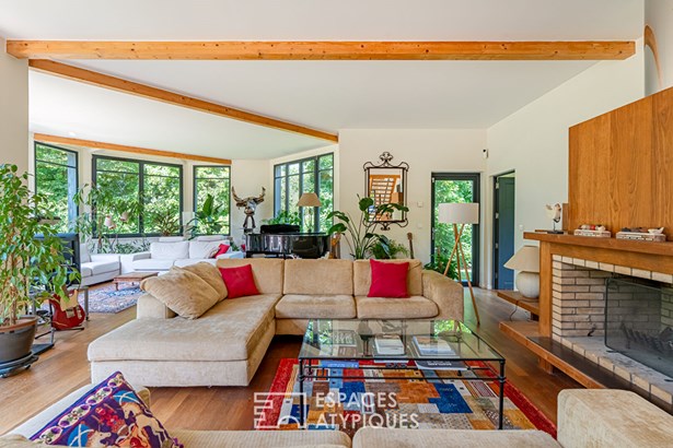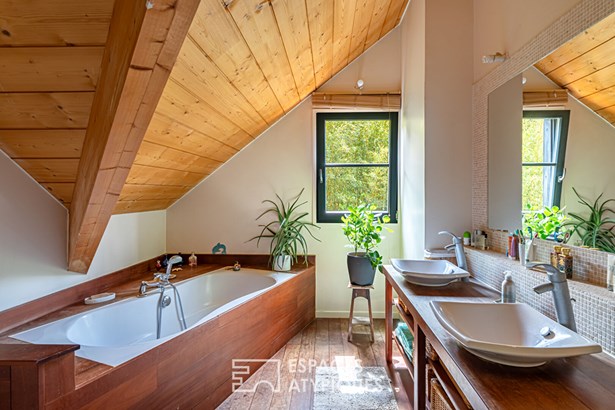 This 280 sqm architect-designed house, with a 120 sqm basement, offers, from the entrance to the 1900 sqm property, a comforting view of a pretty, unoverlooked landscaped garden. A little further on, a flamboyant building with red cedar cladding extends along its entire length into a warm wooden terrace. The unique contours of the construction make it a unique property, an exceptional property with an authentic feel. With large bay windows opening onto the garden, the house radiates light from the moment you cross the threshold. A living space then emerges, fluid, harmonious, and generous. The 31sqm bay window kitchen, discreetly set back but open to the living space, allows you to share meals in a bucolic and spacious setting.