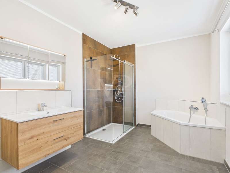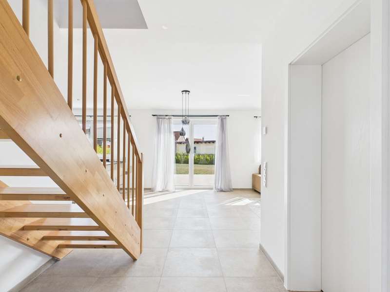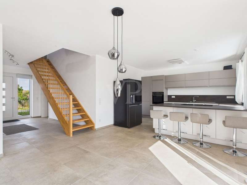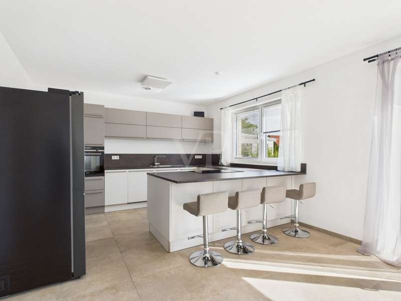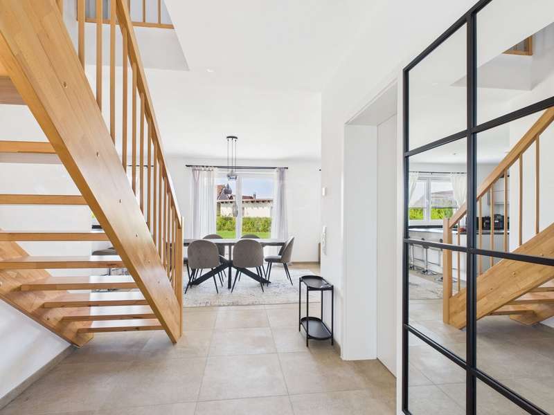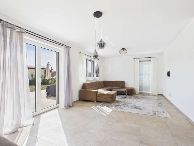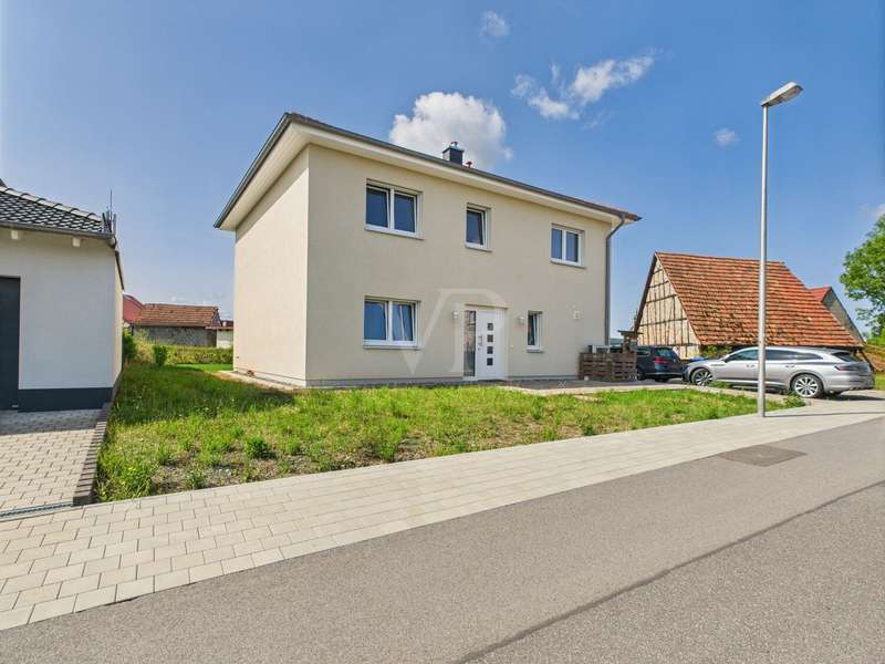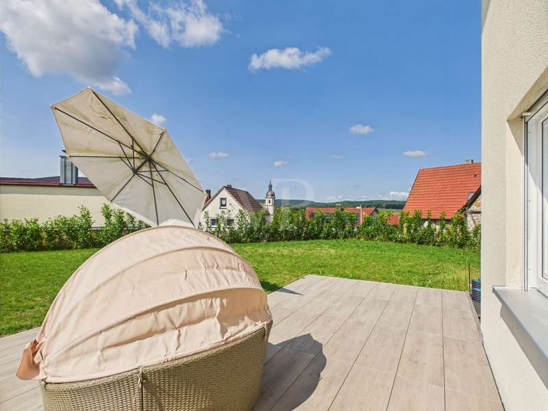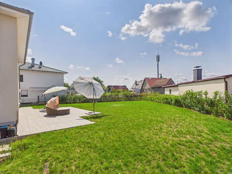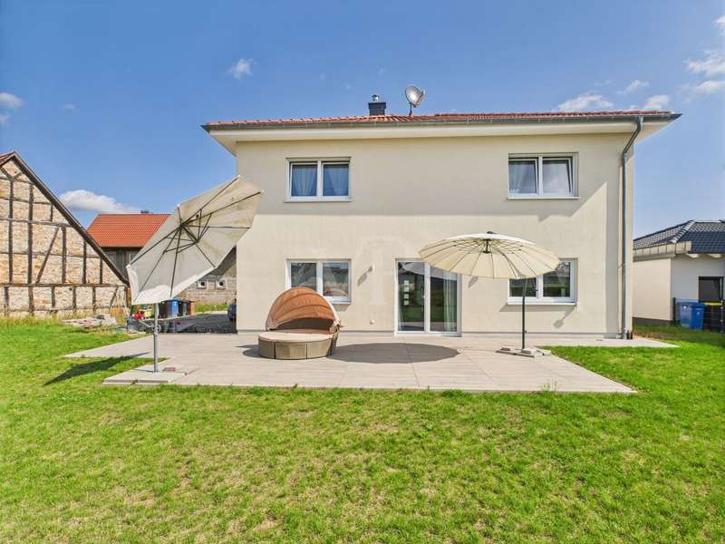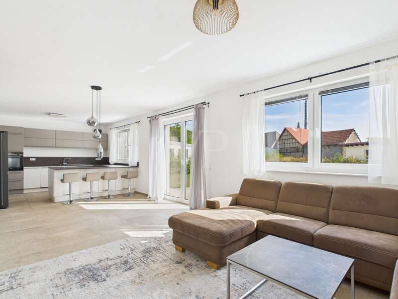 In the midst of an idyllic rural setting, this modern detached house is a real feel-good home for families or couples who need space. The energy-saving house (KfW 55+), built in 2022, combines modern architecture, energy-efficient building technology and high-quality fittings to create a harmonious overall picture. Thanks to the immediate occupancy, you can move in and enjoy your new home without having to wait. The living space is generously and thoughtfully distributed: A total of four bedrooms provide ample space for family, guests or a home office. The bathroom impresses with an oversized shower, a bathtub and modern fittings that underline the demand for stylish living. The open-plan living area with plenty of natural light creates a pleasant atmosphere. The bright living room flows seamlessly into the dining area and opens up to the modern, well-equipped kitchen - ideal for cooking, enjoying and socializing together. From here, you have direct access to the spacious sun terrace and the garden, which invites you to relax, play and linger. It also offers enough space for a private pool. The house is in an extremely quiet location, surrounded by nature, yet offers good connections to the surrounding infrastructure. There are parking spaces right next to the house and an existing building permit for a double garage opens up additional possibilities. This house combines modern living comfort, energy efficiency and rural quality of life - perfect for anyone looking for a high-quality, immediately available home in peaceful surroundings. Have we piqued your interest? Then please contact us on 0172-4133278 or send us a written inquiry.