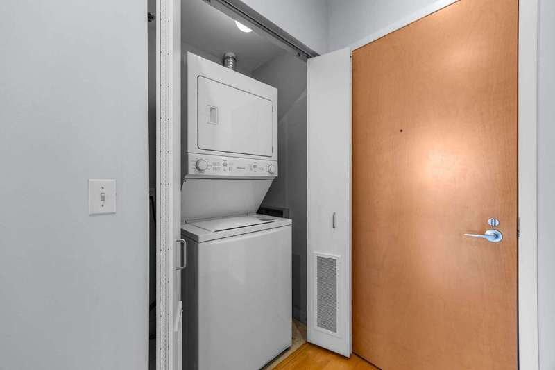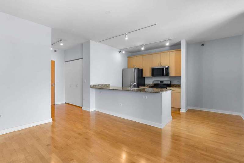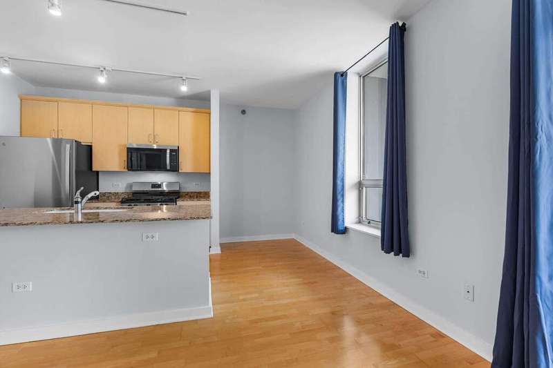 Spacious 1 bed/1 bath condo in prime River North featuring unobstructed west-facing views and an oversized balcony! Open floor plan with floor-to-ceiling windows and hardwood floors. Kitchen features stainless steel appliances, granite countertops, wood cabinetry, and flexible nook for dining or office space. Shower/tub combo and generous vanity with storage. In-unit washer/dryer, ample closet space, and separate storage locker included. Full-amenity, pet-friendly building with 24-hr door staff, fitness center, business center, and receiving room. Investor-friendly-no rental cap! Deeded garage parking space additional $30K. Steps to EL, expressway, Riverwalk, dog parks, shopping, dining & nightlife.