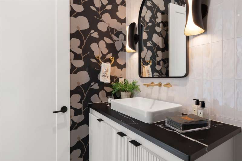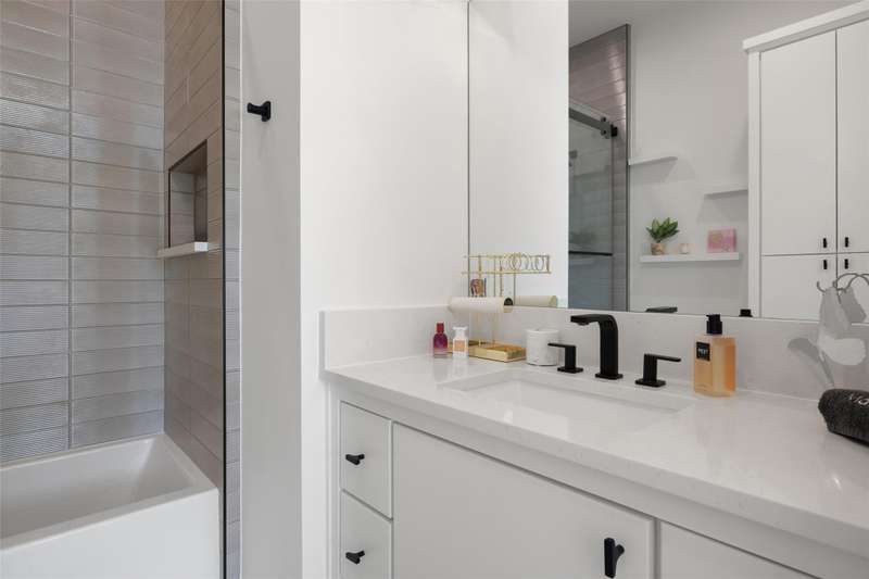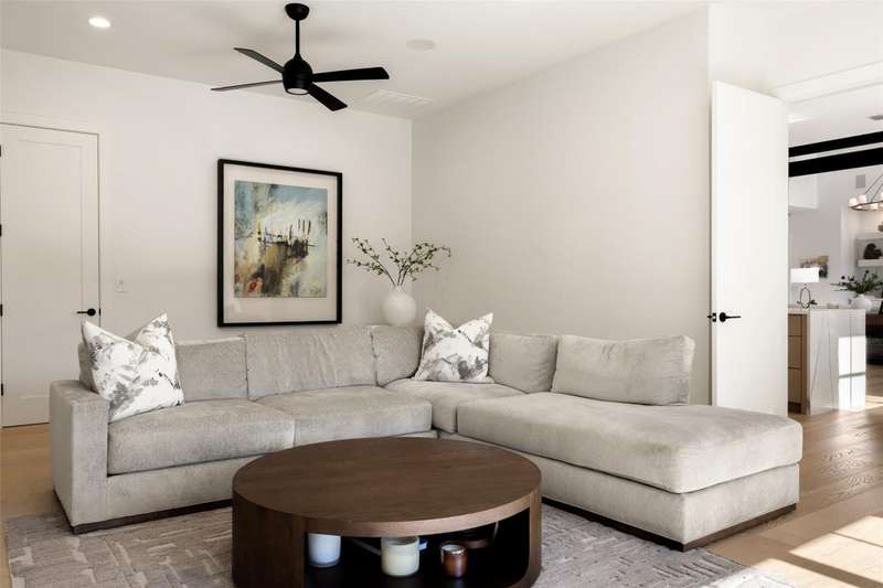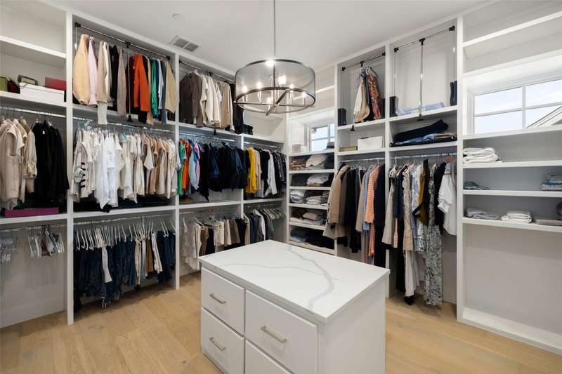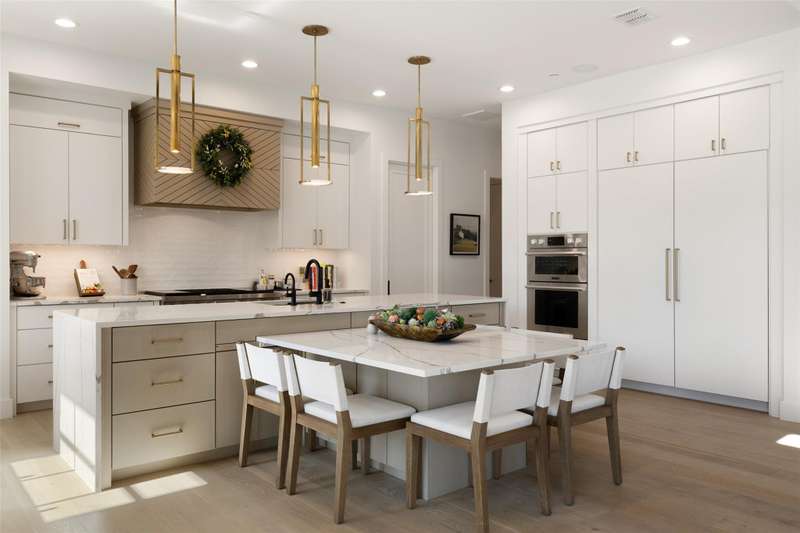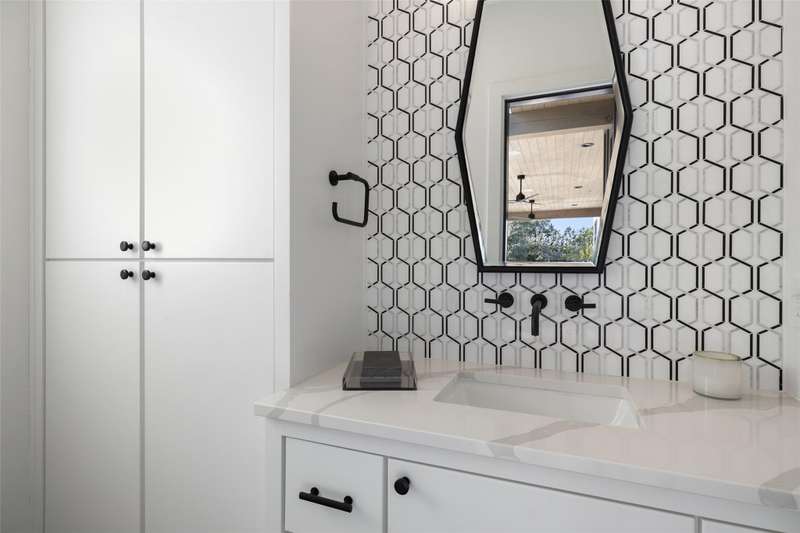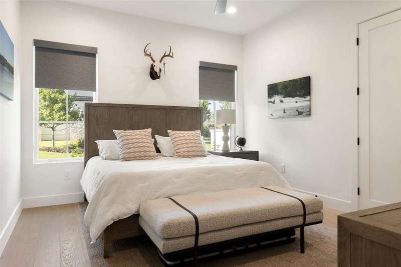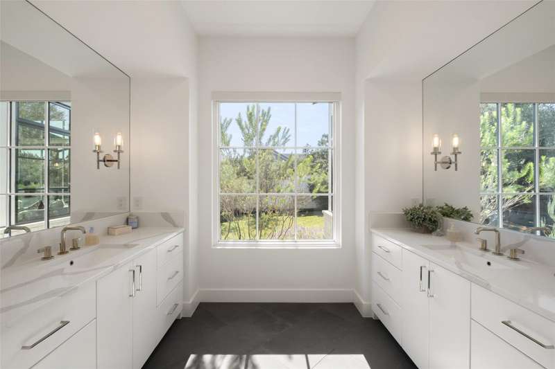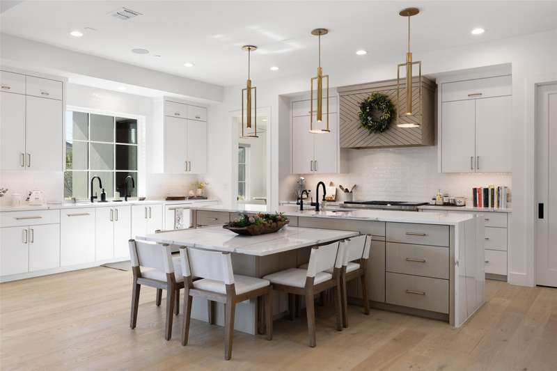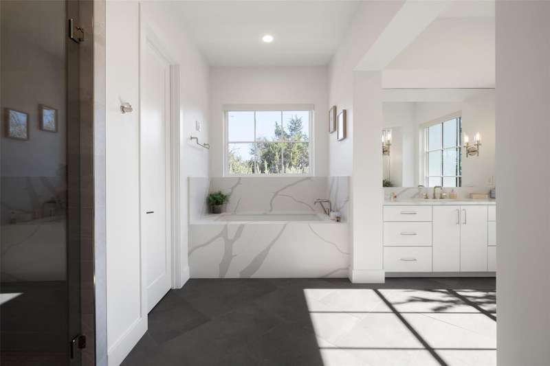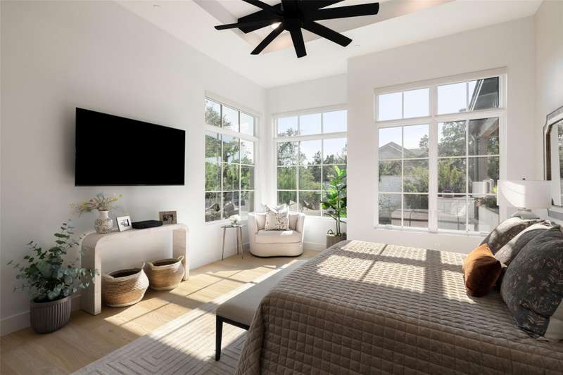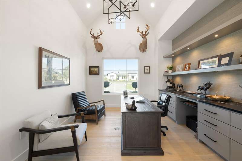 Designed for both comfort and flexibility, the home includes four spacious bedrooms each with its own en-suite bath, plus two separate offices, a dedicated pool bath, and a well-appointed four-car garage. The primary suite is a private retreat, featuring serene backyard views, a spa-style bath with a deep soaking tub, oversized walk-in shower, dual vanities, and a beautifully customized closet. Every detail inside has been intentionally selected, from the ambient lighting and wallpaper accents to the automated window shades and bespoke hardware.