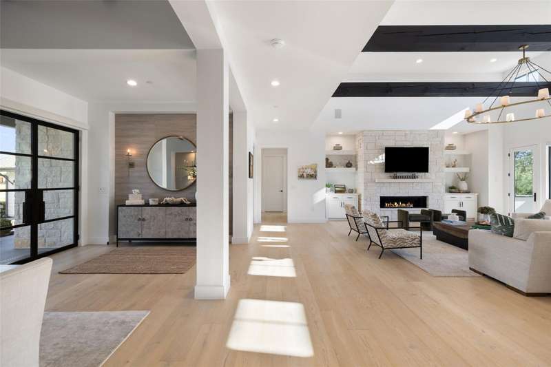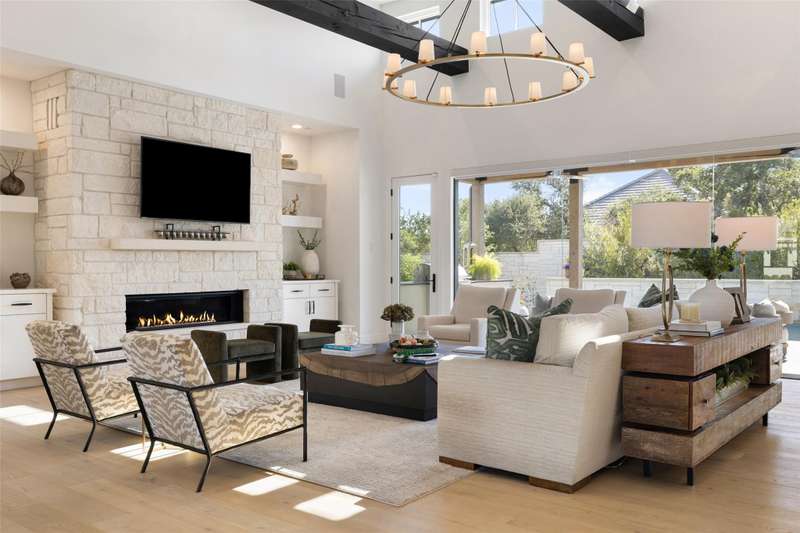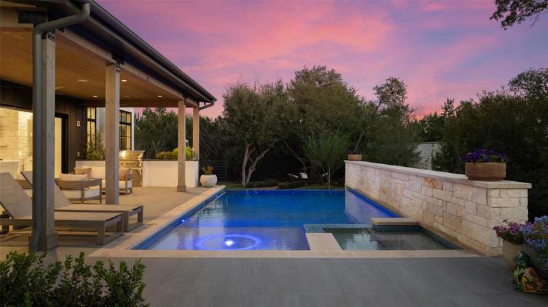 Out back, a resort-style pool and spa with a negative edge and waterfall feature become the centerpiece of the landscape, surrounded by a large covered patio, raised garden beds, and open lawn shaded by mature oaks. With its calm, elegant style and a layout that blends functionality with ease, 17213 Morning Grove Lane offers refined Hill Country living just minutes from everyday conveniences in both Bee Cave and Lakeway along with top-rated Lake Travis schools.